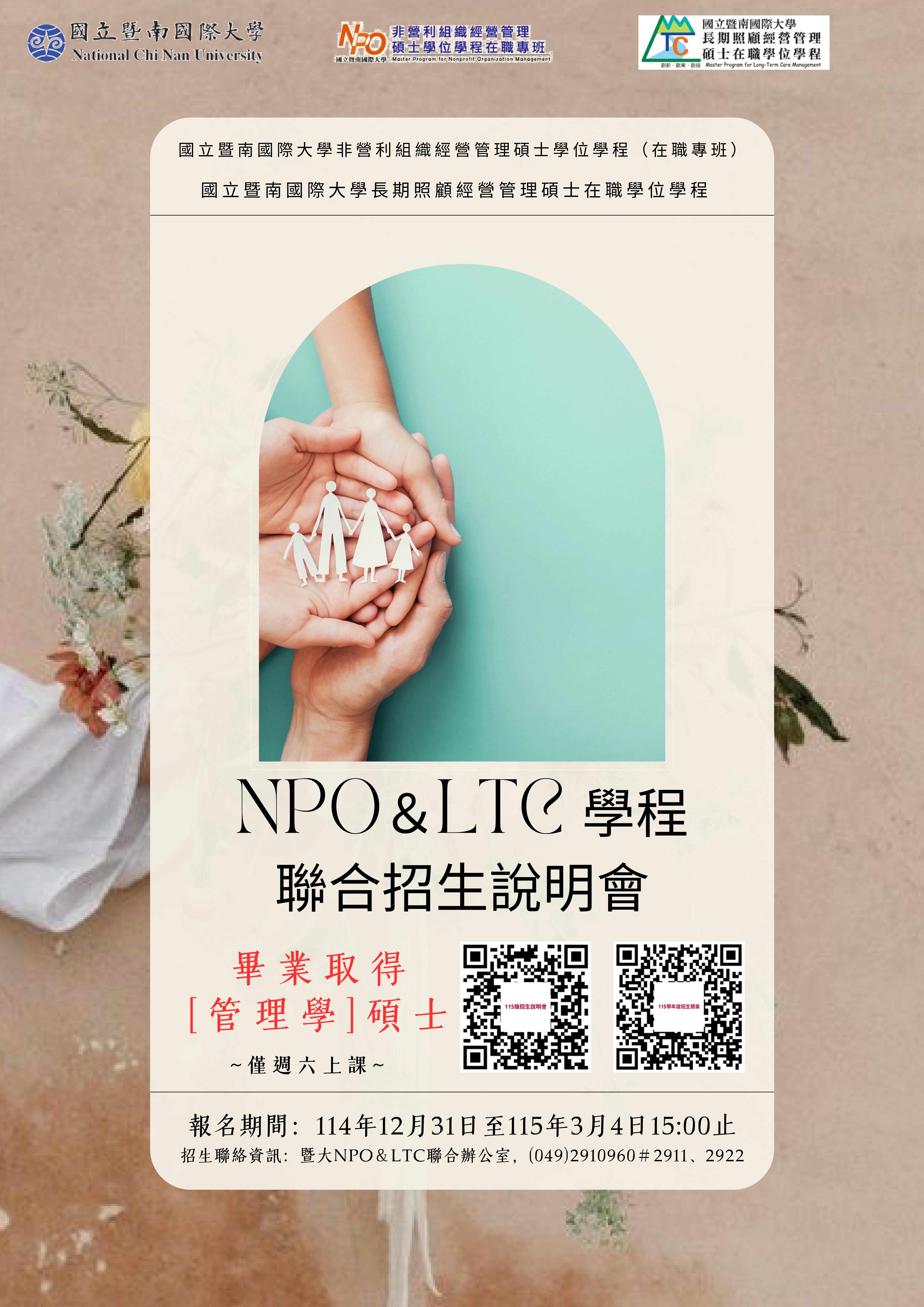 國立暨南國際大學115學年度非營利組織經營管理碩士學位學程與 長期照顧經營管理碩士在職學位學程招生