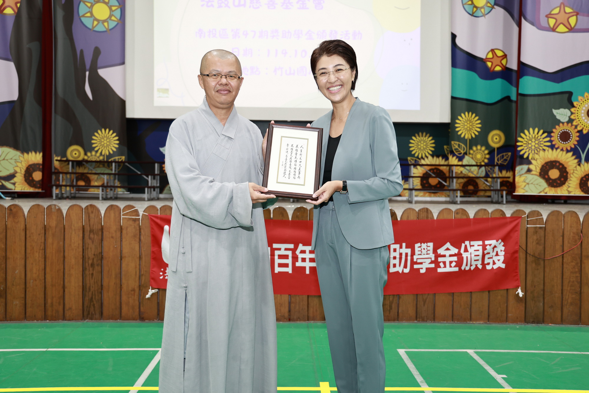 財團法人法鼓山慈善基金會10月18日上午在竹山國小舉行法鼓山百年樹人獎助學金頒發活動,共有濁水溪線學校近百位學子到場領獎,縣長許淑華出席頒發感謝狀,由法鼓山慈善基金會秘書長常惺法師代表接受,許縣長特別感謝法鼓山基金會從921地震後就長期捐助本縣弱勢和偏鄉學生,讓孩子能感受到社會溫暖與善念,在學習路上無後顧之憂。