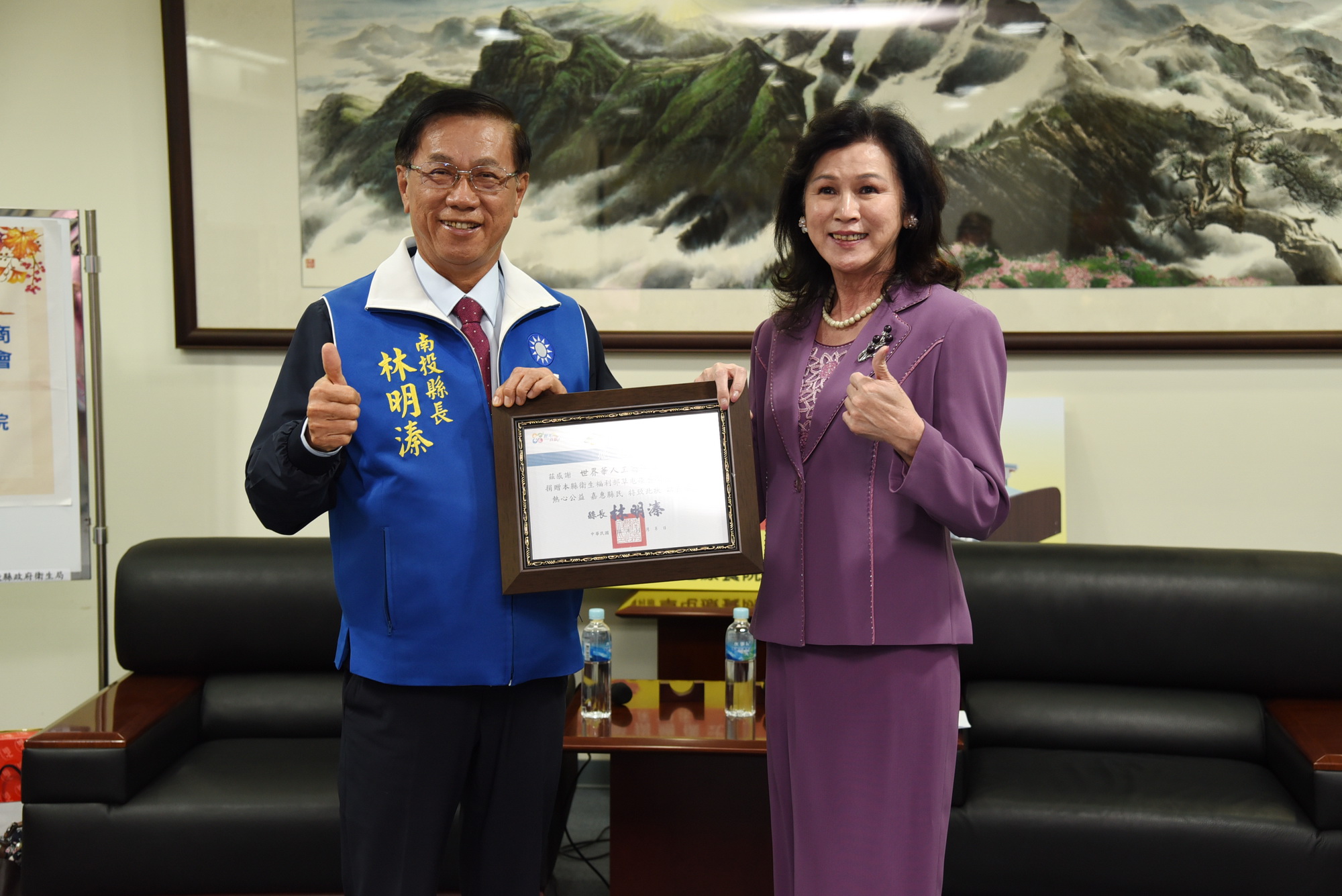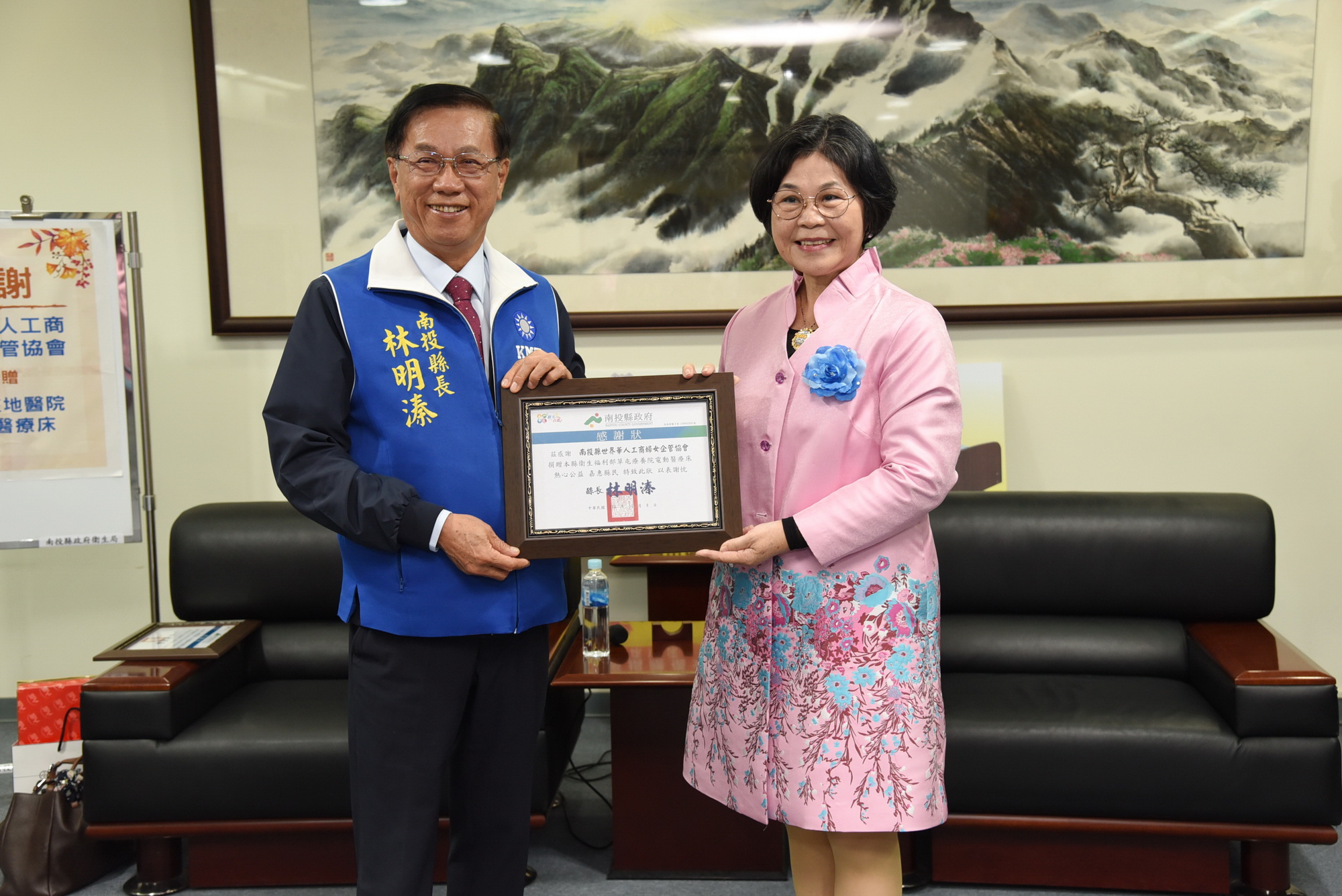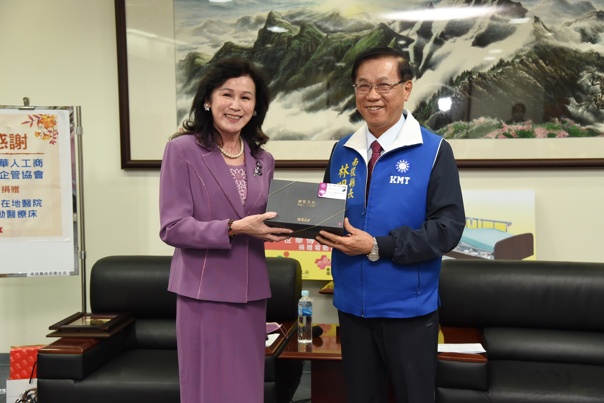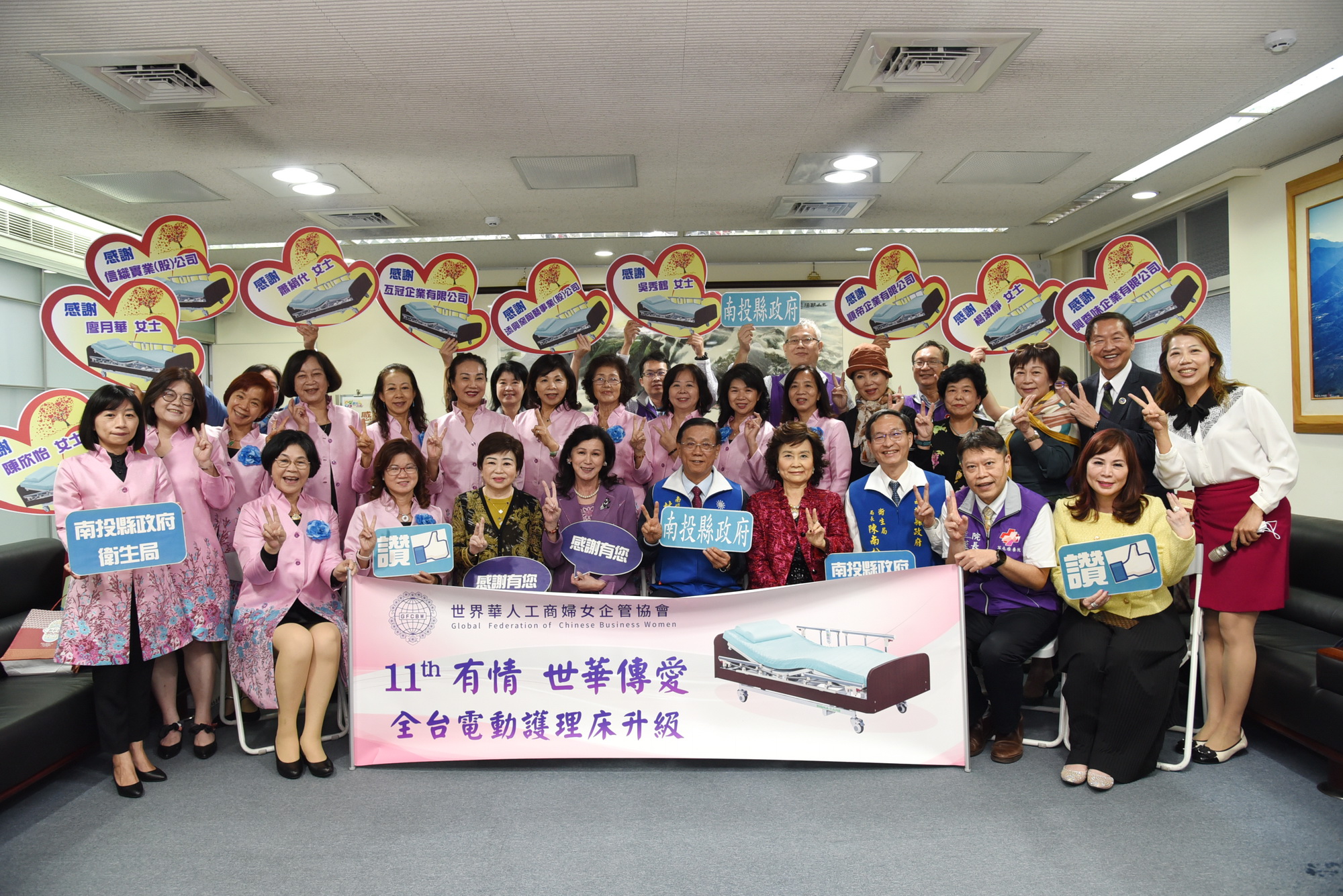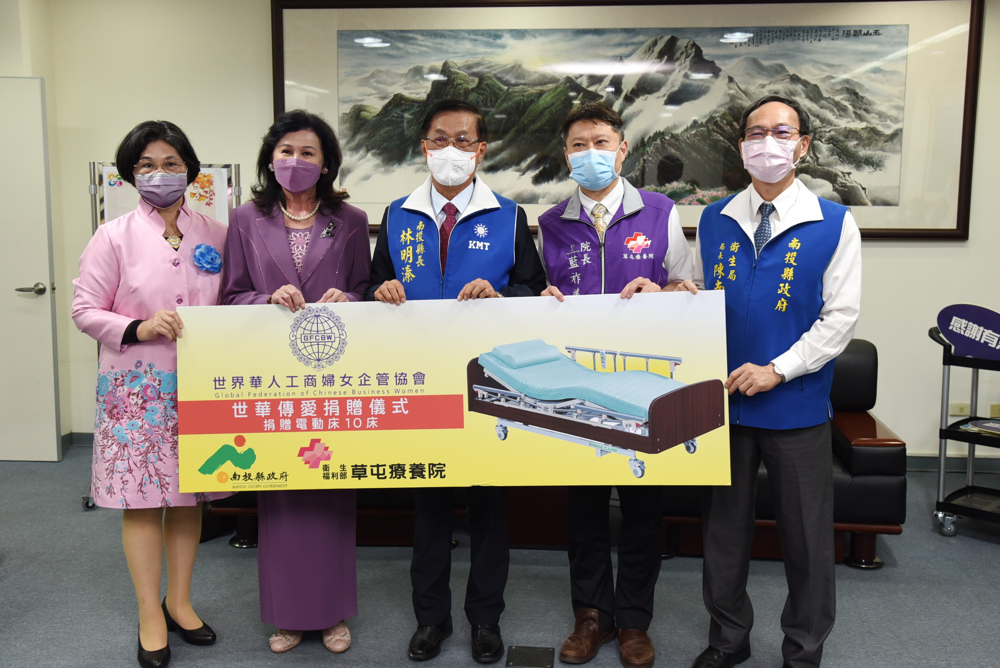 世界華人工商婦女企管協會在總會長陳阡蕙帶領下,11日至縣府捐贈本縣10床電動護理床,縣長林明溱與受贈單位衛福部草屯療養院院長藍祚鴻代表接受,並致贈感謝狀,感謝這群來自海內外優秀工商婦女們的愛心,捐贈護理床讓縣內更多病患受惠。