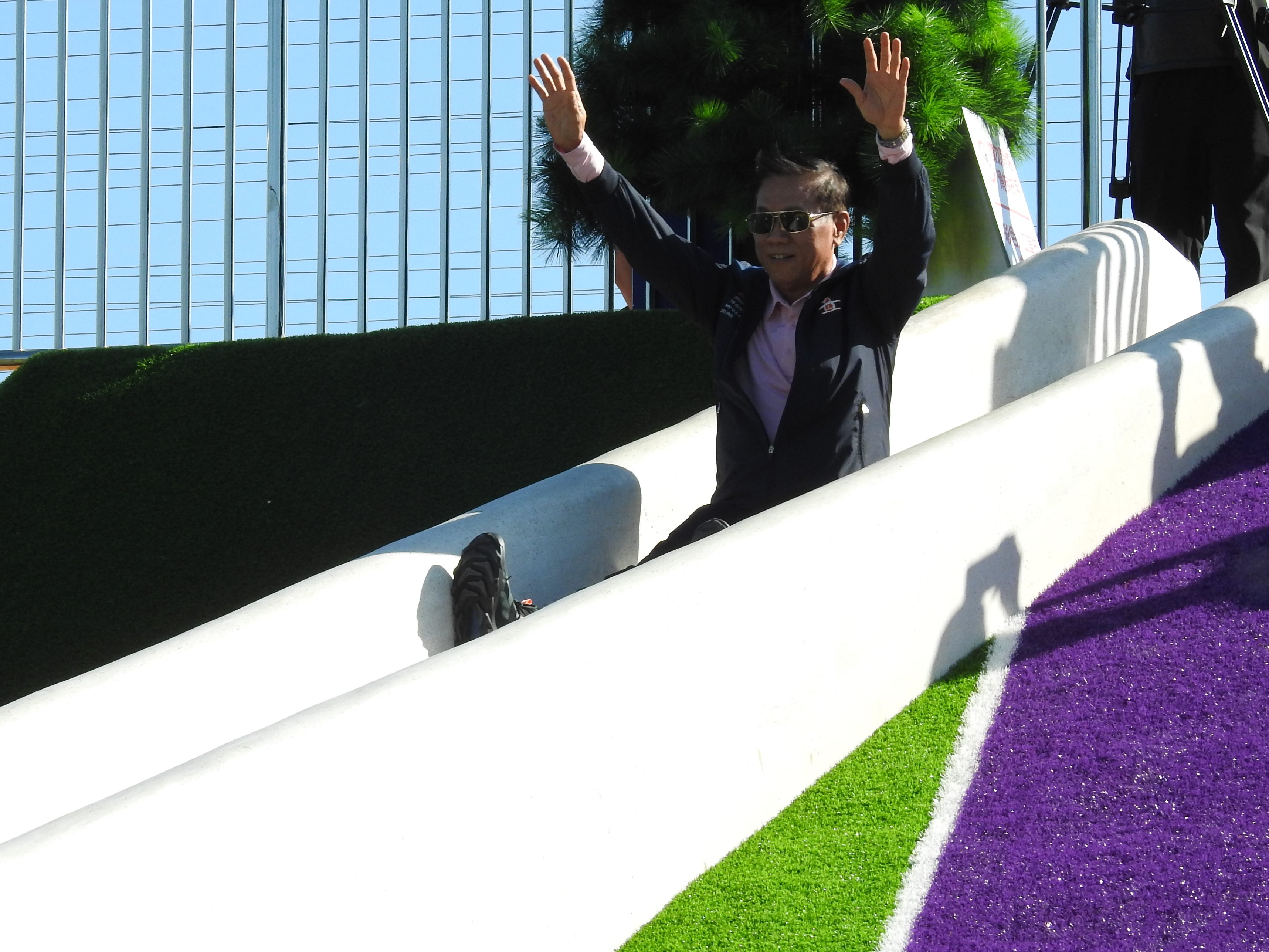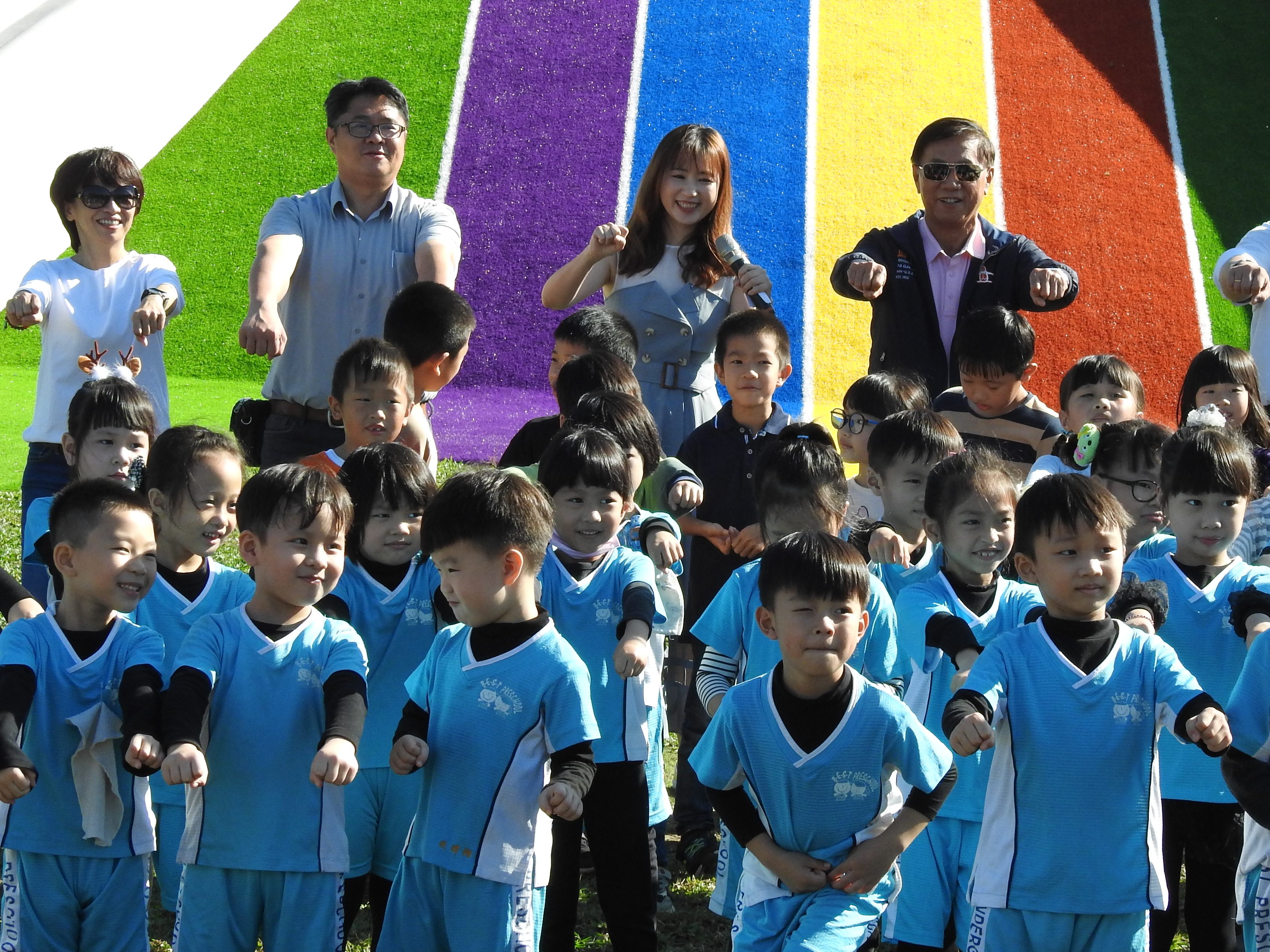 林縣長偕「親子生態園區」新點子發想人縣長特助林儒彬,農業處長陳瑞慶、新聞及行政處長林琦瑜參加開箱活動,隨著兩位體能老師引領,大小朋友在藍天綠地下先進行律動暖身,並仔細提醒小朋友們大型溜滑梯等遊具玩樂時應注意的事項,林縣長率先滑下溜滑梯後,小朋友開心依序體驗,歡樂尖叫聲不斷,刺激又好玩的魅力吸引旁觀者也跟著躍躍欲試,隨後大小朋友也開心的在拉起遮陽網的遊具區及開闊草坪玩起互動遊戲,自由體驗園區共融式遊戲場各式的新穎的遊具設施。