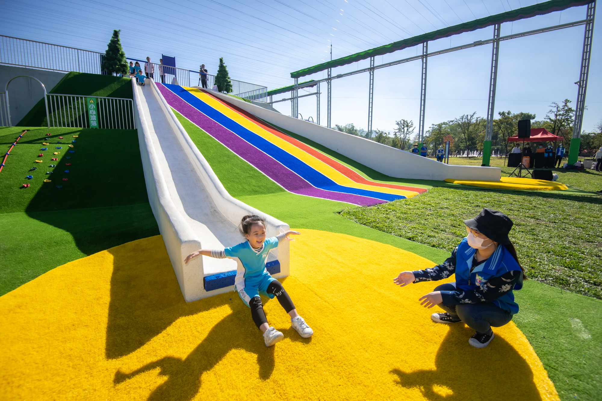 整個園區最吸引大小朋友的就是3座大型遊具區,其中巨無霸大型磨石溜滑梯,高5公尺,最是吸睛,周邊還附設有草皮攀爬區、景觀平台、攀岩設施等遊樂設施。另外,還有兩座大型組合遊具,包括有拱形多人圓盤盪鞦韆、彈跳床、鳥巢式鞦韆及大型攀爬設施等充滿樂趣的遊樂設施,縣府也體貼的在遊具設施上方施設大型遮陽網,提供親子涼爽的遊戲環境。