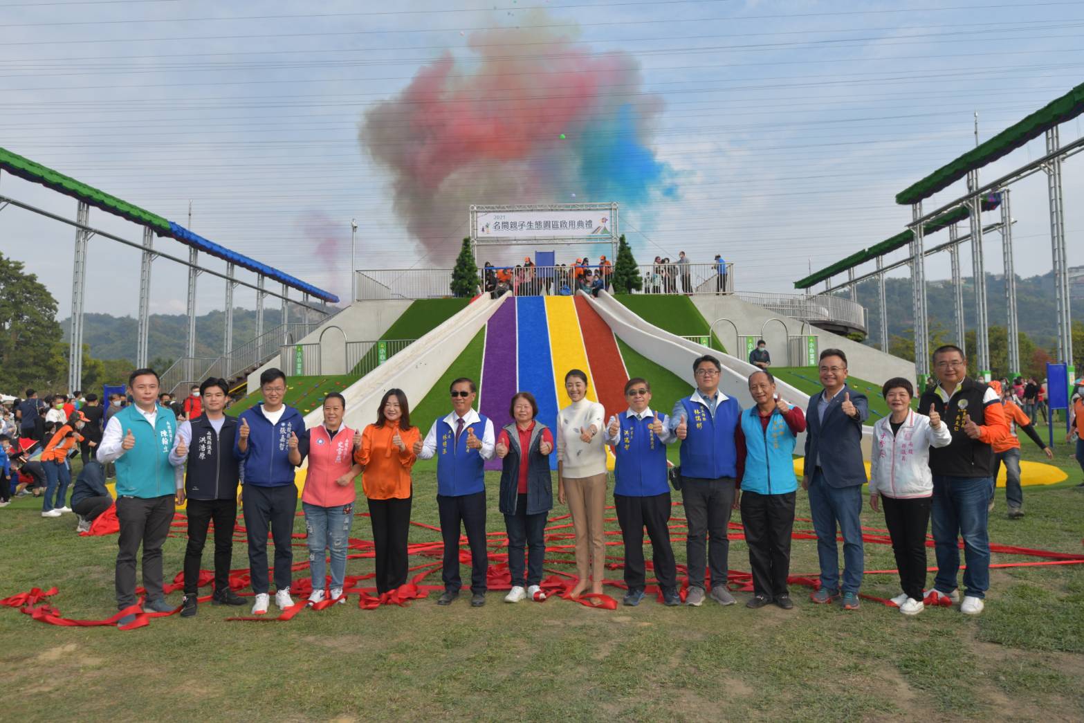 活動第一個高潮是占地2.6公頃全縣最大的名間親子生態園區啟用,林縣長與出席貴賓共同為園區揭幕後五彩氣球升空,接著由8位名間國小學童代表體驗園區超長溜滑梯的「首滑」。林縣長並響應衛生局在會場舉辦的接種疫苗送肉鬆活動,施打了個人第二劑疫苗,衛生局長陳南松也跟進接種了第三劑加強疫苗,帶頭示範鼓勵民眾踴躍接種疫苗。