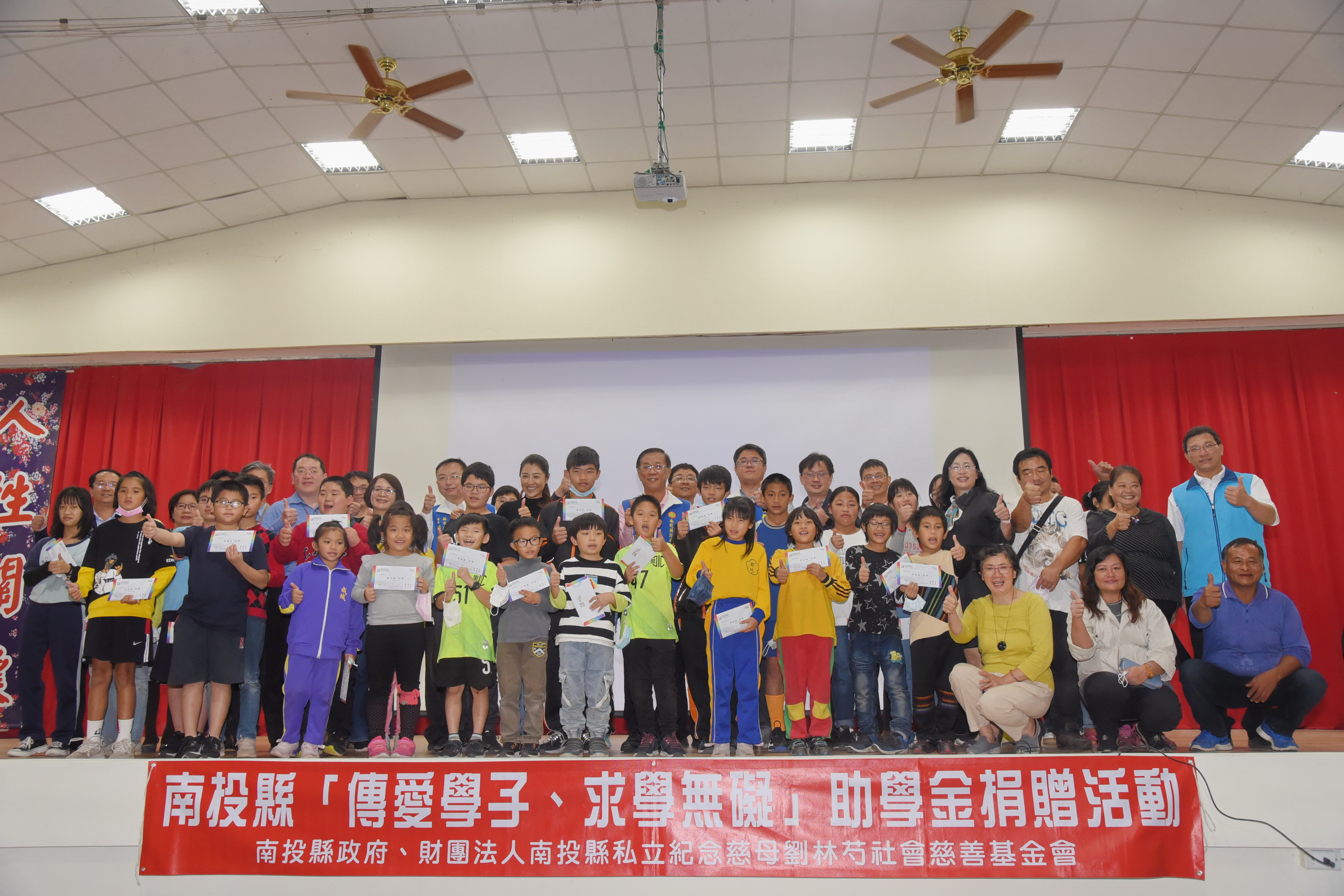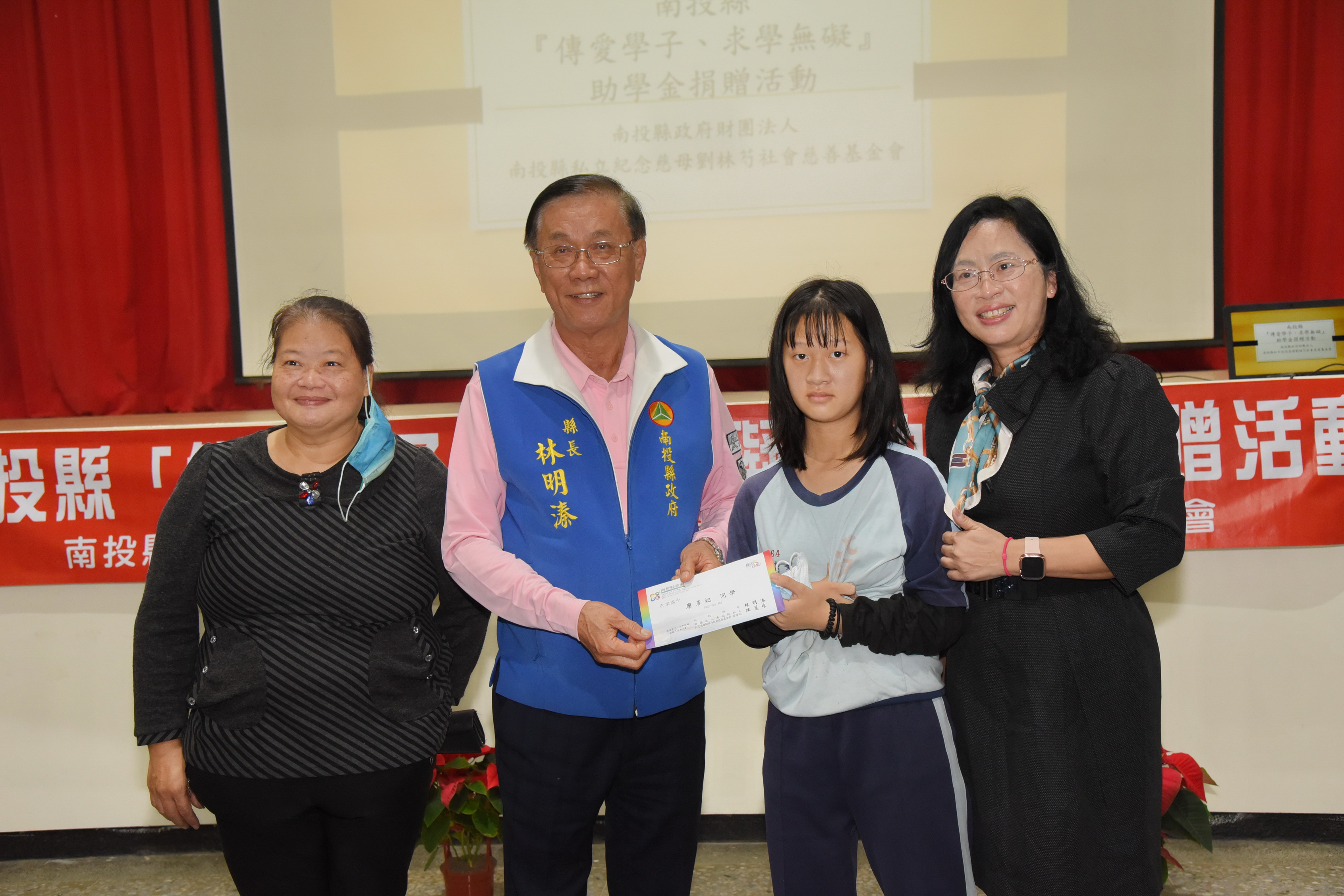 暖冬送愛,求學無礙,南投縣「傳愛學子、求學無礙」助學金捐贈活動,16日於水里國中舉行。縣長林明溱、立委許淑華,教育處長陸正威、國民黨南投縣黨部主委林儒彬,逐一頒贈3萬元助學金給集集鎮、水里鄕及信義郷24位弱勢家庭學生,計發出72萬元助學金,勉勵學子努力向上。