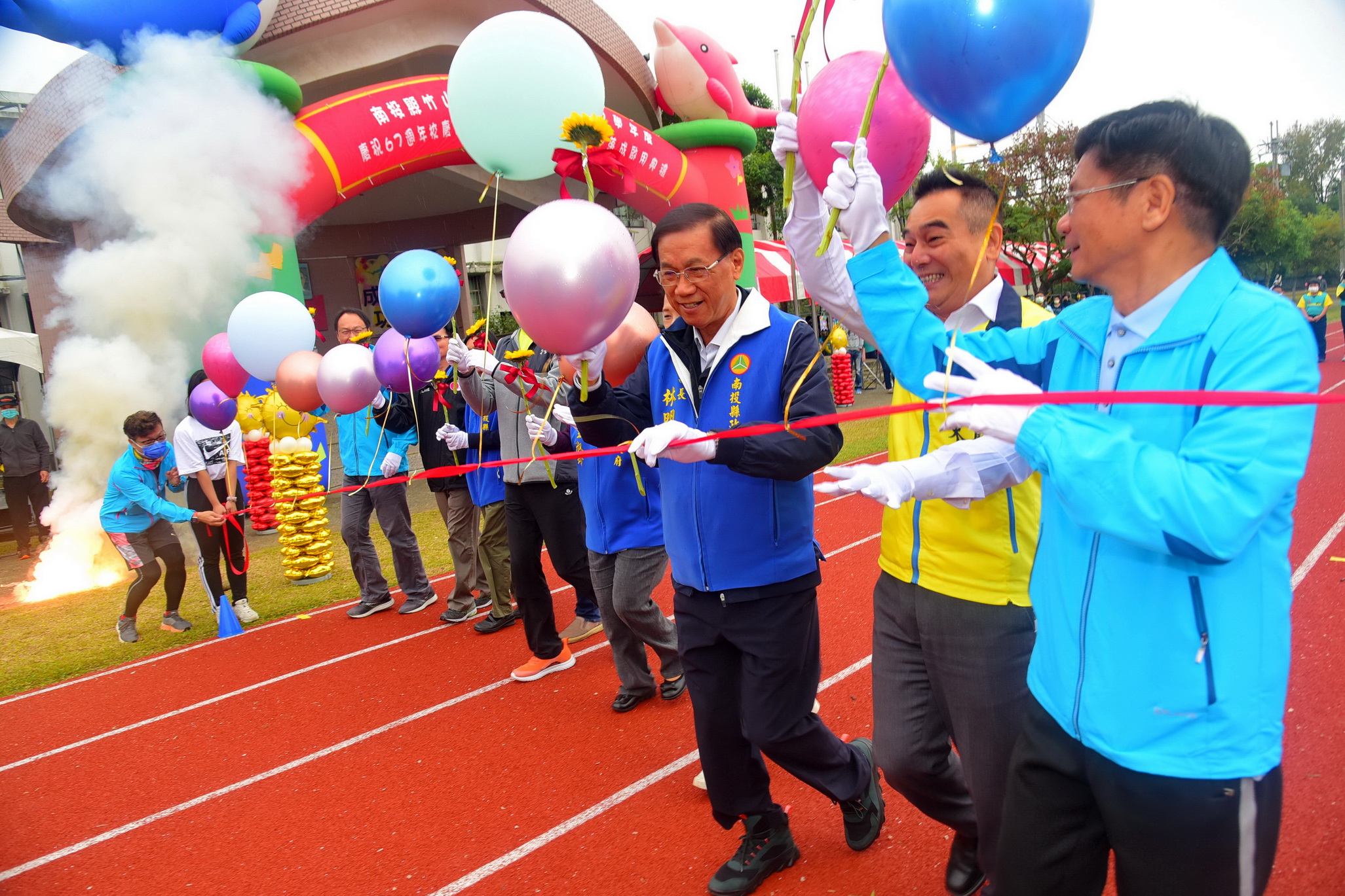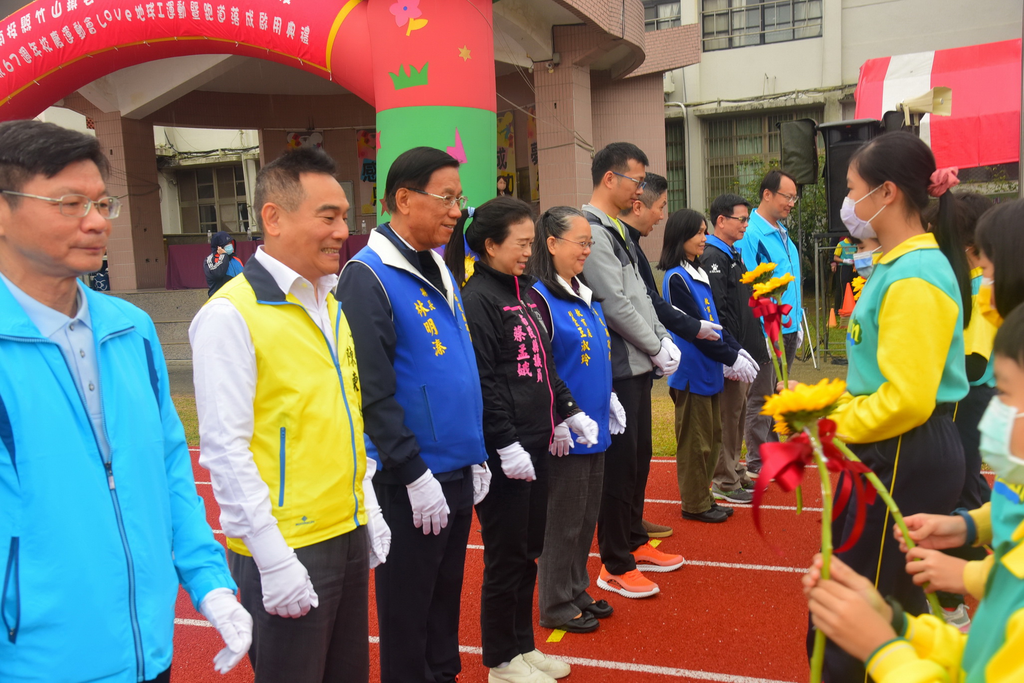 縣長林明溱25日出席竹山鎮雲林國小67週年校慶活動,並與縣議員蔡孟娥、游顥、校長劉仲芳及家長會長曾彥霖等12位嘉賓一起以健走方式為新整建完成的操場啟用,開啟該校校史新頁,全校師生在嶄新的跑道上參加校慶競賽,臉上洋溢歡樂幸福的笑容,場面歡樂溫馨。林縣長期勉師生要多運動,培養健全體魄,努力上進,未來作為竹山鎮繁榮發展的基石。 林明溱說,雲林國小建校67週年,作育竹山子弟無數,舊友操場跑道已使用20多年,破損老舊,不堪使用,影響學生學習安全,在劉校長多次爭取,各級民意代表關心協助下,經縣府教育處報請教育部體育署爭取經費整建,獲核定計畫經費530萬元,其中中央補助424萬元,不足部分由縣府編列106萬元配合款支應,歷經8個月整建,現在的操場和跑道煥然一新,以後師生教學就有舒適安全設施了,希望師生和社區民眾能多利用,透過運動讓自己更健康。 蔡孟娥及游顥同聲表示,整建完善的師生教學設施與社區民眾健康活動場地一直是林縣長施政的重點,很高興在縣府的爭取下,雲林國小操場整建完成啟用,未來縣議會將持續支持縣府施政,讓校園教學設施更完善。 劉仲芳指出,該校操場到約300公尺,在竹山鎮是少有的大型跑道此次操場整建工程充分展現縣府對學校基礎建設的重視與用心,在考輛學校永續發展的考量下,整建工程保留了操場周邊樹木,不但達到空間綠美化營造效果,也留住了師生的記憶,學校家長及社區民眾對新營舒適的操場都讚譽有加。 家長會長曾彥霖也表示,從40年前入學雲林國小迄今,看見學校校舍、操場不斷擴建更新,展現母校生生不息,持續茁壯,培育在地子弟無數,令人感動,感謝縣府與歷任校長支持與努力,期許未來在親師共識下能持續打造更臻完善的教育平台。 當天校慶活動除健走剪綵儀式外,學生也以太陽花(向日葵)獻與12位嘉賓表達感恩牽成之意外,中和國小舞龍隊及明善學員的太鼓隊也來表演致賀,另也結合環境教育Love地球i運動的表演節目及親子趣味競賽、田徑賽等,活動精彩熱鬧。