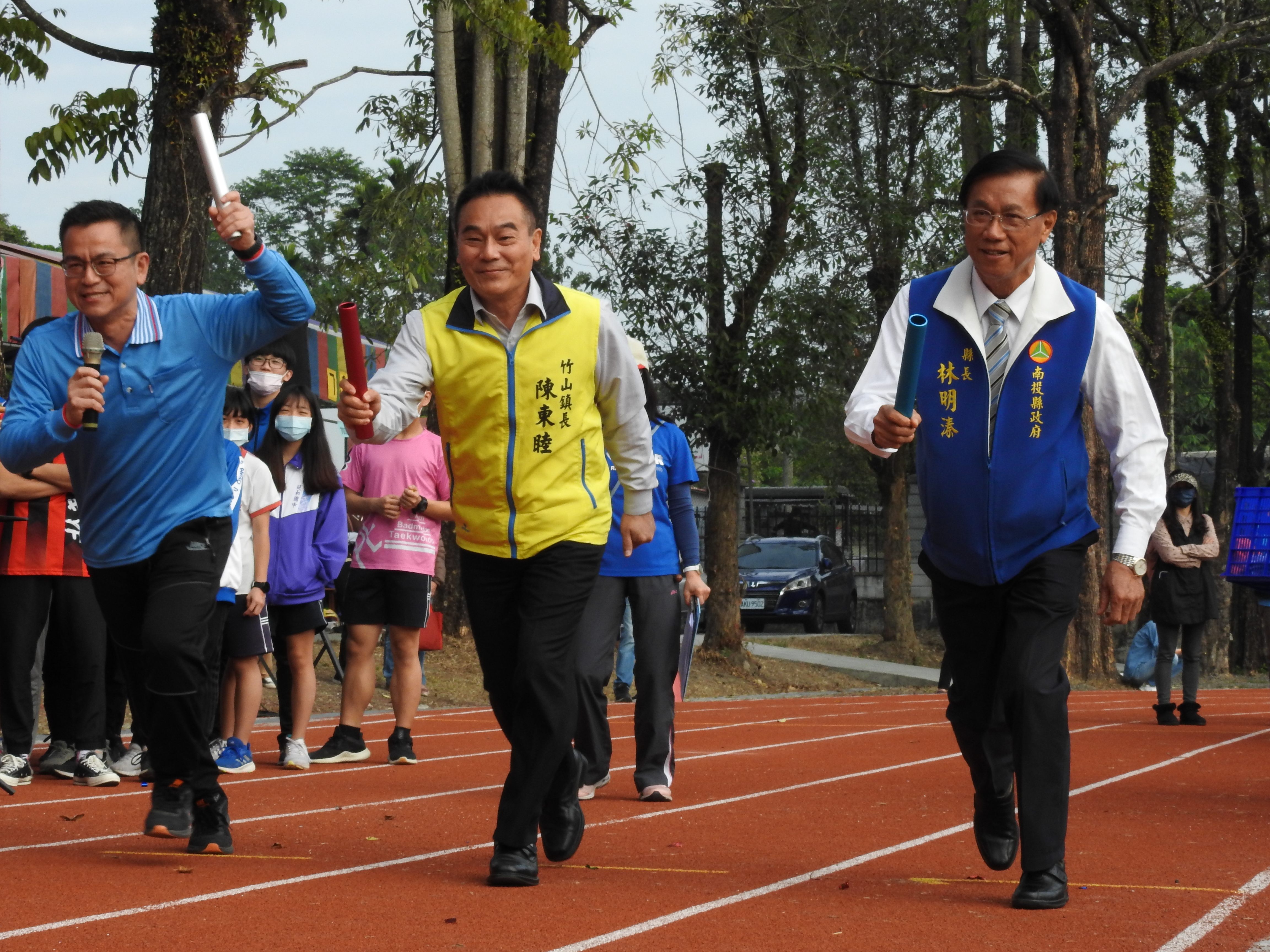 上午的開幕及剪綵,除林縣長專程前往祝賀,立委許淑華、縣府教育處副處長王淑玲、竹山鎮長陳東睦、縣議員蔡孟娥、游顥及眾多地方貴賓、家長都與會,剪綵後,林縣長、許立委等貴賓也接力試跑嶄新的操場跑道,林縣長並擔任第一跑道選手,起跑後交棒給立委許淑華,過程逗趣氣氛歡樂。