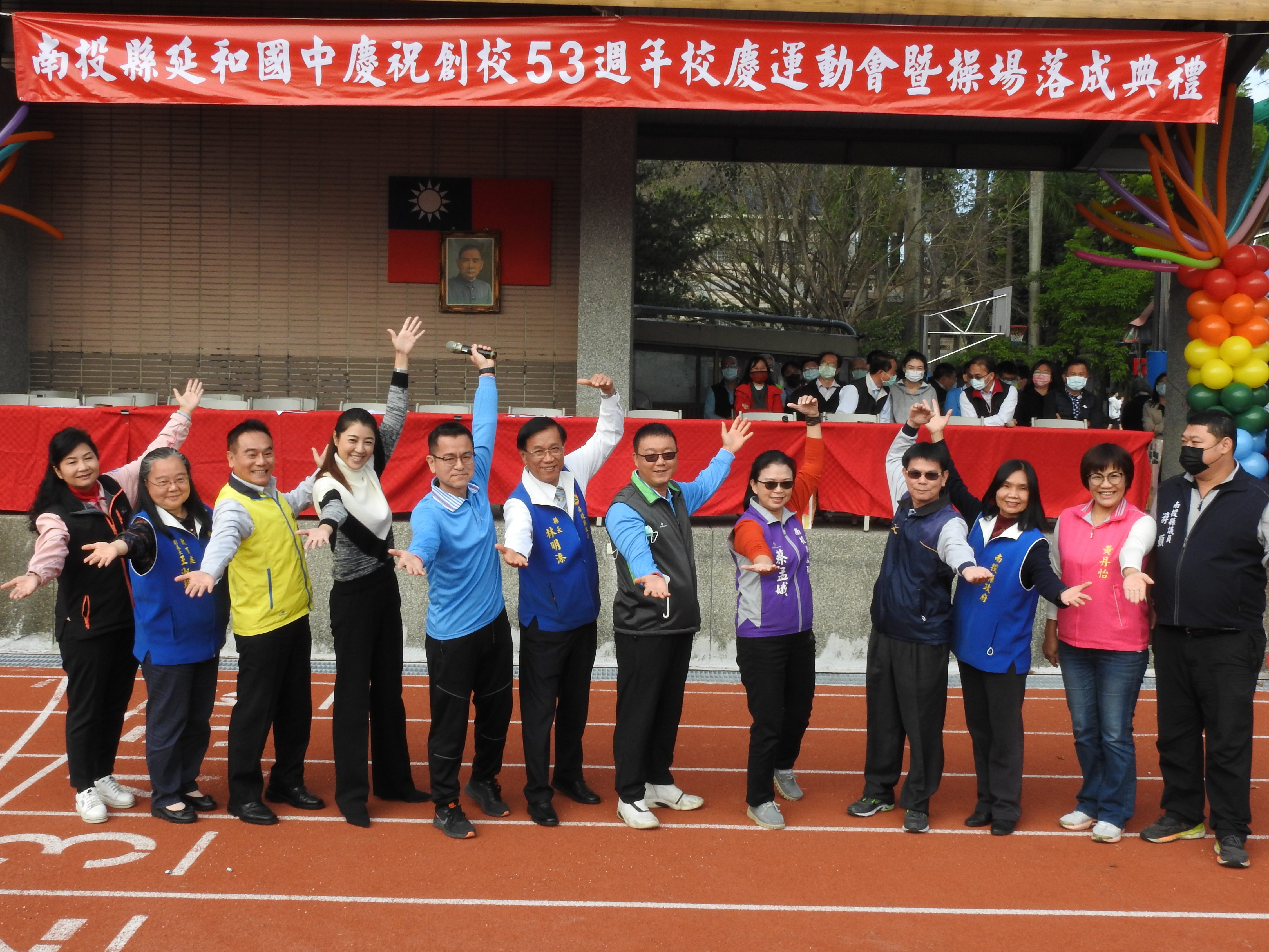 竹山鎮延和國中30日舉辦創校53週年校慶運動會,同時為嶄新的操場等運動設施啟用剪綵,縣長林明溱感謝中央補助操場整修,縣府更努力籌措4分之1配合款,終於促成年久失修曾有學生民眾摔倒的延和國中老舊跑道等設施徹底翻新,林縣長面對滿場朝氣蓬勃,參加運動會的學生開心指出,希望同學們養成運動的好習慣,因為要有體力才能在各方面適性發展。