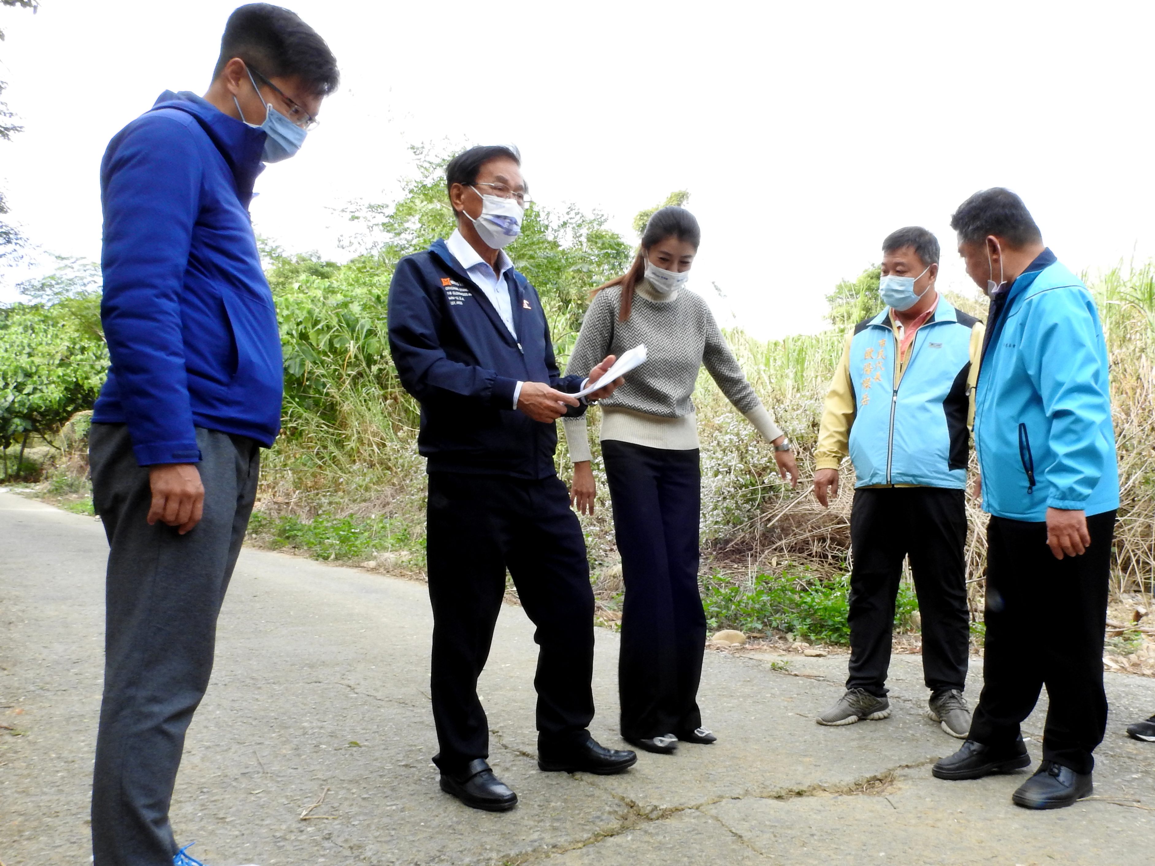 最後,林縣長會勘平山里南投路,林縣長說,南投路從銜接平山里工業路及福山里八卦路,是南投市最早通行山上四里的古道,如今雖因路寬不足只剩農友使用,但年久失修路面崎嶇,確實是很需改善,因此將動支320餘萬元將全長1,100公尺,寬3.5公尺的路面都刨除重鋪,並將部分路基損壞的路段先鋪設混凝土,再加鋪瀝青讓行車更穩更安全。