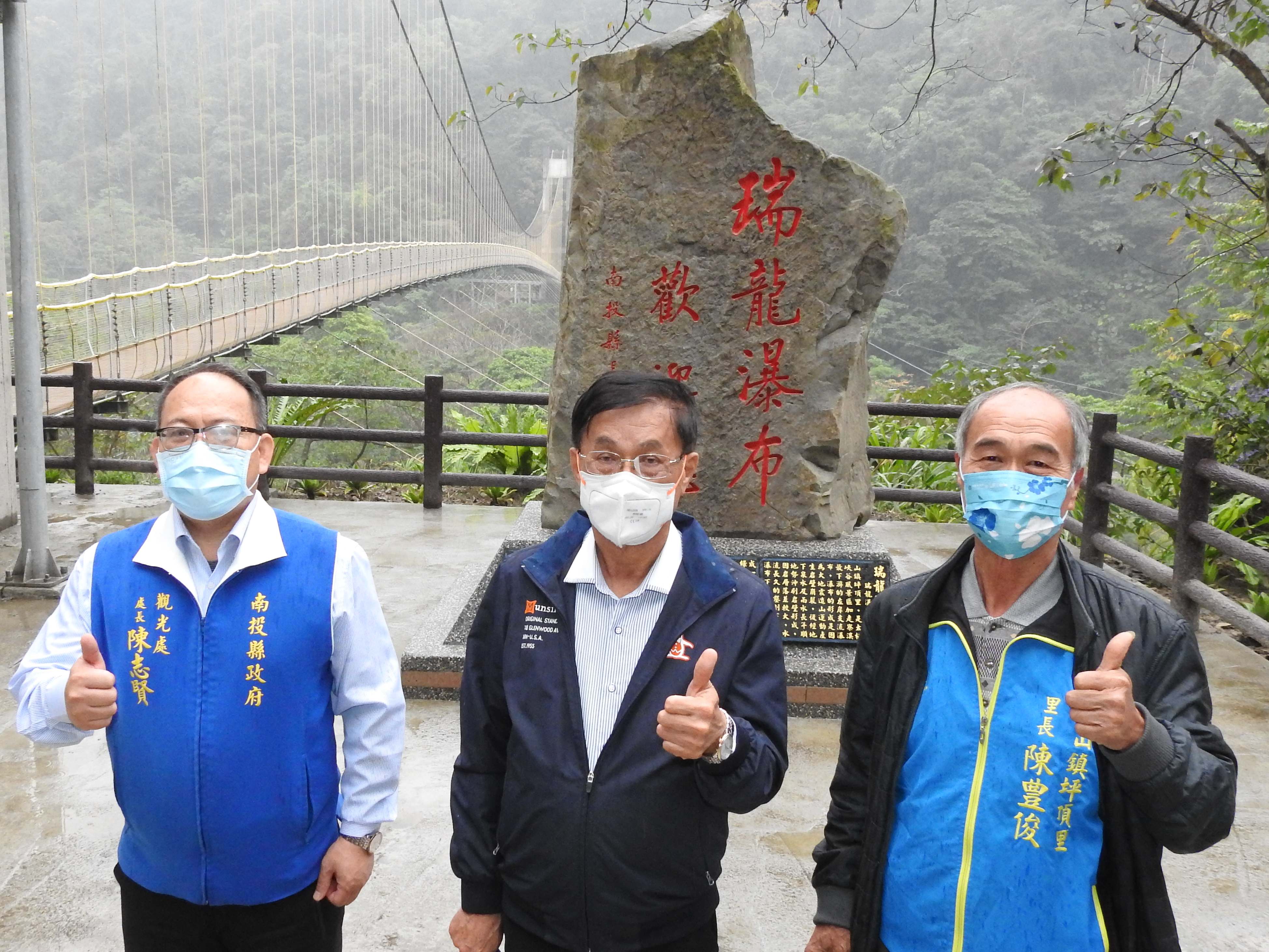 林縣長24日下午率觀光處長陳志賢及觀光、工務處團隊,在瑞龍瀑布在地竹山鎮坪頂里長陳豊俊陪同下,冒雨勘察瑞龍瀑布園區,從新增的遊覽車停車場、入口人行步道、防疫管制設施,到緩坡步道及跨河觀瀑平台,逐一仔細踏勘,也對公廁外牆增加彩繪、吊橋與主瀑間夏季小瀑導水、觀瀑平台旁休憩設施等,要求在開園進一步追加補強,而獲保留的舊有階梯步道,也將在增設止滑及清洗鋪面護欄後再重新開放,提供腳力好的民眾自由選擇挑戰行程。