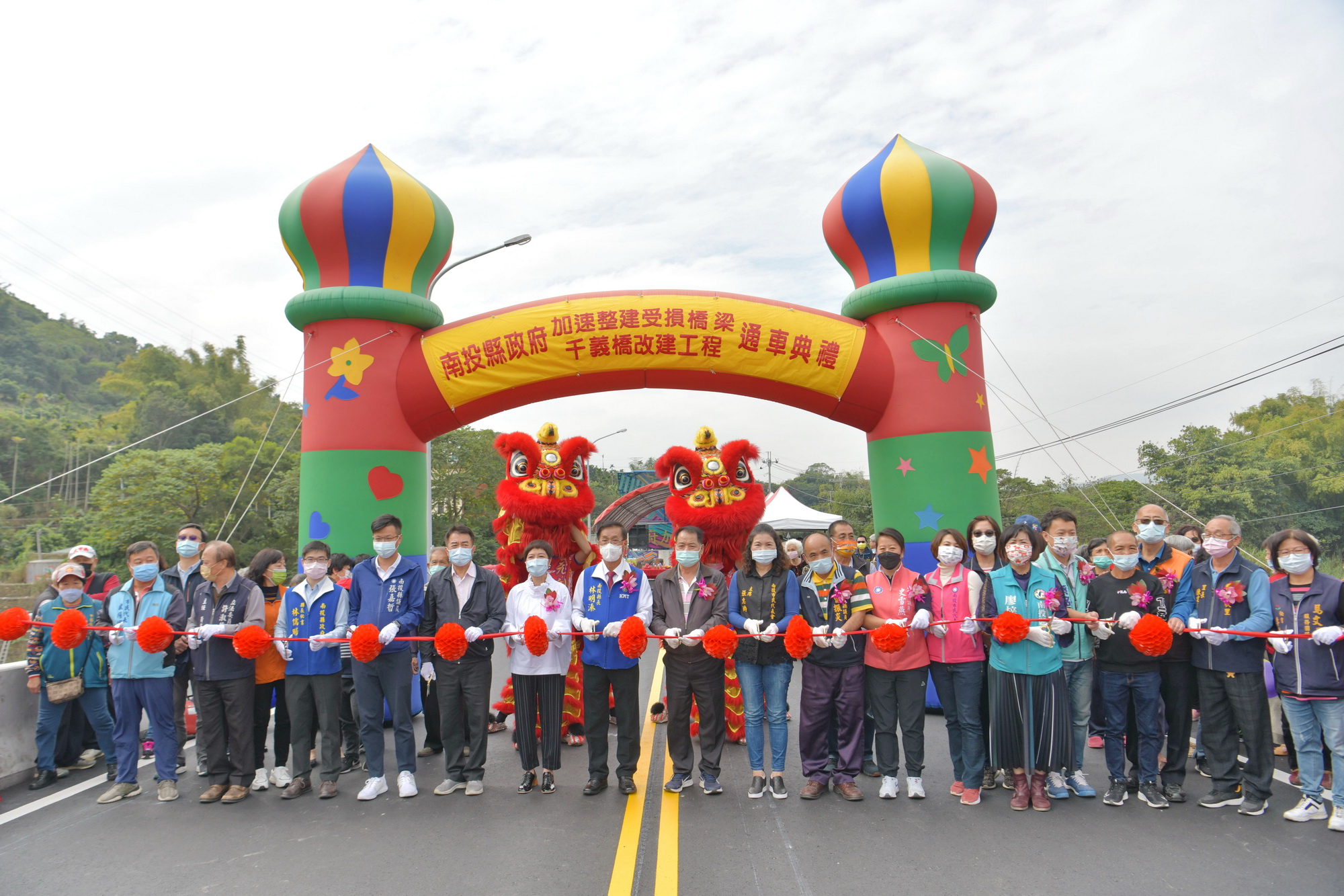 林縣長表示,過年即將到來,千義橋是南投市往返中寮鄉的交通要道,感謝南投籍立委在中央協助爭取經費,也感謝營造公司加緊趕工,橋粱得以在過年前順利通車,讓進出南投、中寮的縣民與遊客更加便捷,往來車輛更加安全。
