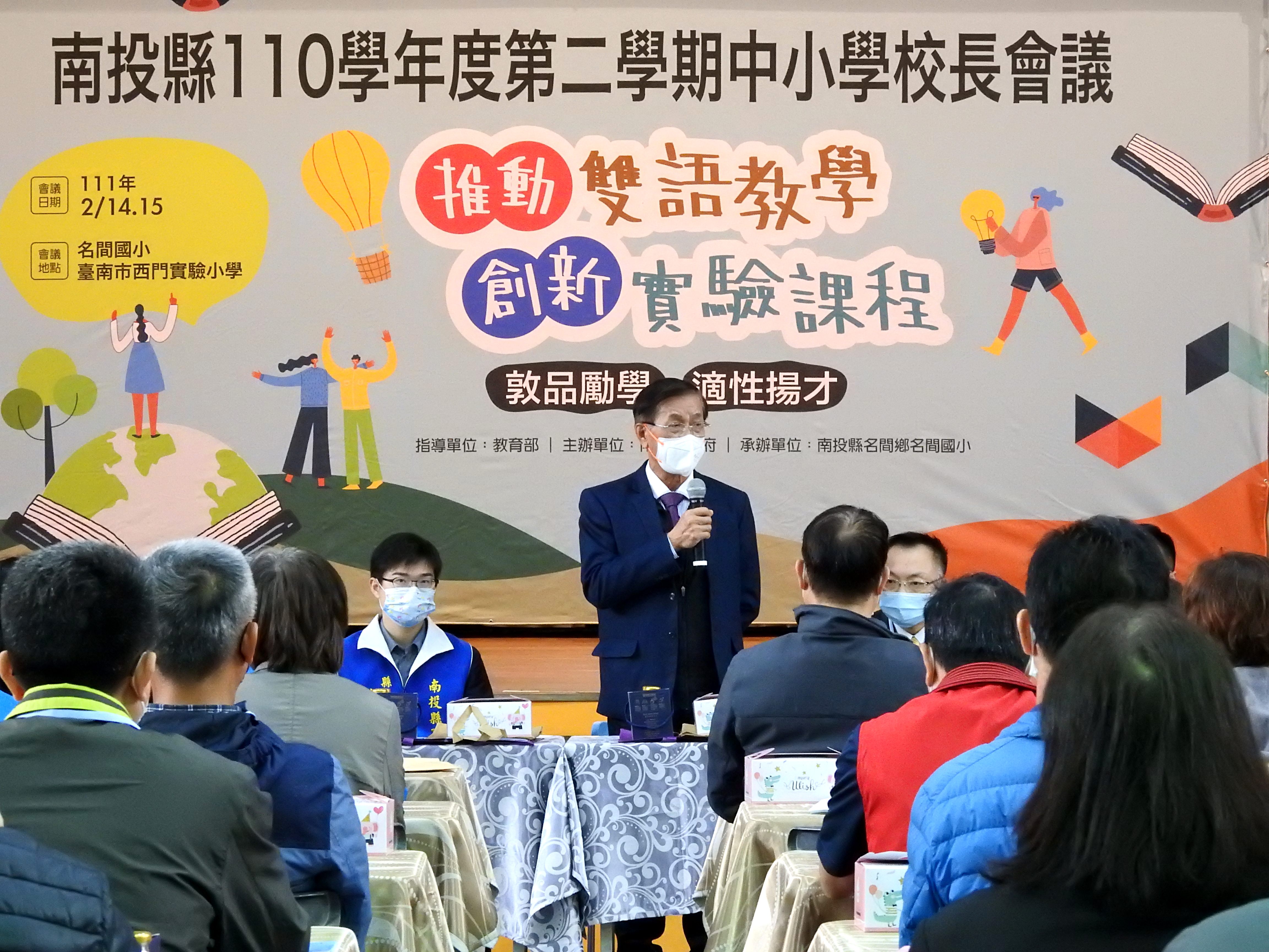 南投縣110學年度第二學期中小學校長會議13日在名間國小登場,這次校長會議來自全縣185所高中職、國中小校長,以「敦品勵學,適性揚才-推動雙語教學、創新實驗課程」為主題,展開為期兩天的研討交流,縣長林明溱專程主持開幕典禮,除為薪傳教育的馬惠娣等9位「師傅校長」授證,頒獎表揚獲海洋教育教案徵選特優旭光高中等9所學校,也致辭懇切拜託所有校長,落實適性揚才,捨打罵用愛心,領導教學團隊關懷陪伴,鼓勵所有孩子學習成長。