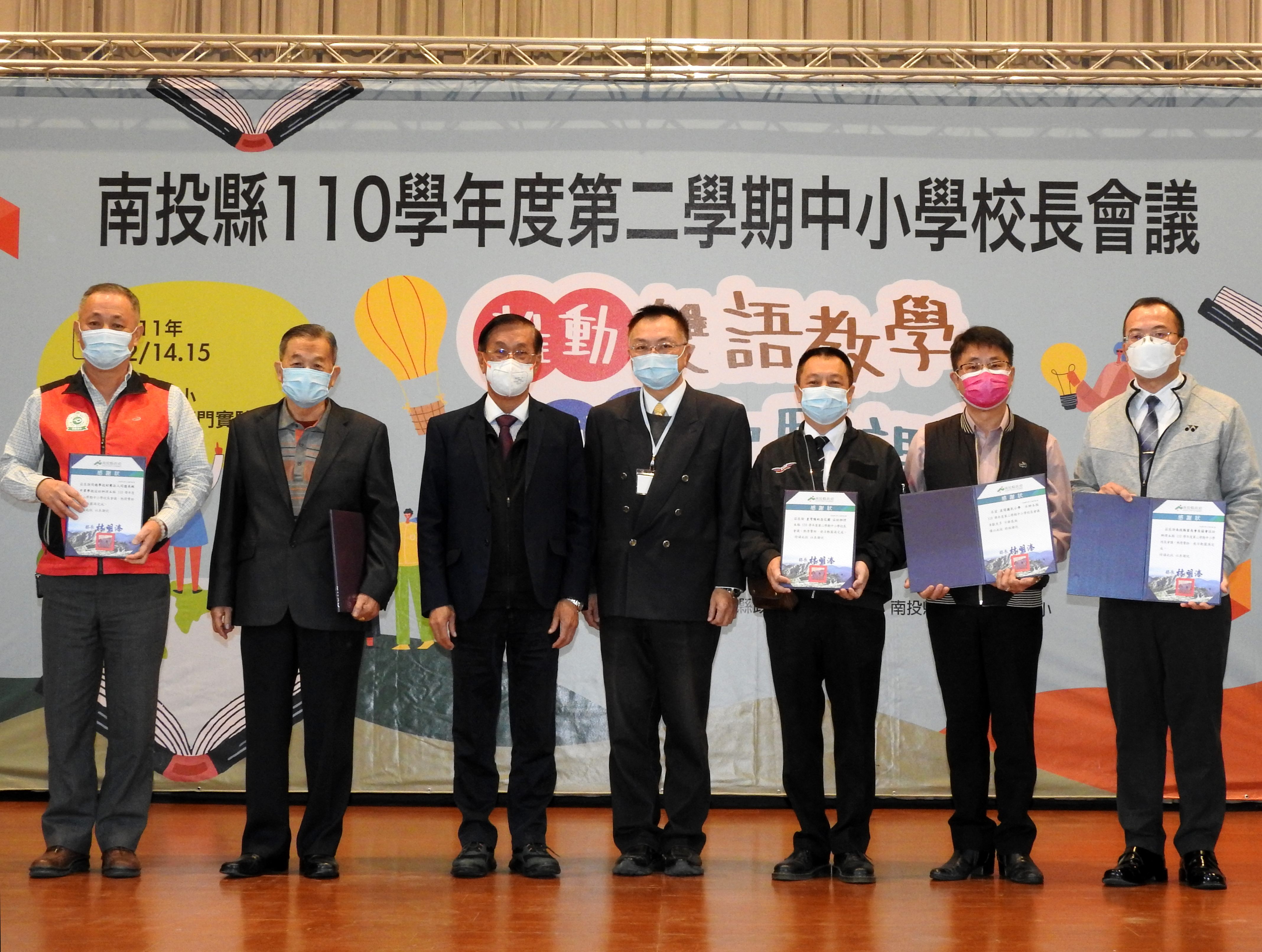 師傅校長授證名單:馬惠娣校長、黃美玲校長、鍾美月校長、簡秀鶴校長、張月玲校長、吳碧霞校長、楊常婉校長、張振肇校長、陳麗惠校長。獲獎學校名單,110年度海洋教育保護海洋教案徵選特優旭光高中;110年度海洋教育創新教學優質團隊選拔佳作福龜國小;110年度戶外教育優質課程模組與創新教學案例徵選優等溪南國小、 佳作東埔國小、育樂國小、福龜國小;110年教育部品德教育特色學校前山國小;南投縣 110 年度國民中小學特殊教育評鑑優等大成國中、延平國小。林縣長也頒發感謝狀給協辦贊助本次會議的同德高中、華岡保全、皇穹陵、南投縣家長會長協會及名間國小。