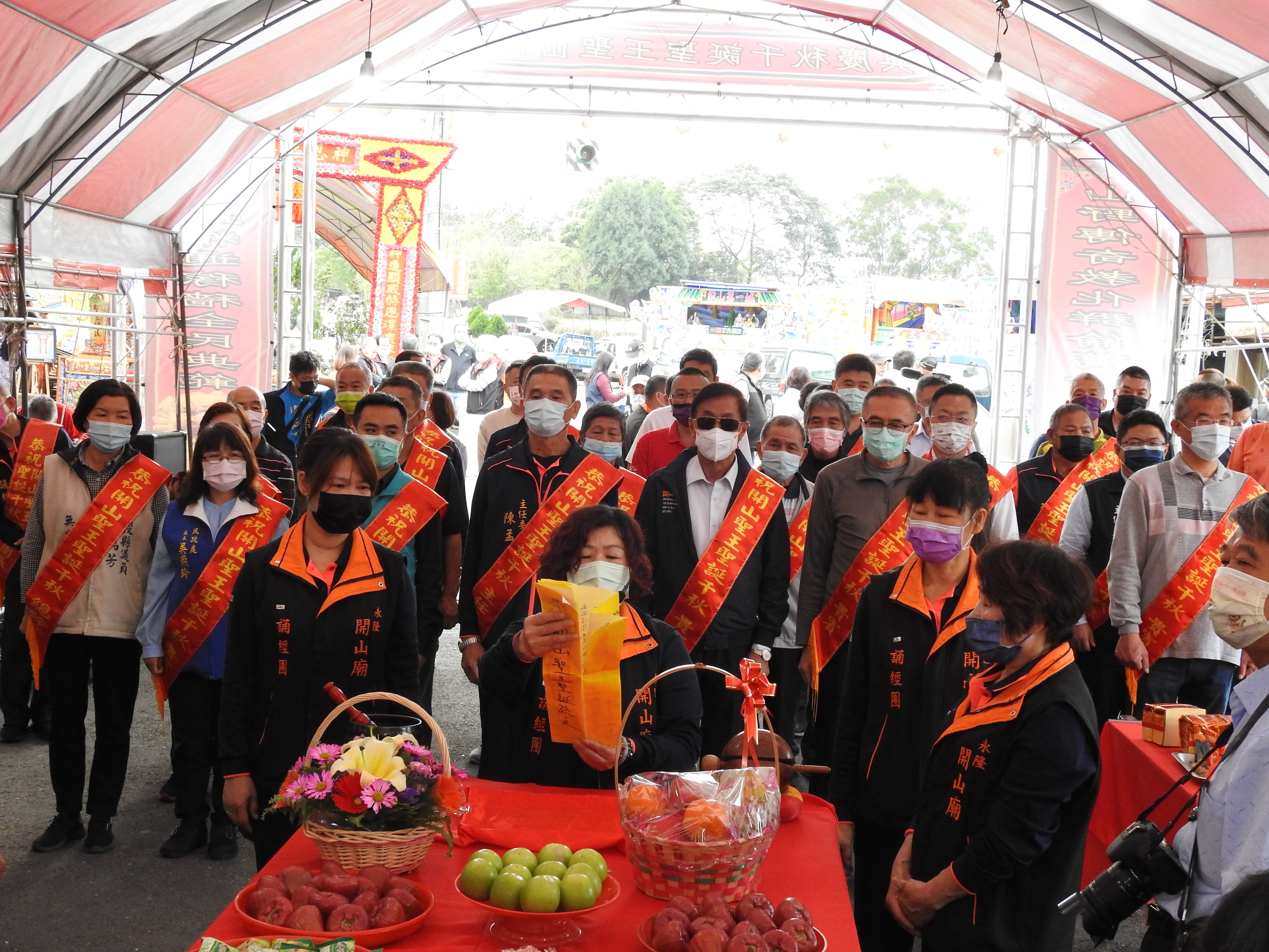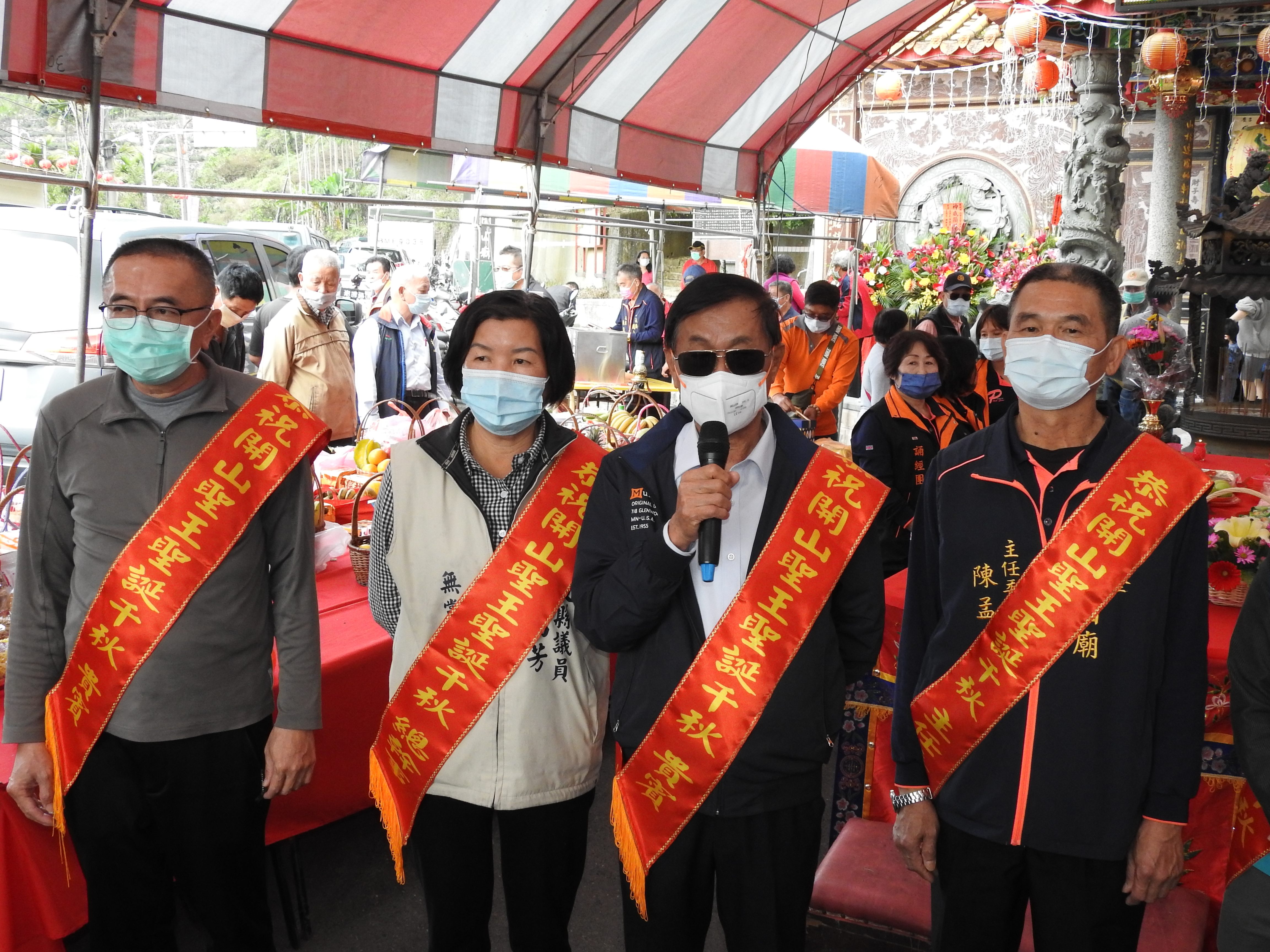 農曆2月1日喜逢鹿谷鄉永隆麒麟山開山廟開山聖王聖誕千秋,南投縣長林明溱專程前往賀壽,虔心祈求疫情早日過去,國泰民安闔境平安四時無災,讓鄉親事業能順利賺大錢。 林縣長由縣府民政處長吳燕玲陪同參加開山廟祝壽大典,典禮由開山廟管理委員會主委陳孟良主祭,鹿谷鄉長邱如平、縣議員黃東灝、吳瑞芳、國民黨南投縣黨部主委林儒彬、集集鎮長陳紀衡、鹿谷鄉代表會主席林智鴻、副主席陳君宜及眾多地方士紳也都參加上香獻祭,更吸引大批鄉民及信眾前往參拜賀壽。 林縣長表示,開山廟歷史悠久、開山聖王神威顯赫,每年開山聖王聖誕都會吸引眾多信徒前來賀壽及參拜祈福,今年廟方克服疫情衝擊落實防疫措施,恢復祝壽大典儀程,大家才能虔誠上香、敬獻鮮花素果、酒水麵線等供品,祈求開山聖王庇佑縣境平安,農產豐收,讓新冠肺炎疫情早日遠離,鄉親身體健康平安,產業順利發展。 陳孟良主委指出,中央最新的防疫雖然稍有放鬆,但宣布時,廟方已來不及製作開山廟祝壽傳統的糯米大神龜,但信眾仍增加賀壽大筵席,就是要展現向開山聖王祝壽的最大虔敬之意,而平安大神龜的祝壽活動也會在來年疫情真正解封後恢復。 開山廟一早就聚集大批信眾前來上香祈福,附近道路停滿車輛,讓一向靜謐的永隆山村變得熱鬧滾滾,廟方也延續過去傳統,設置防疫完備的用餐區,並準備豐盛的湯圓、炒米粉、炒麵、菜頭湯讓信眾免費吃平安。