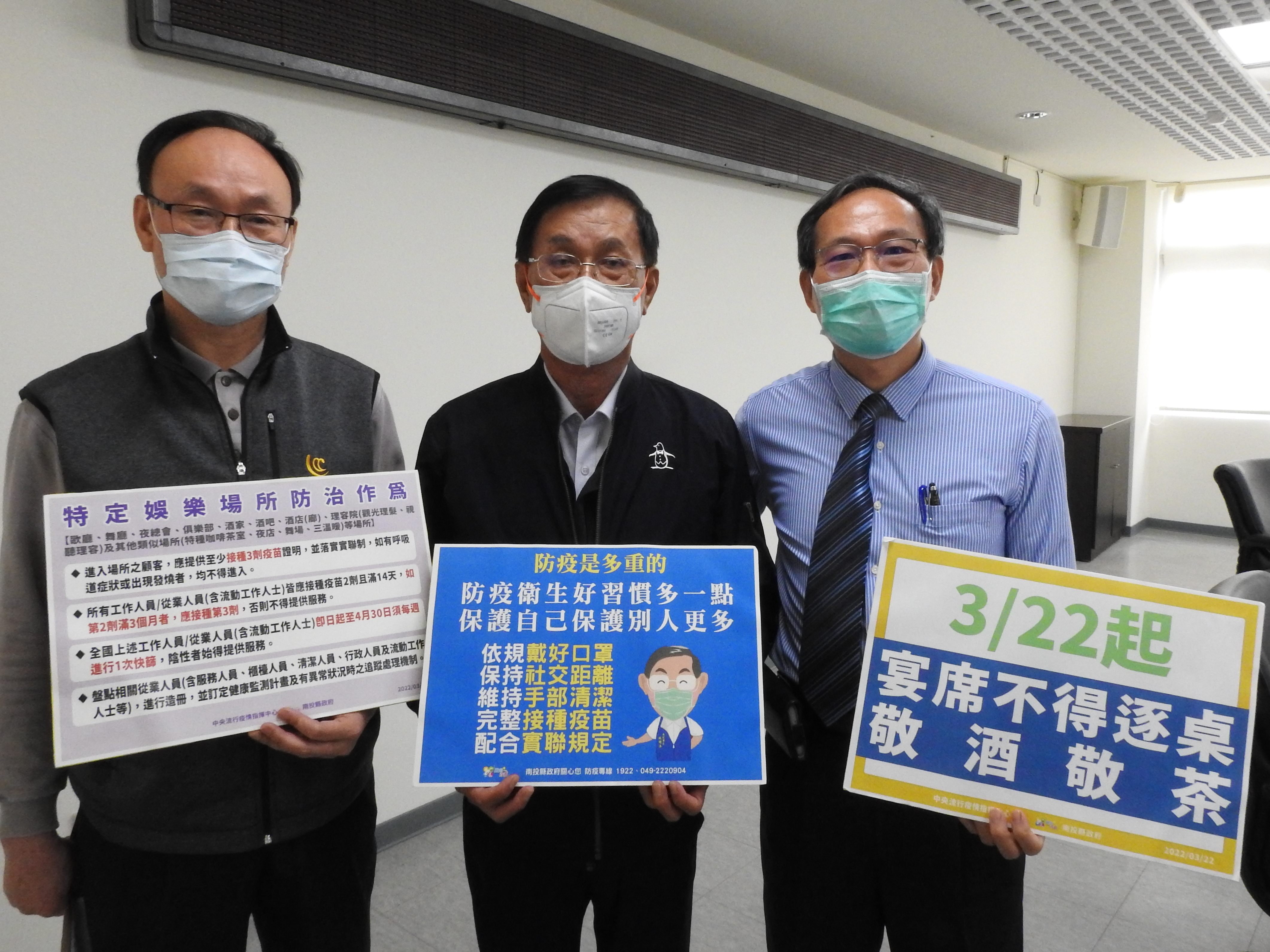 27日本土病例暴增為83例,南投縣立即啟動特定娛樂場所防疫聯合稽查等等因應升級防治的具體作為;縣長林明溱28日縣務會議後,更率衛生局長陳南松、警察局長黃永志,宣示加強防疫的決心,特別呼籲民眾全力配合新升級的防疫措施,共同守護南投防疫淨土。