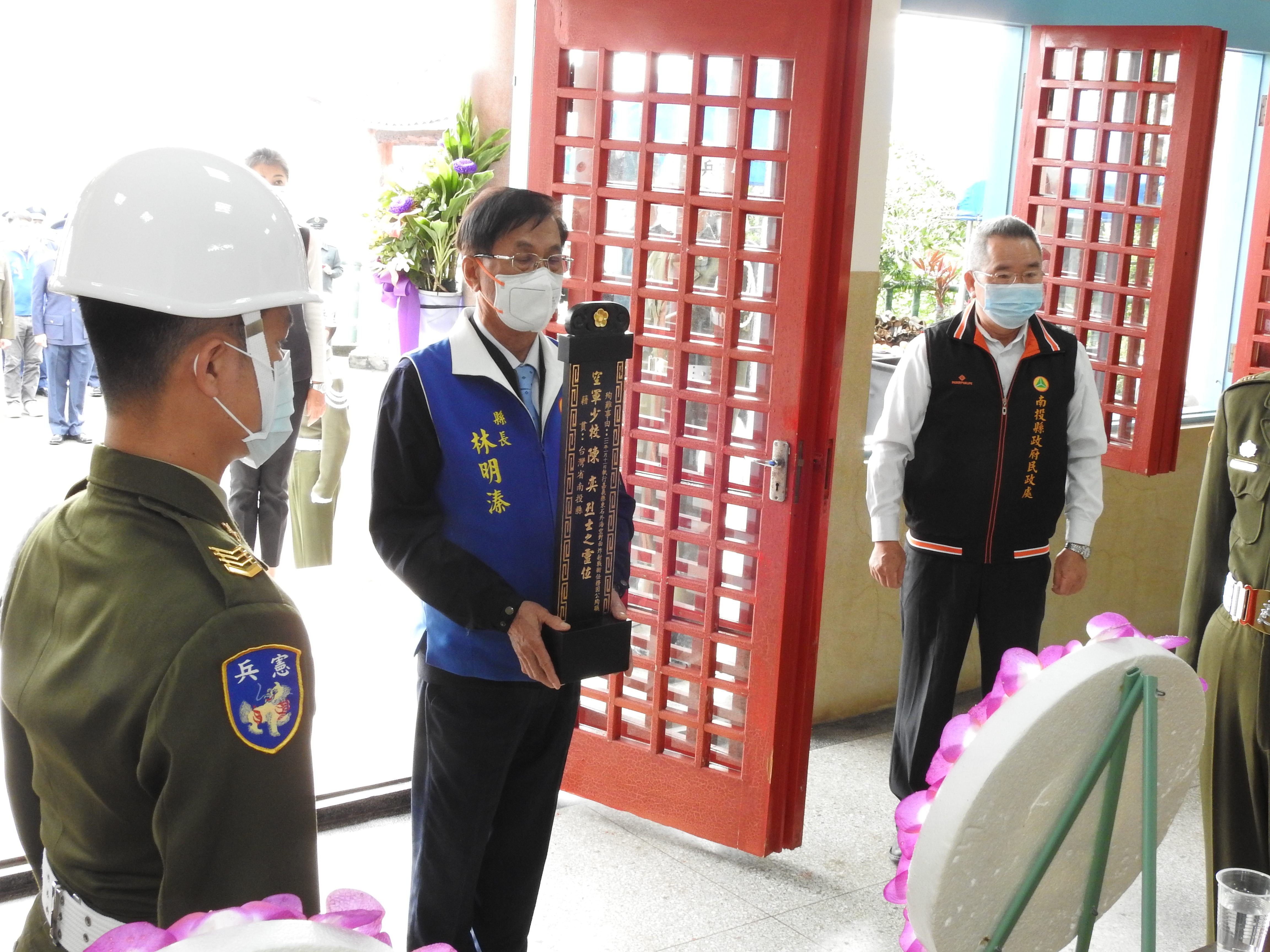 陳少校服役期間執行各項戰演訓任務,克盡職責,為保衛民眾忠於職守,自動表現超越尋常之英勇行為,具體展 現中華民國空軍之「筧橋精神」及「忠勇軍風」獲國防部追頒「忠勇勳章」暨總統追晉軍少校等殊榮,其為國犧牲奉獻之神,實為國軍官兵效法典範,符合冒險犯難、俗己為國特質,並經內政部核准入祀南投縣忠烈祠,本縣依規定辦理入祀儀式,以告慰其英靈,使其忠烈精神永昭垂範。