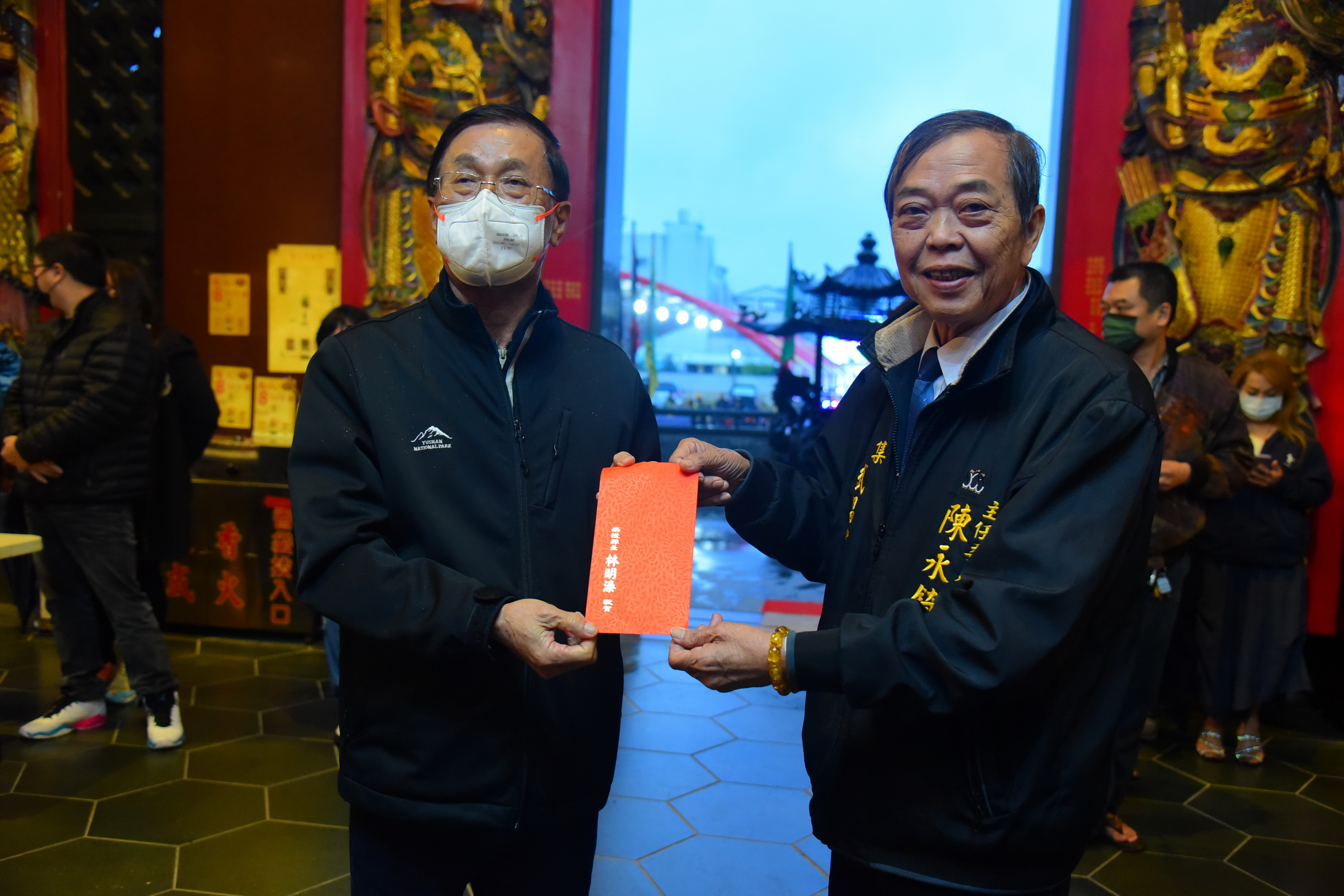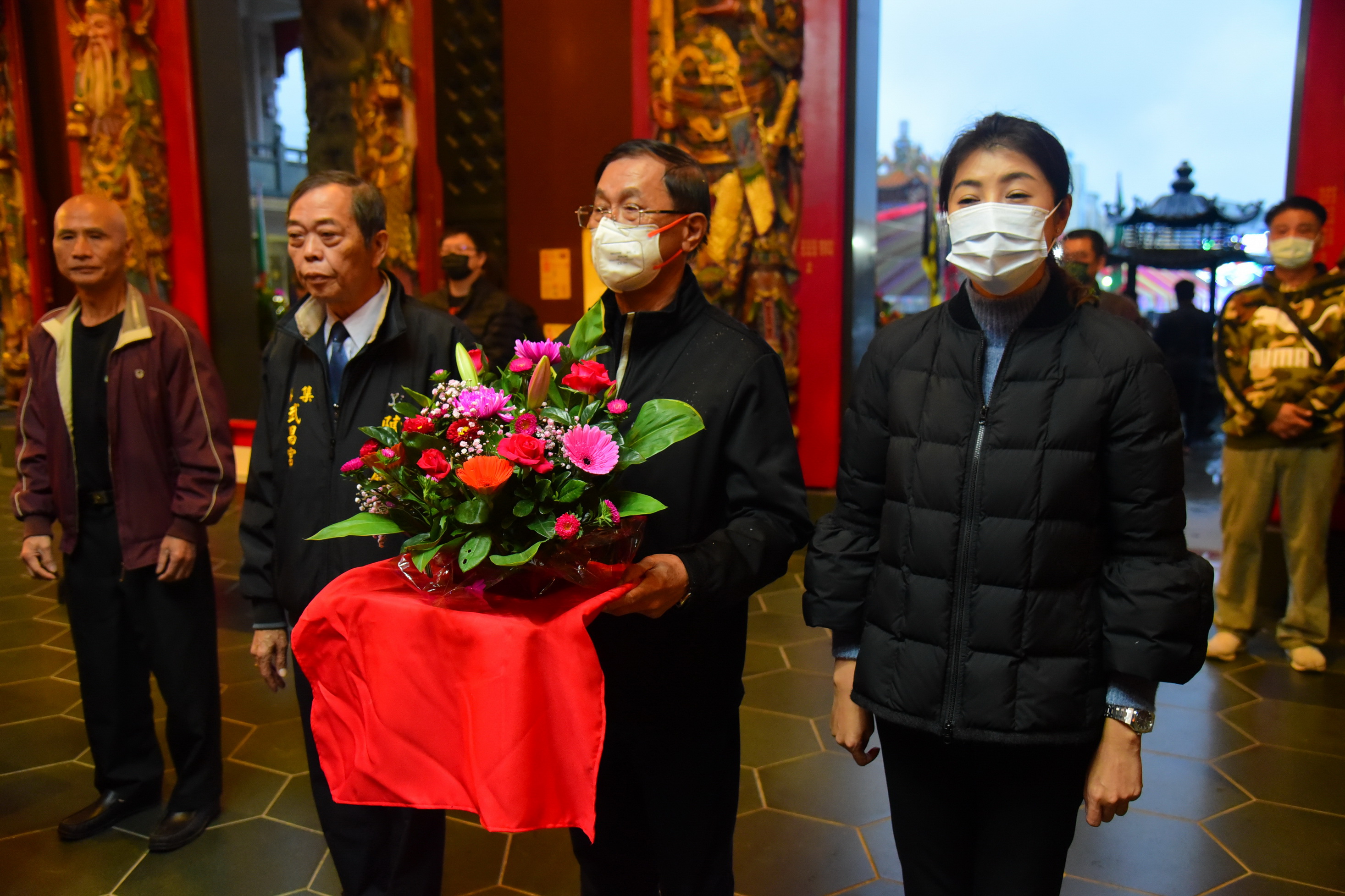 林明溱說,武昌宮主祀玄天上帝,神威顯赫,庇佑地方,農曆3月3日是玄天上帝聖誕千秋的日子,今天大家一起來祝壽,場面相當隆重。此次新冠肺炎疫情升溫,疫情擴散到全台,只有剩下南投這塊淨土,這是全體縣民努力防疫的成果,希望大家繼續保持下去,落實各項防疫規定及做好個人防護。