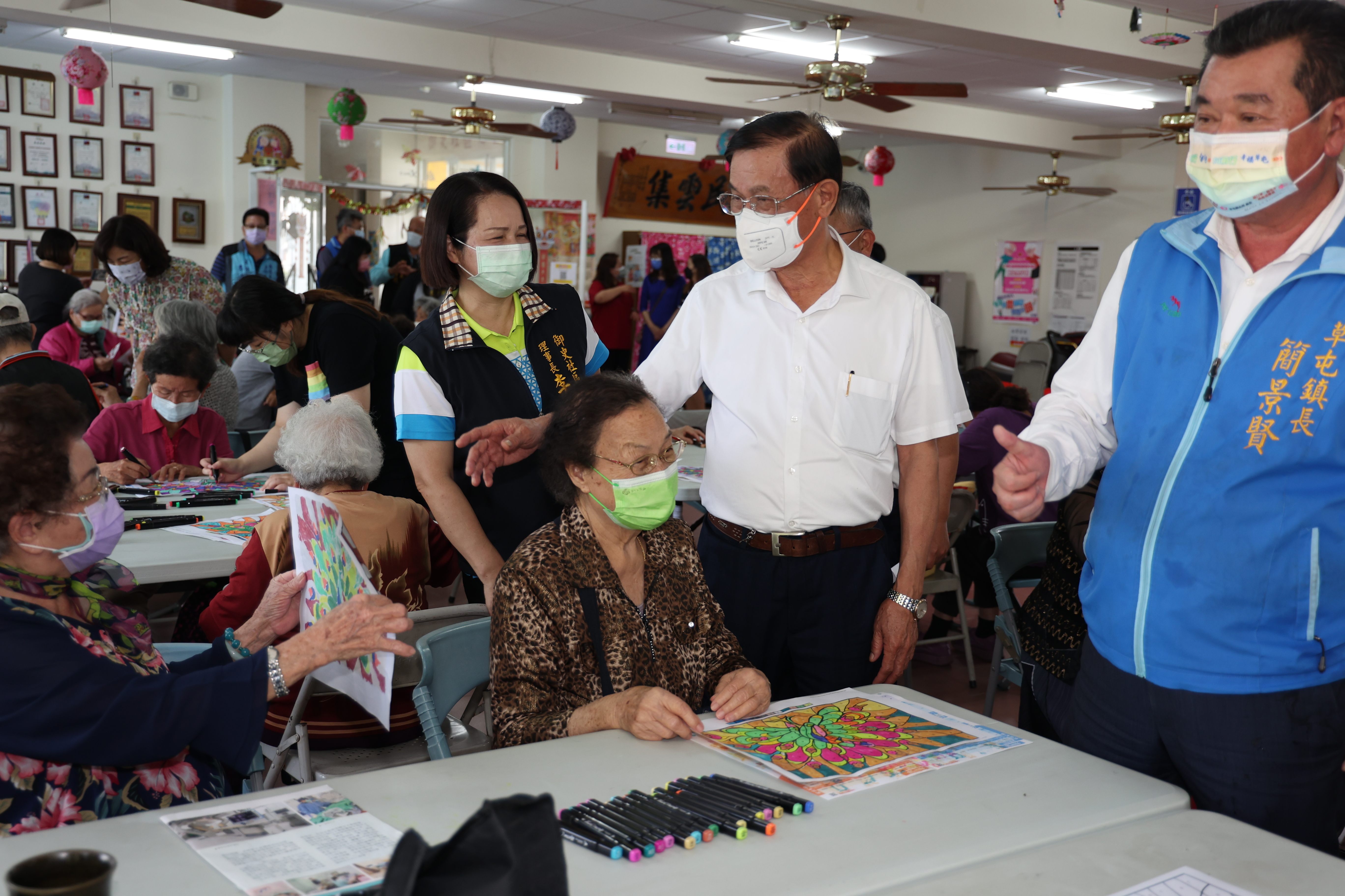 林縣長一行依序南埔社區發展協會、御史社區發展協會及新庄社區發展協會,看到阿公阿媽認真作畫,能在長照學習新興趣與技藝,又能和老朋友一起享用營養好吃「共餐」,林縣長說,長照據點扎根到村里社區非常重要,他特別送來兩萬元加菜金,希望讓長輩也吃得更「澎湃」更歡喜。