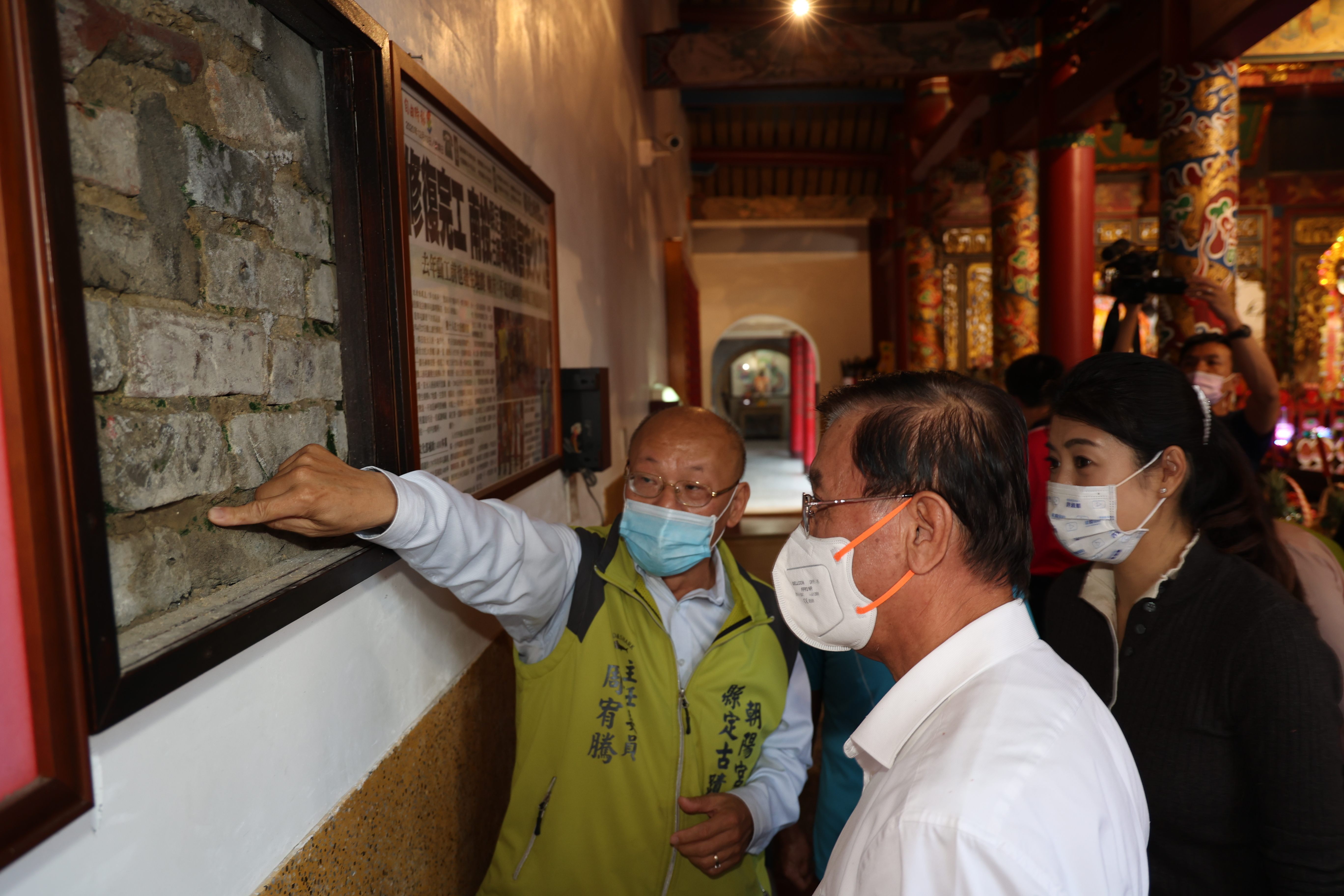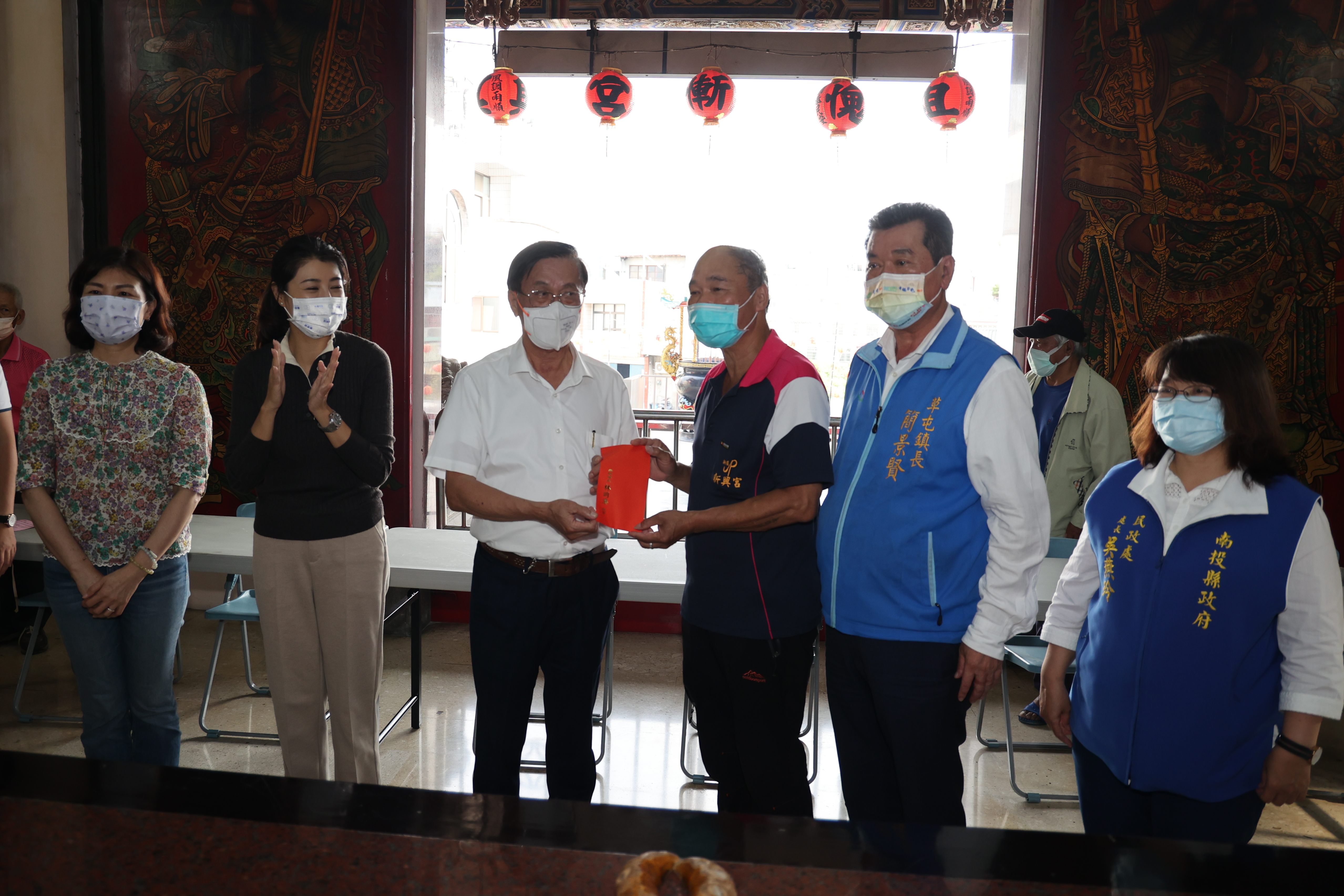 林縣長也參拜了新庄里新興宮慚愧祖師及北投里朝陽宮天上聖母媽祖,林縣長獲悉新興宮長輩信眾登樓參拜祖師公的辛苦與不便後,也交代民政處與草屯鎮公所協商,盡力找出合法適當的協助辦法;針對朝陽宮獲列縣定古蹟的後續文物維護與發揚,林縣長也允諾全力協助。