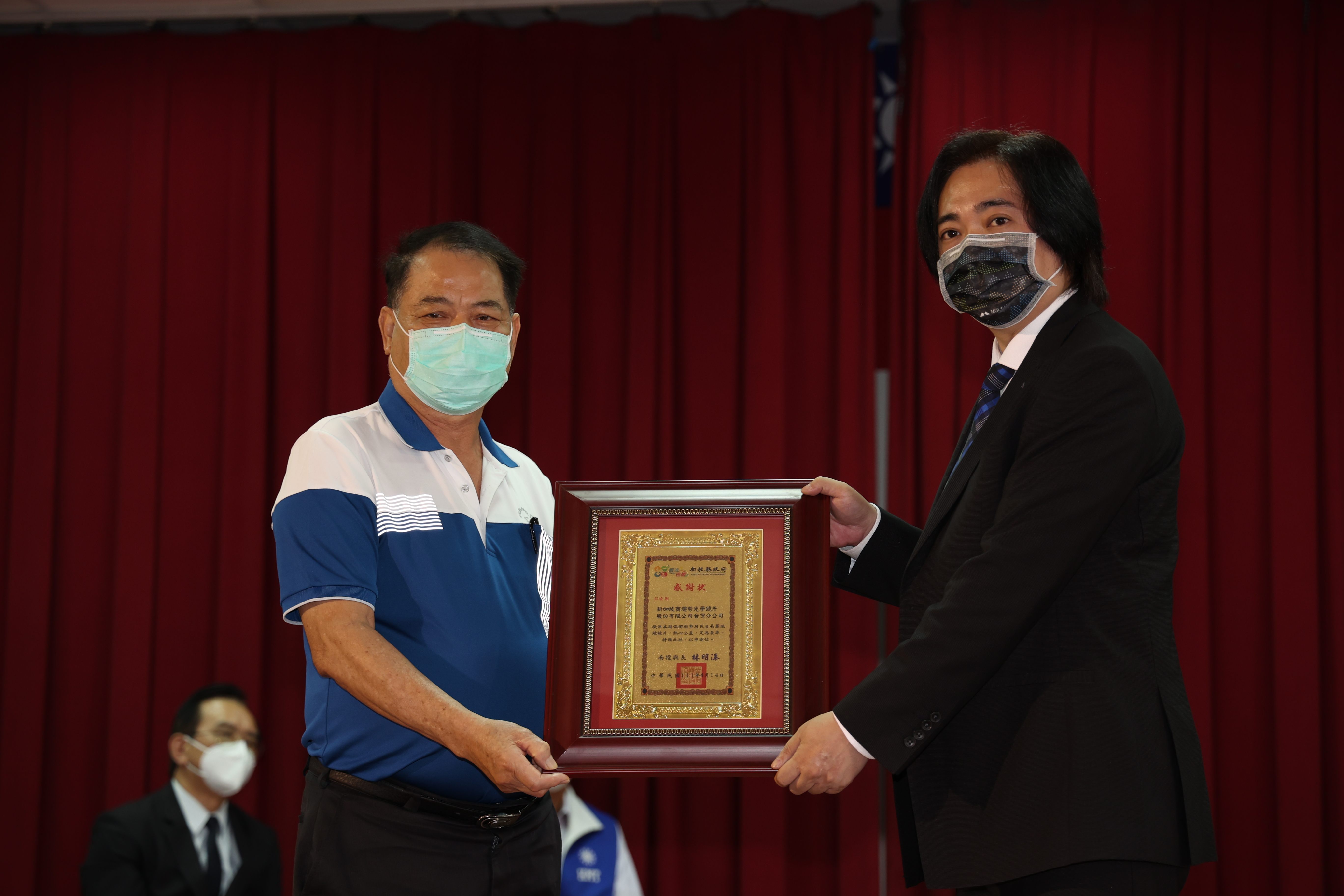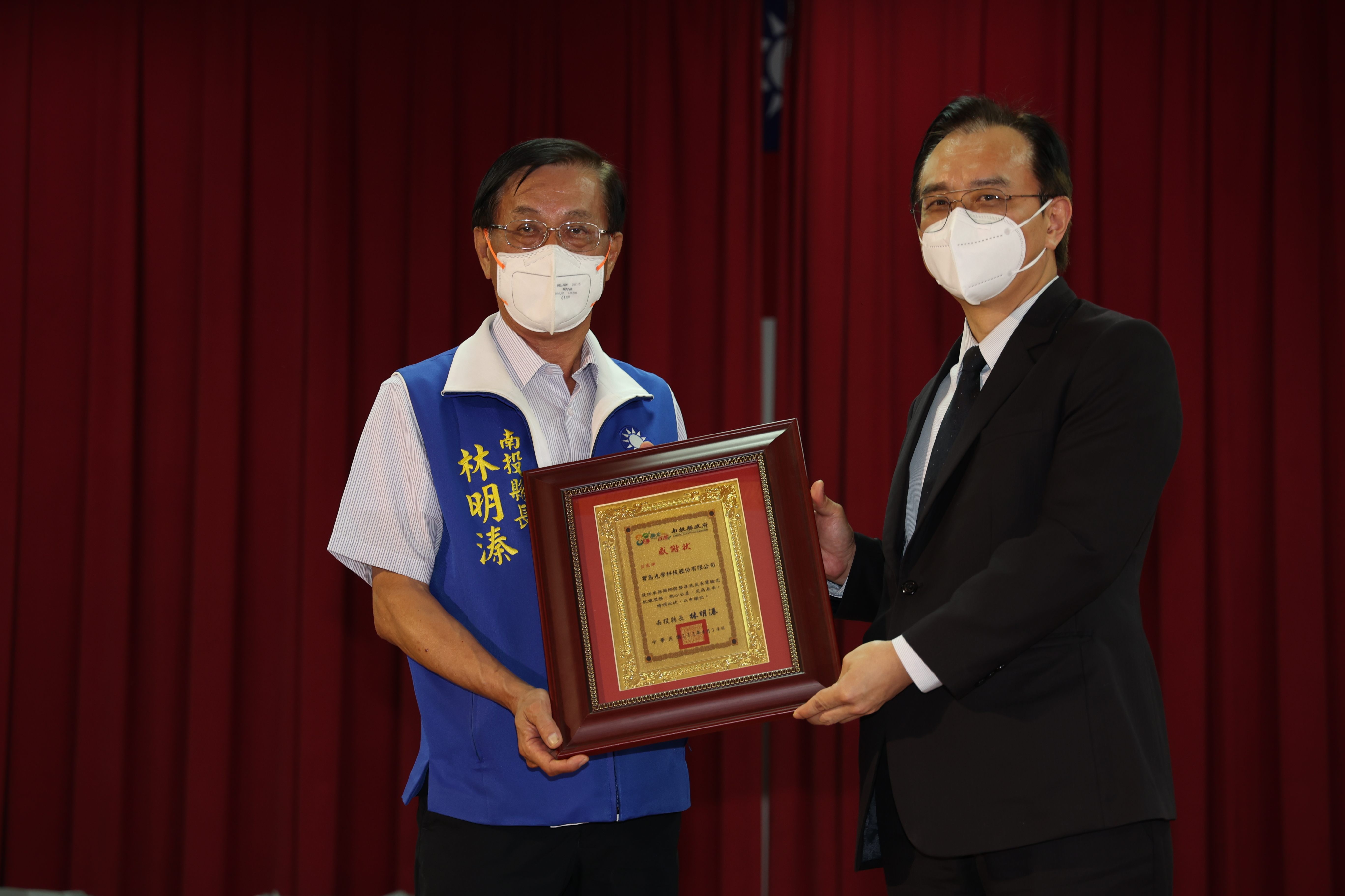 28日包括寶島公司副董事長蔡國平、 加坡商趨勢光學台灣分公司總監張茗凱、南投縣驗光師公司會理事長牛方澤都到中寮鄉公所,除由林縣長致贈感謝狀給寶島蔡副董事長,中寮鄉長廖宜賢也致贈感謝狀給趨勢光學張總監。