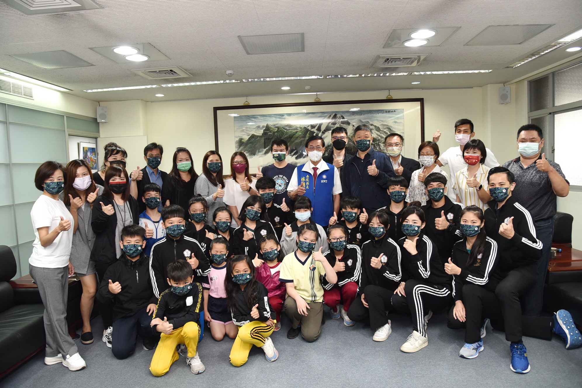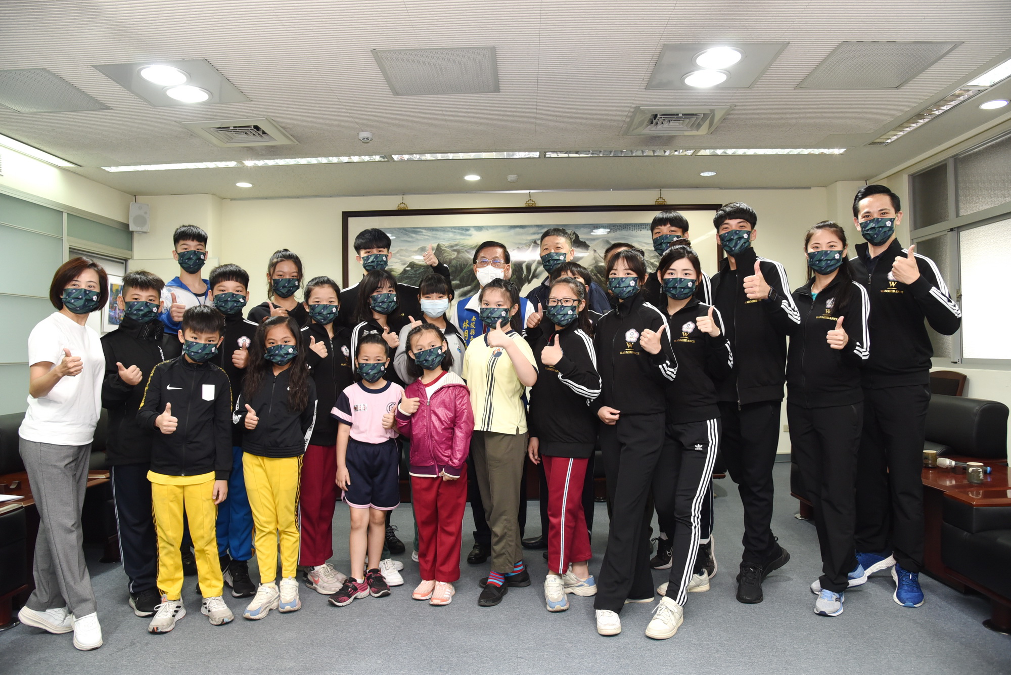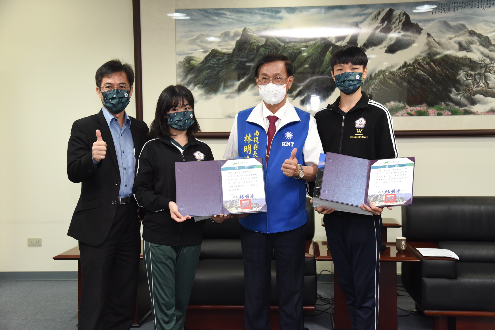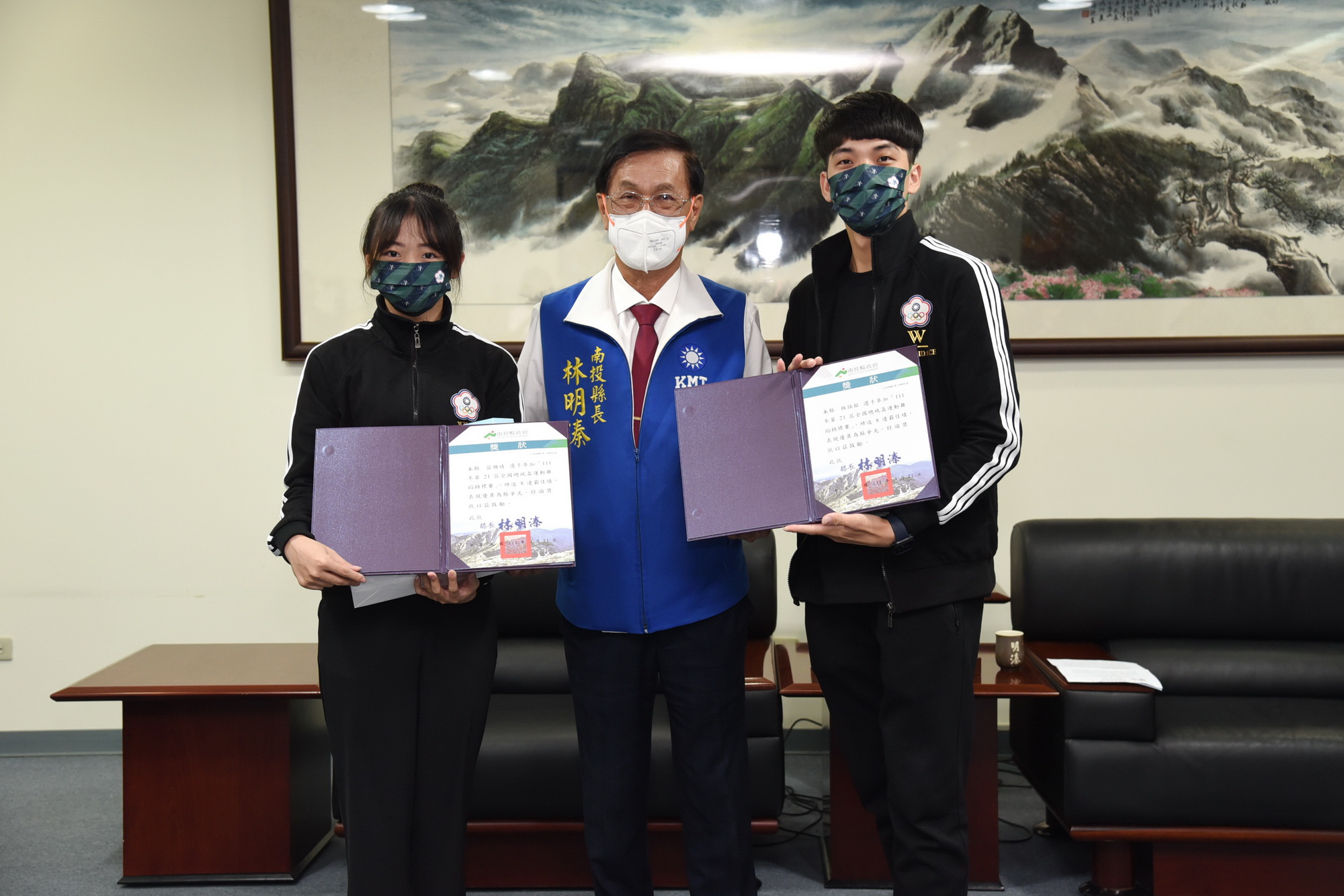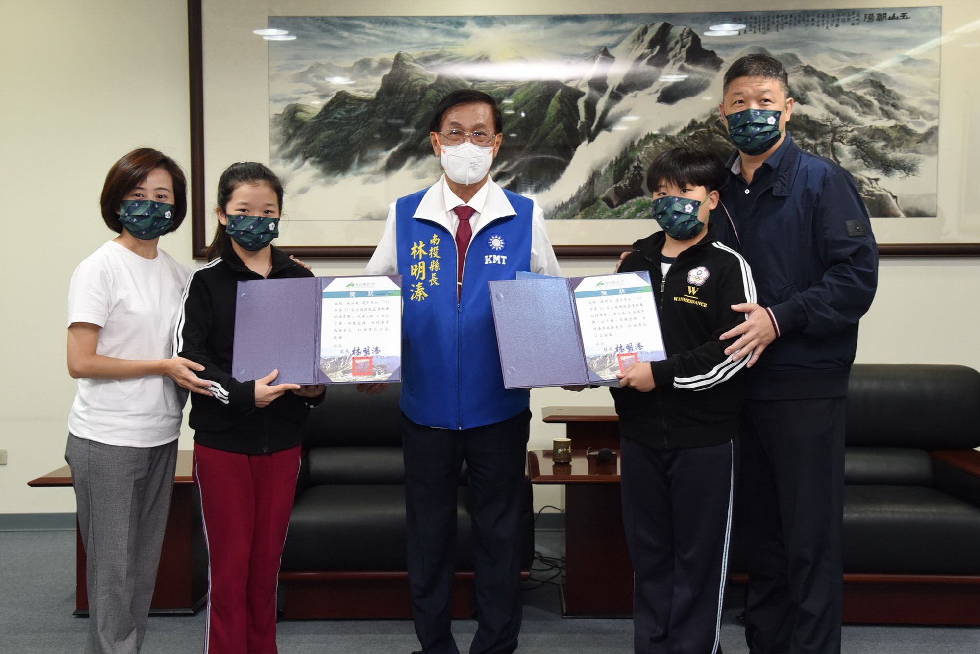 南投縣運動舞蹈代表隊在「111年度第21屆全國總統盃運動舞蹈錦標賽」大放異彩,共獲5金8銀7銅的佳績,縣長林明溱4月21日上午在縣長室接見表揚,除讚揚肯定選手優秀表現外,也依序頒發獎狀給前三名的選手及教練,期望大家都能繼續加油,不斷突破自我,為南投縣爭光。