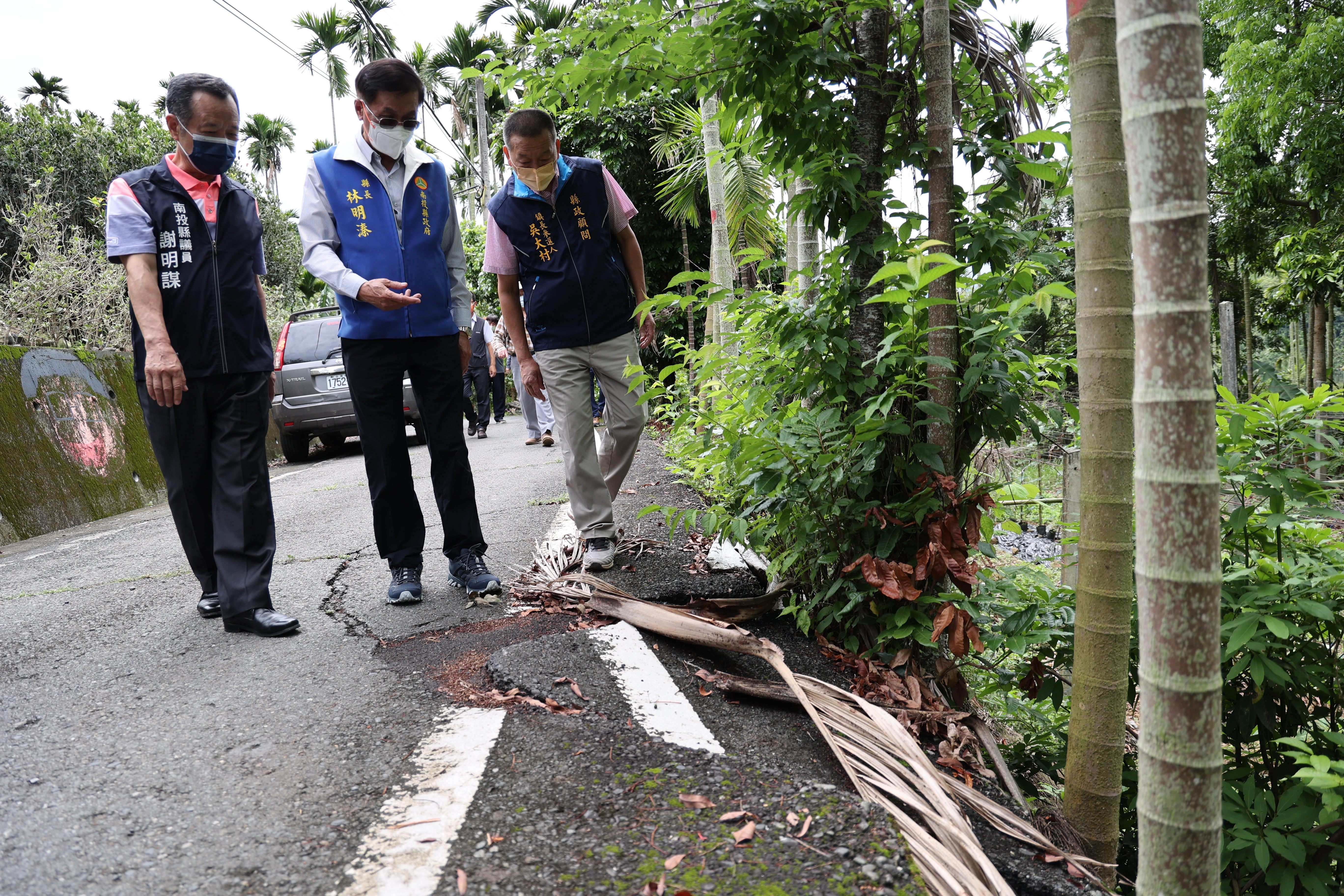 最後林縣長到富山里會勘了柴橋頭段洞角小段583-6地號農路、犁頭巷道路改善工程,各簽核30萬、50萬元費,將改善總長達280公尺、寬2.5公尺的路面,林縣長指出,富山里的兩條農路不僅路面崎嶇,還出現路基淘空塌陷狀況,將在改善路面的同時,將現有水溝改成L型溝,讓路寬變大方便會車。