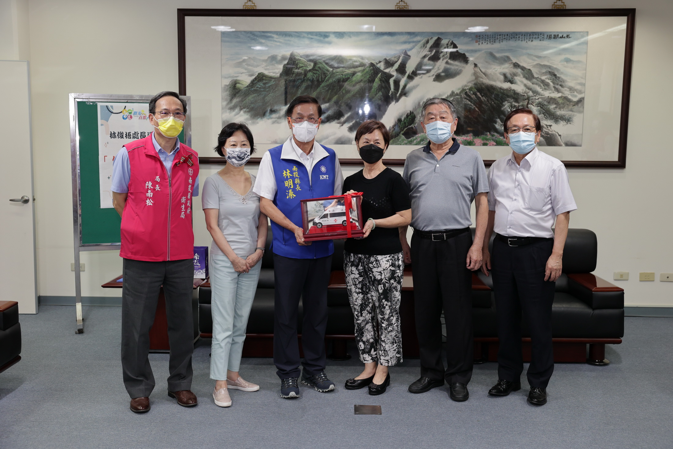 救護車捐贈儀式11日下午在縣長室舉行,由林前處長夫人張瑩芳、大哥林金鏞、二哥林俊源、兒子林奕龍、乾女兒簡嘉琳及謝佳君等人共同捐贈,縣長林明溱代表接受,縣議員張嘉哲、縣府衛生局長陳南松、副局長吳美玲及衛生局所有主管都到場見證,感謝林家的愛心。