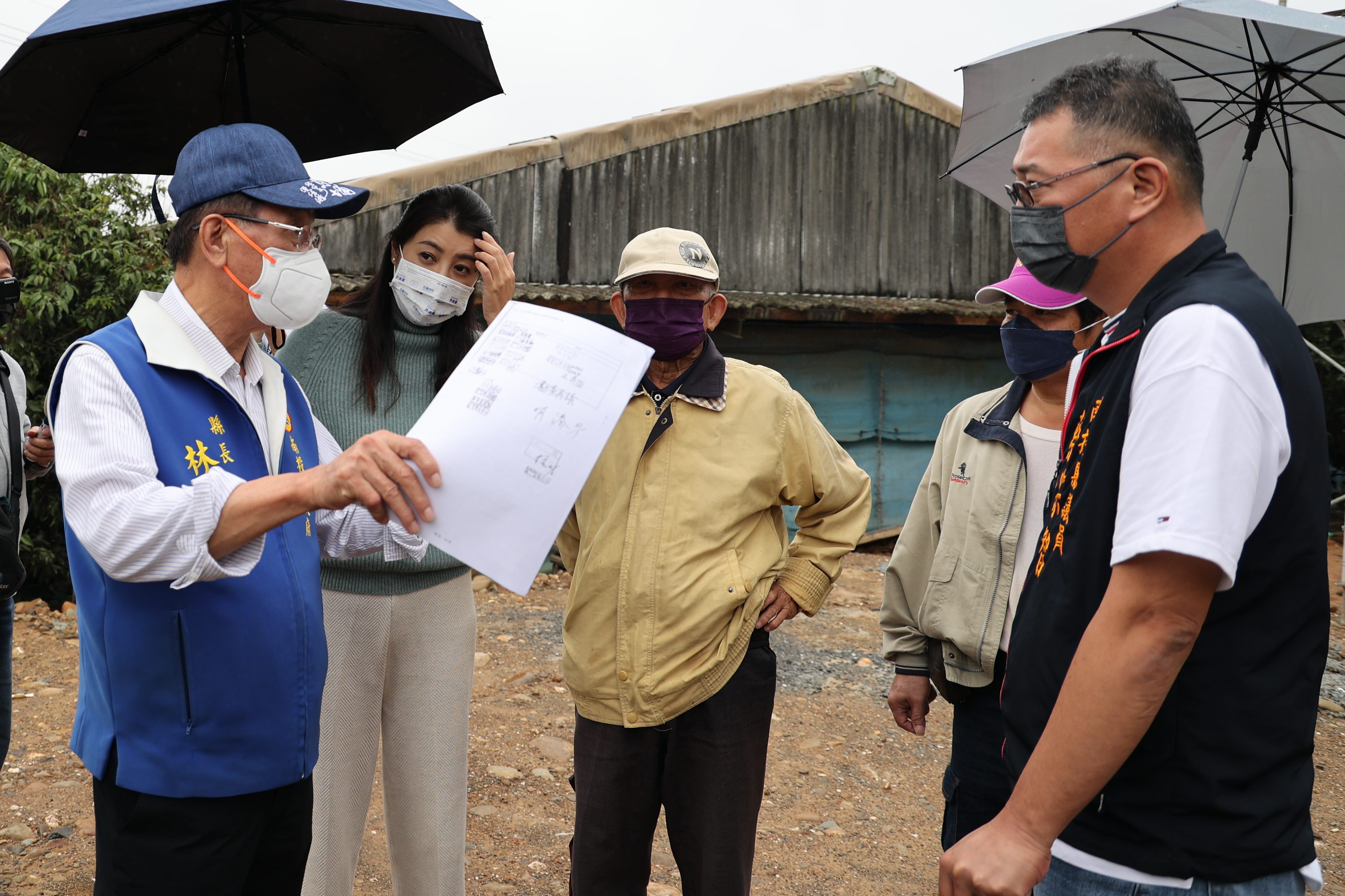 名間鄉大庄、崁腳、東湖等村兩條野溪護岸、兩條社區巷道及一處區域排水支線護岸基礎,分別出現淘空破損等問題,縣長林明溱接獲陳情17日下午冒雨會同立委許淑華逐一實地會勘,在原估項目外再加碼,簽核經費從原本的不到600萬元增加到700萬元,並責成工務、農業處優先測設發包務求儘速改善。