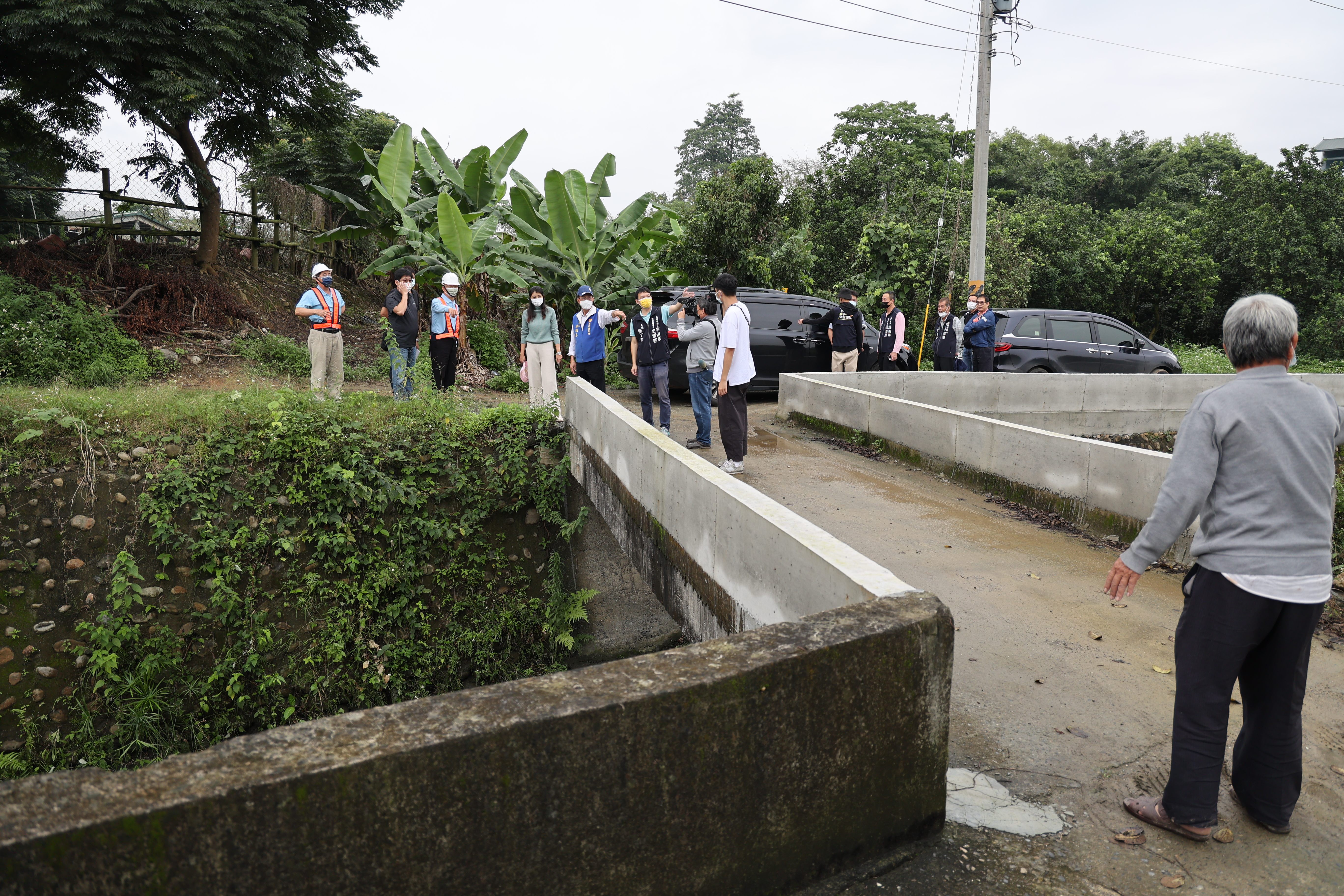 最後,林縣長轉往名間親子公園後方的區域排水番仔寮排水支線會勘,當地陳情農友憂心的反映說,這段大排基礎淘空塌陷,就曾水滿外溢導致附近的農場淹大水損失慘重,林縣長會勘後,除允諾在原估計的約145萬預算內,補強左右兩側共60公尺的砌卵石護岸,增設24公尺護欄,修補下陷的堤頂路面寬1.5公尺長10公尺外,林縣長說,他也發現現有連通兩岸的橋面過彎呈直角,非常危險,同時溪畔還有屬於縣有的苗圃土地,將分別改善橋面過彎曲度,另外在苗圃空地增設迴轉道,讓前來利用迴轉的親子公園遊客行車更方便安全,也因此要加碼增加經費到約250萬元。
