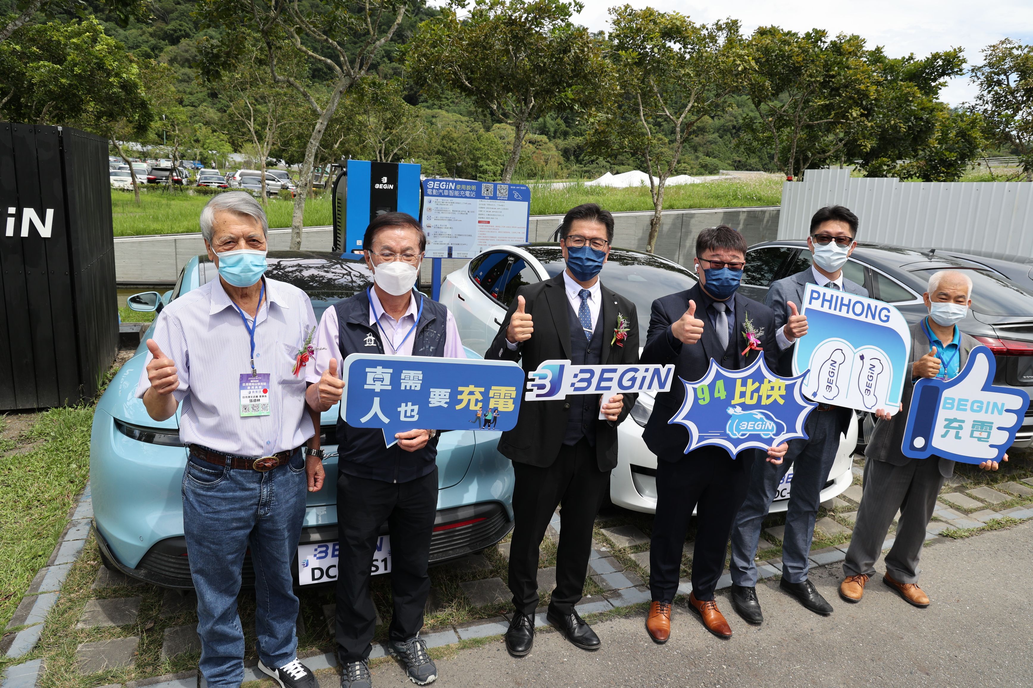 台灣碳資產公司攜手交通部觀光局日月潭國家風景區管理處、飛宏科技,以及台灣保時捷,共同努力發展南投縣綠色觀光,14日在日月潭向山遊客中心,舉辦BEGIN 電動車智能快充站啟用典禮,縣長林明溱、立法委員馬文君,日月潭國家風景處處長簡慶發、日月潭文武廟董事長張德林及立委許淑華主任賴聰耀等眾多貴賓出席,林明溱縣長並與台灣碳資產公司董事長張三河,共同啟動電動車快充座。
