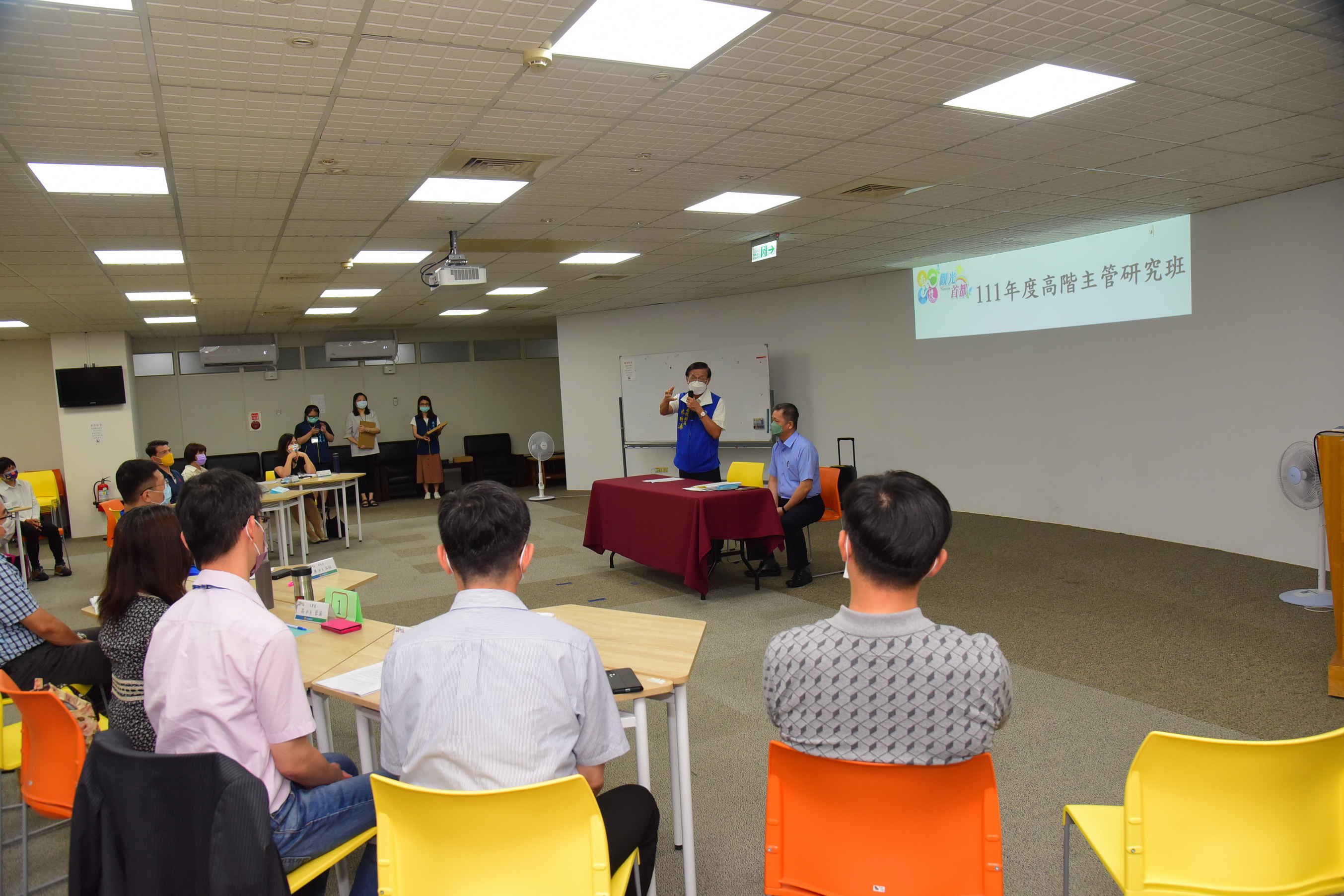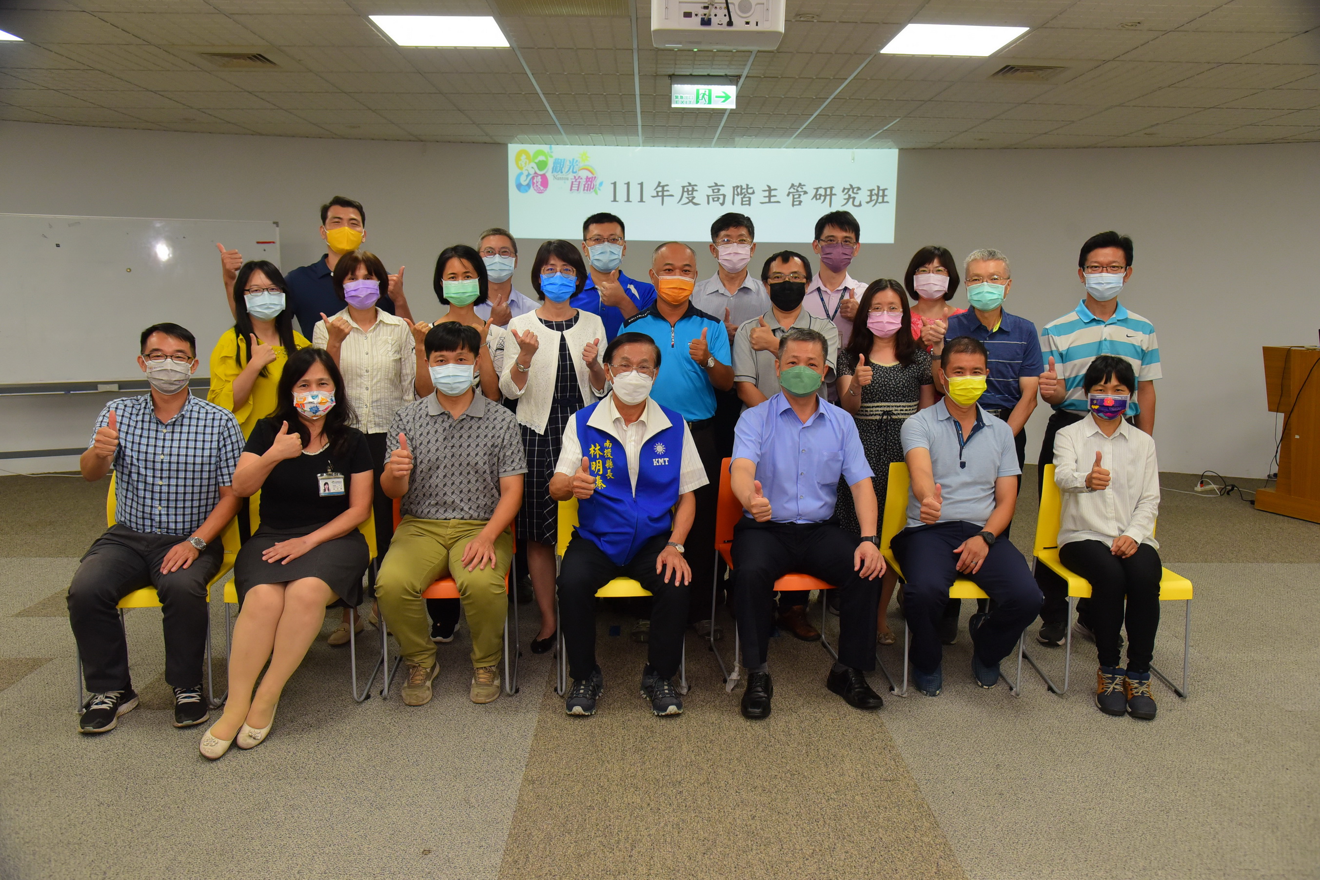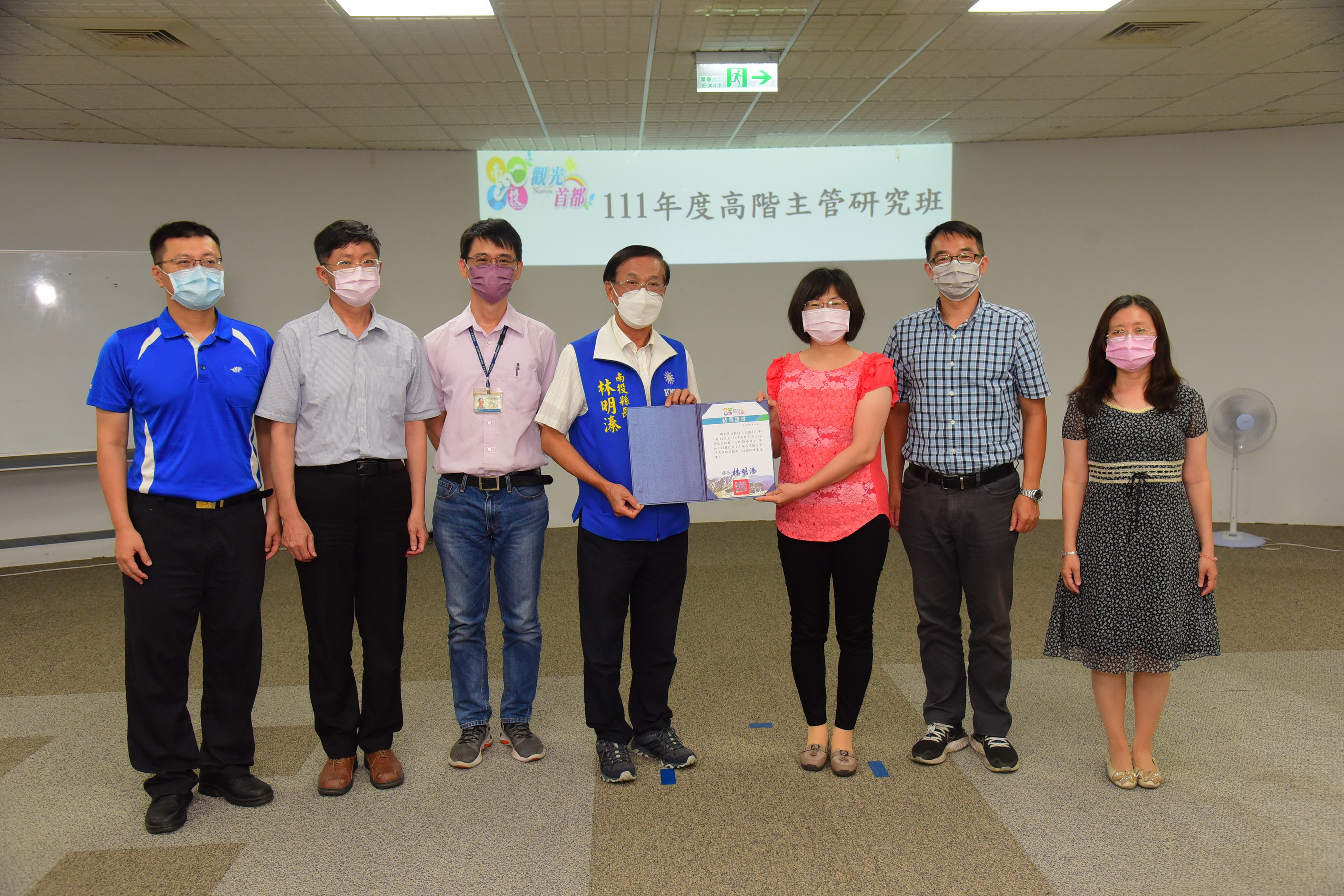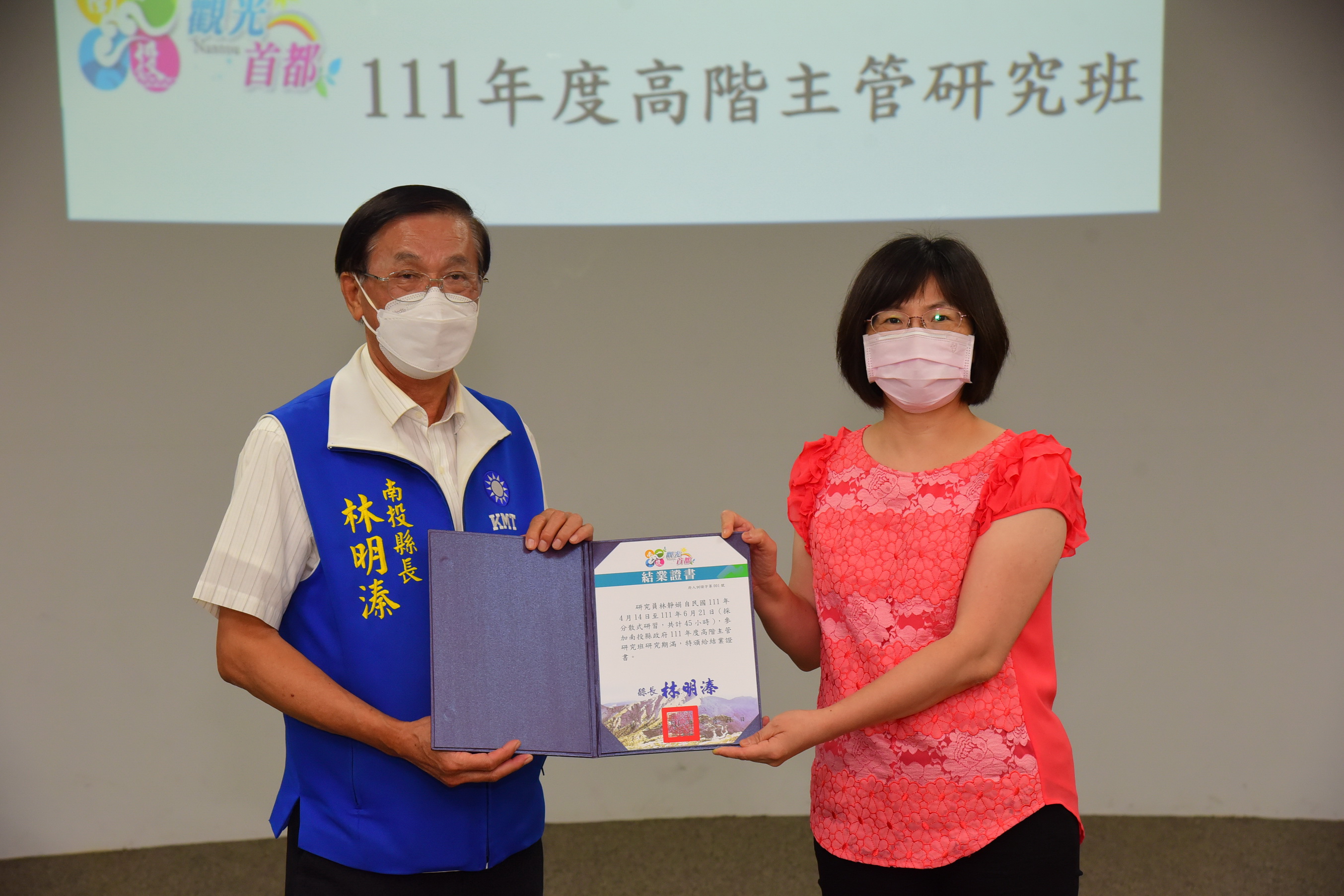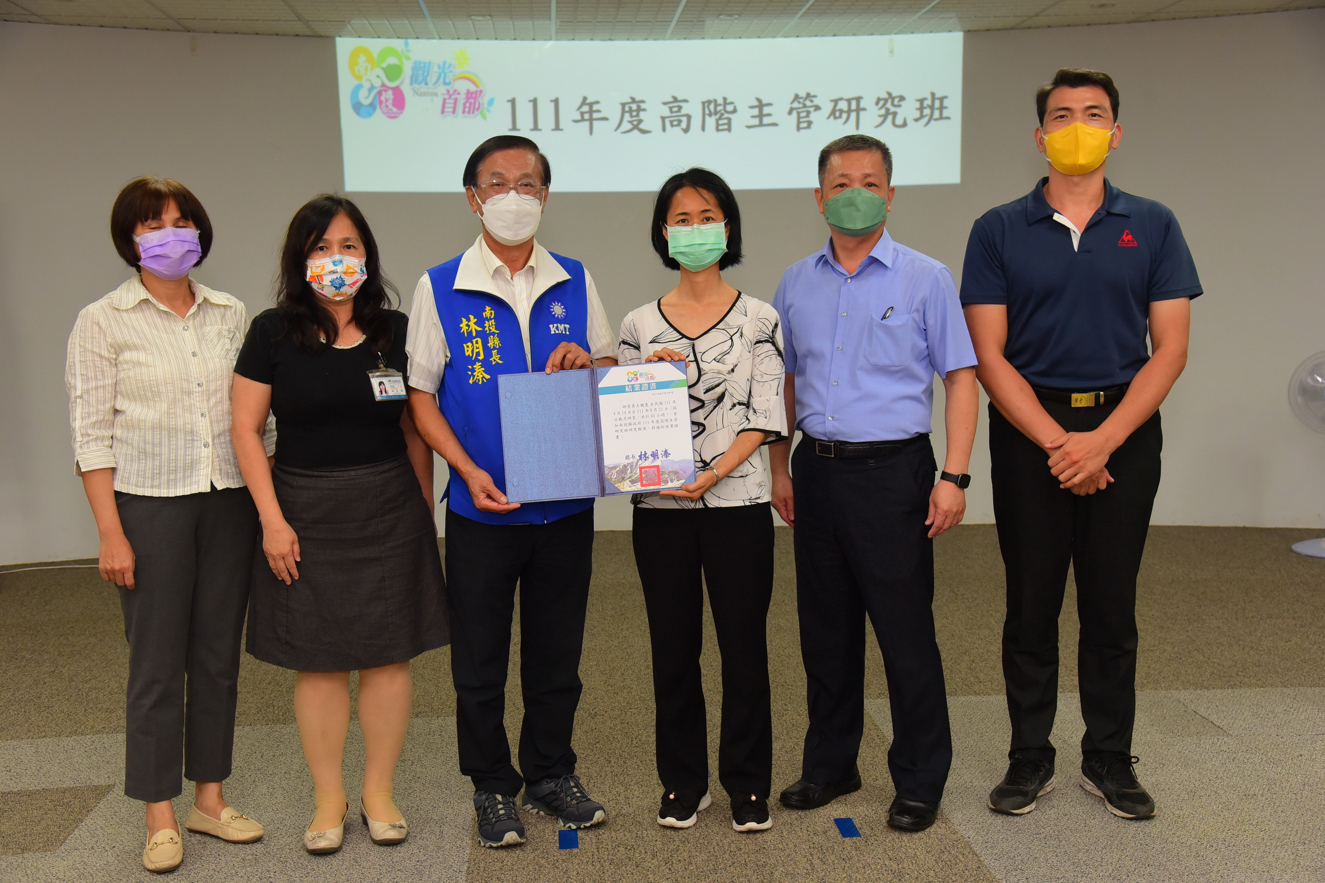 縣府21日下午在綜合大樓1樓跨領域橋接創新學苑舉行「 111年度高階主管研究班結訓活動及座談」,縣長林明溱出席勉勵及頒發結業證書,過程簡單隆重;會中也安排成果展現(各組專題研究報告與提問情境模擬),課程回顧與意見交流等,內容切合縣政方針,互動熱絡。 林明溱說,為培育所屬高階主管人員,強化實務問題研究與區域治理及應變之能力,由人事處於4月14日至6月9日期間辦理此為期8週,共計45小時分散式學習的高階主管研究班,參加對象以職務跨列簡任第10職等人員與跨列薦任第9職等的主管人員,且今年度核定參加薦任公務人員升簡任官等訓練者優先,參訓的主管人員都是縣府優秀人才,透過此專班作為文官學院的先修班,未來能順利通過培訓,成為縣政推動的基石;課程邀請專家學者擔任講師,課程從管理、領導、協調合作,循序聚焦縣政重大政策等,藉由各個參訓主管運用所學及與專家共同討論後所做成之研究報告,達成精進四個縣政專題的政策方案與成效目標,以實現南投縣之施政願景。 縣府人事處也表示,這個專班邀請了東海大學行政管理與政策學系教授陳秋政、静宜大學人力資源管理學系教授岑淑筱及中正大學政治學系教授李翠萍等講師,講授「策略管理」、「團隊領導與部屬培育」、「跨域協調與合作」、「政策規劃執行與評估」、「危機管理(含風管理)」、「策略績效管理」及「公共議題溝通策略」等課程,同時以分組方式進行專題研究與情境問題研擬之練習,除讓理論與實務相互印證,以達到即學即用之學習成效外,尤其是各組的專題研究,涵蓋「南投燈會」、「好食民宿」、「地震防減災」、「新住民生活適應」等專題,都是南投縣推動「觀光首都」與「宜居城市」之重大政策。