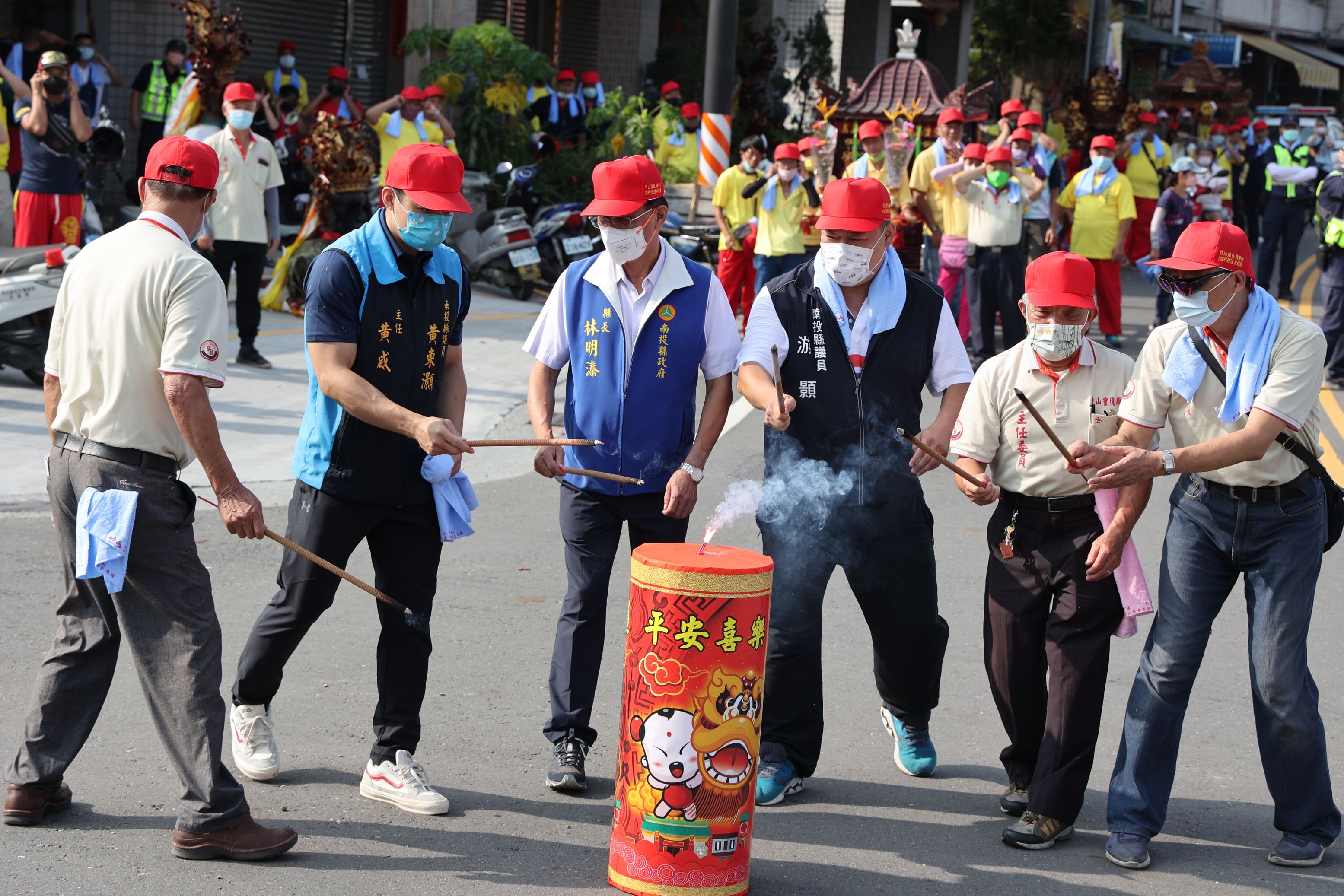 林縣長指出,今天適逢竹山靈德廟城隍爺千秋聖誕,廟方執事人員及信眾非常虔誠熱情為城隍爺盛大祝壽,並敦請城隍神尊出巡遶境,庇佑竹山及南投縣闔境平安順利,疫情早日消弭,全縣無災民眾家庭幸福美滿都能過快樂的日子,他更特別祈求城隍爺庇佑南投縣政推動一切平安順遂。