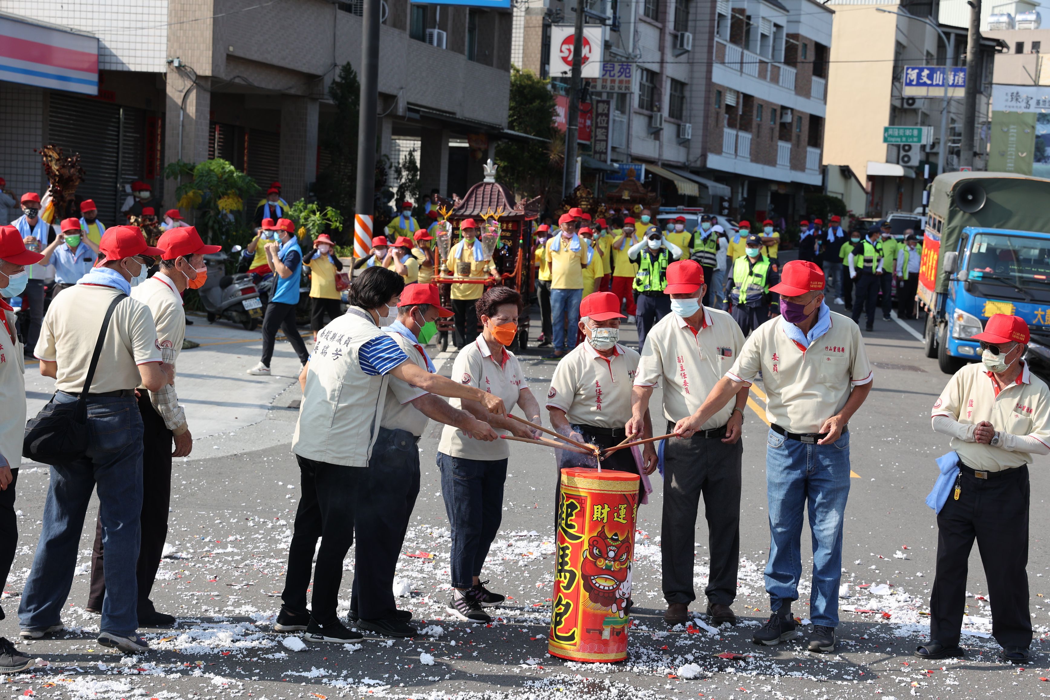 竹山「城隍爺生」出巡遶境祈福活動,13日農曆6月15日一早,在竹山鎮星期四夜市廣場集結陣頭車隊,並由縣長林明溱、縣議員游顥、縣議員黃東灝主任黃威、靈德廟主委林信雄共同點燃第一響起馬炮,竹山鎮長陳東睦、縣議員吳瑞芳等貴賓也和靈德廟眾執事人員,接續點燃第二及第三響起馬炮,隨著震天價響的隆隆炮聲傳出,城隍爺神尊鑾轎,也在七爺、八爺等眾神將及神轎華蓋前導下,緩緩啟動出巡,盛大的城隍爺神轎陣頭綿延數百公尺熱鬧滾滾。