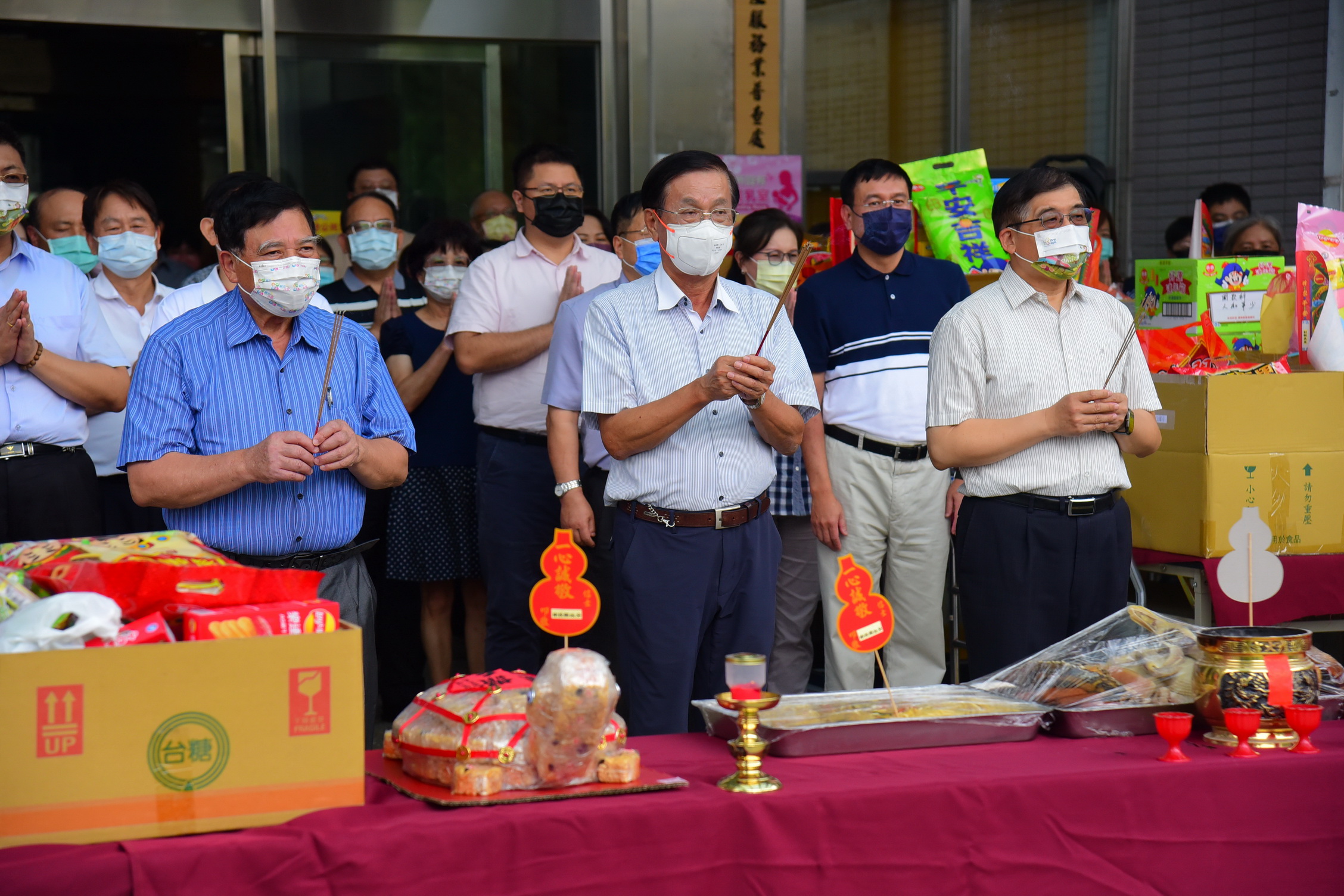 當天普渡祭拜,各單位皆準備供品,擺設於縣府門口供桌,儀式於下午2點準時開始,林縣長、陳副縣長及洪秘書長手持清香,縣府同仁雙手合十,依循三上香儀式進行,緊接著縣長手捧疏文一拜後,由民政處同仁誦讀中元祈安消災植福疏文,祈求風調雨順、國泰民安、疫情早散、春迎百福、夏納千祥、秋獲平安之兆、冬沾泰來之慶,過程莊嚴隆重。