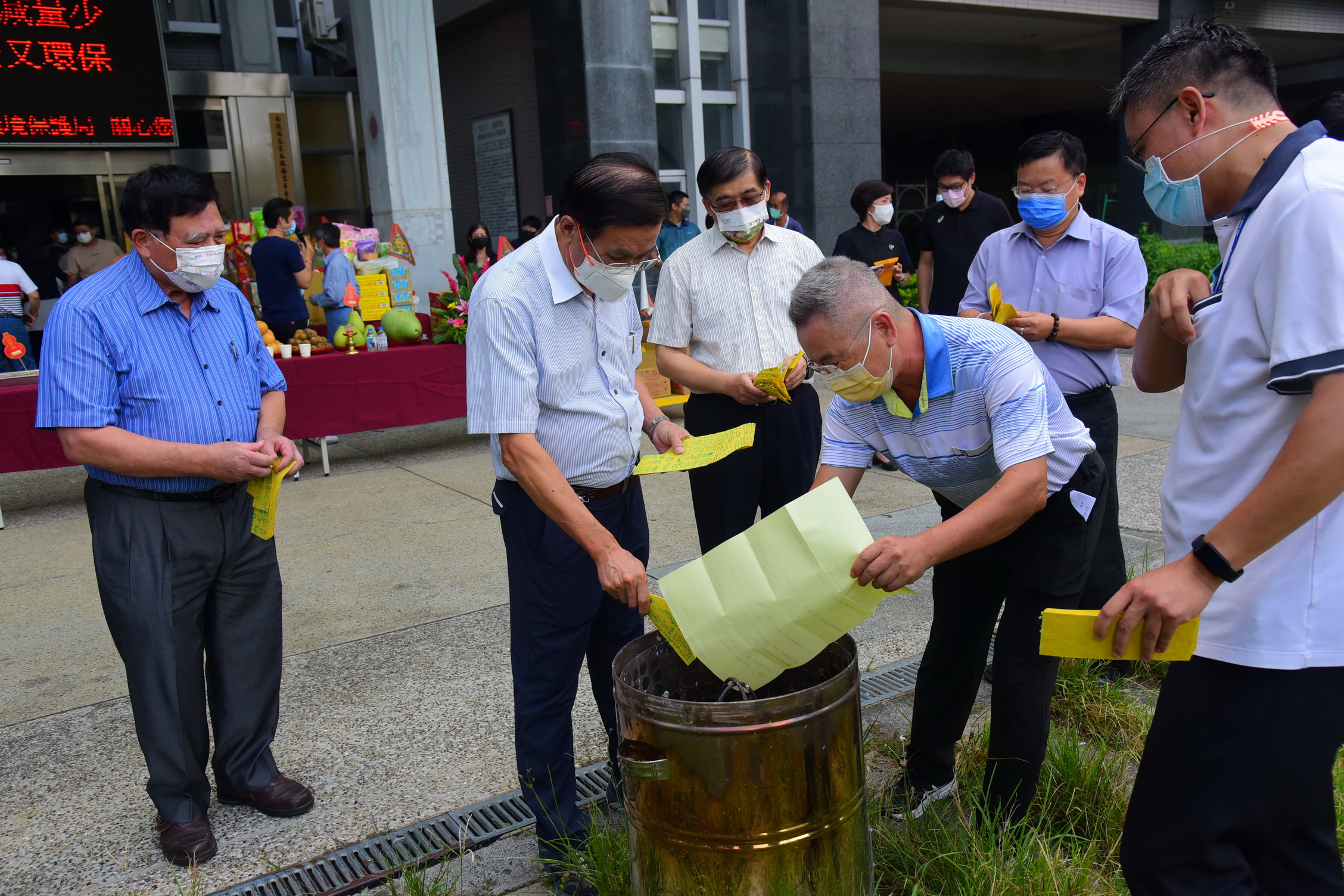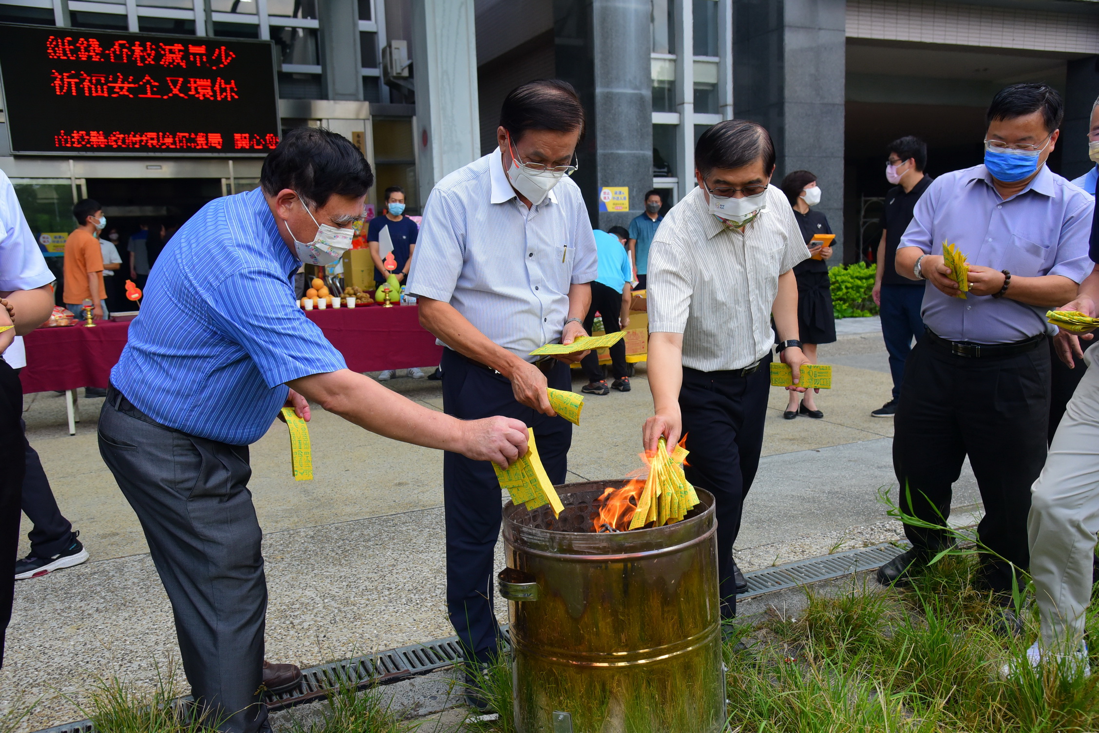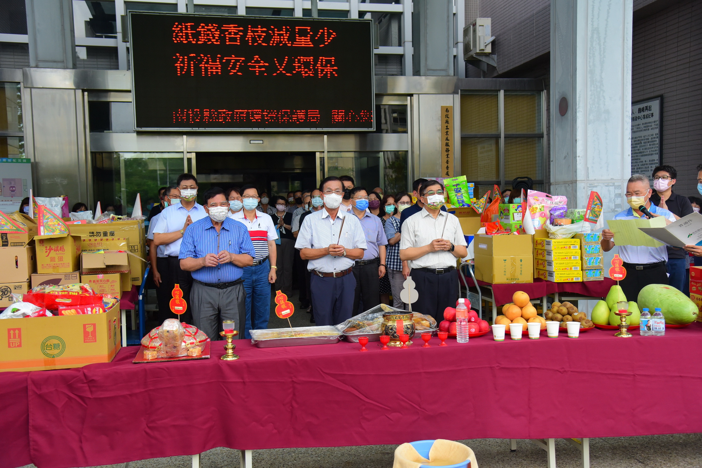 新聞及行政處表示,為了維護空氣品質,提倡環保減碳,今年中元祭拜儀式,只由縣長、副縣長及秘書長代表持香,紙錢也僅象徵性焚燒,其餘紙錢則運送至資源回收焚化廠統一處理。
