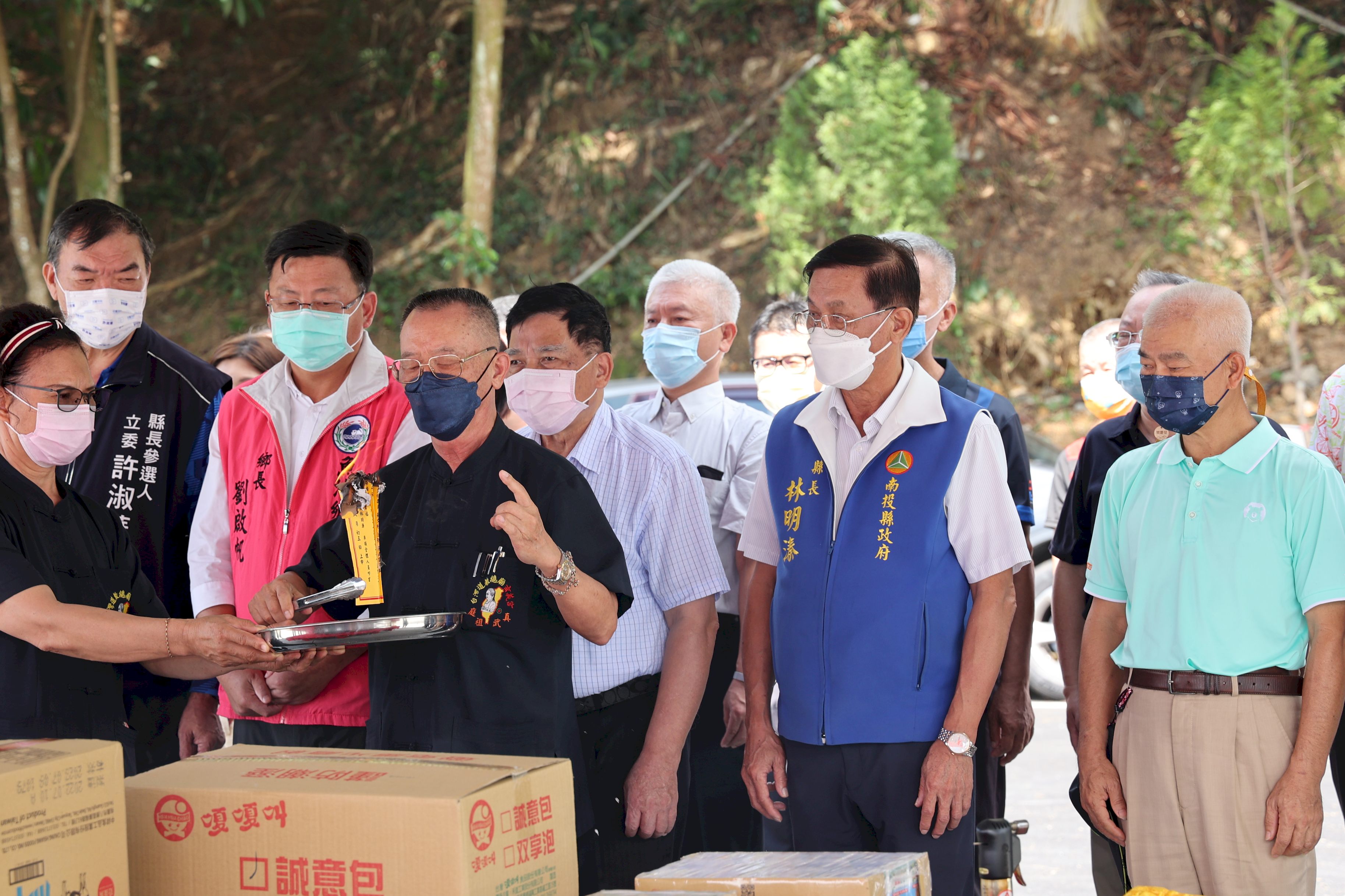 第40屆2022日月潭萬人泳渡祈福獻禮儀式,包括林縣長、簡處長、副縣長陳正昇、教育處長陸正威、魚池鄉長劉啟航、立委許淑華服務處主任賴聰耀、立委馬文君祕書聶博科及多位校長、日月潭地方仕紳都出席,典禮循往例由玄義宮法師引領科儀祭拜,在眾人虔誠上香後,依序由林縣長、陳副縣長、簡處長獻花、獻果、獻財帛,再由法師恭稟疏文,林縣長點燃疏文上達天聽後,眾人行三躹躬禮,祭儀圓滿禮成。