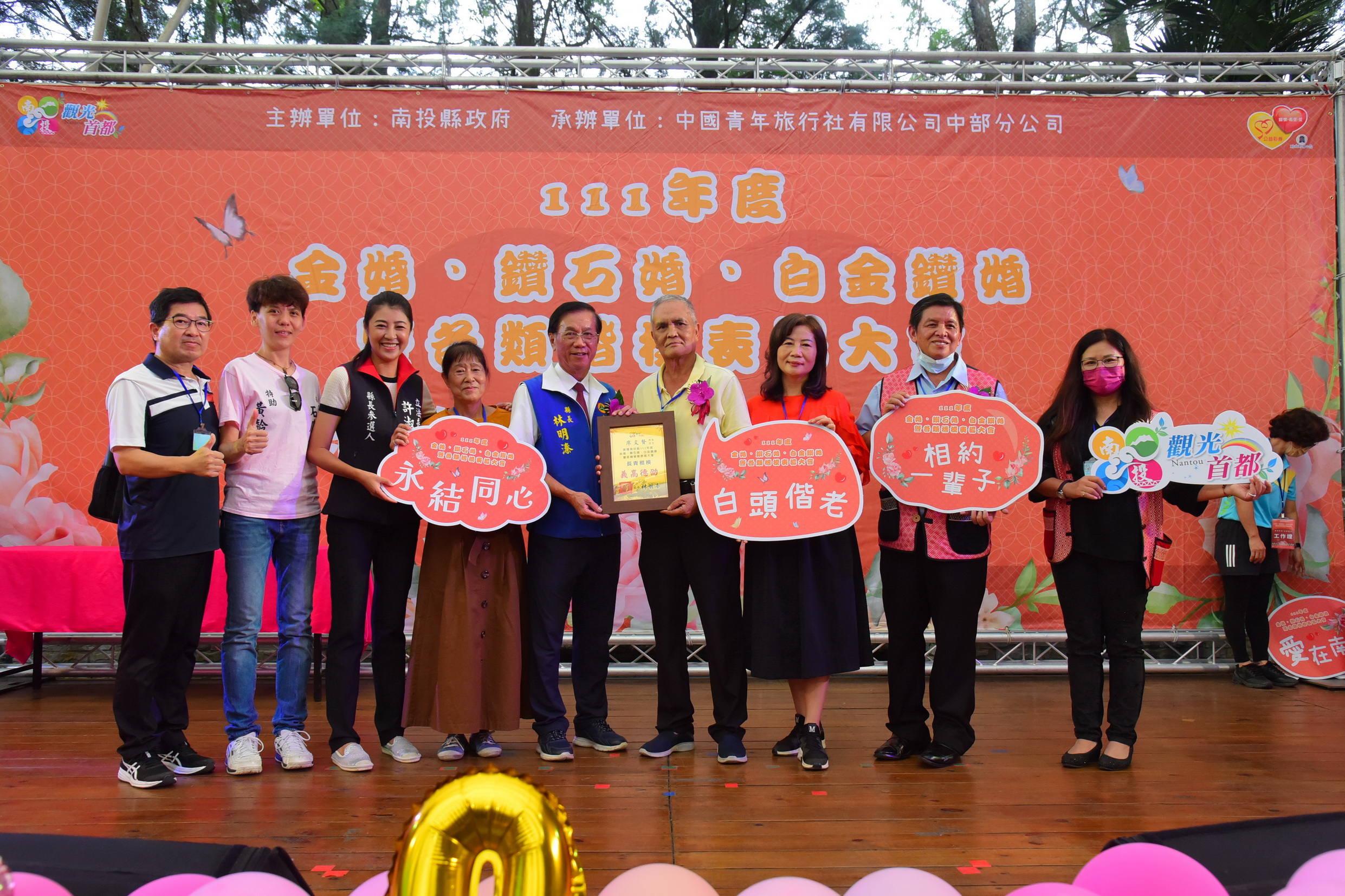 縣府為表達對結婚 50 年以上之佳偶的尊重和敬意,祝賀本縣攜手一甲子之夫妻並弘揚敬老精神,6日起於九族文化村分二梯次辦理金婚、鑽石婚、白金鑽婚暨各類楷模表揚大會活動,縣長林明溱出席與佳偶們一同歡慶、分享最幸福感動的時刻,當天有來自埔里鎮、竹山鎮、中寮鄉、鹿谷鄉、魚池鄉、國姓鄉的金婚、鑽石婚、金鑽石婚佳偶,以及各鄉鎮之長青楷模、敬老楷模及老人團體績優楷模等代表到場接受表揚,場面隆重溫馨。