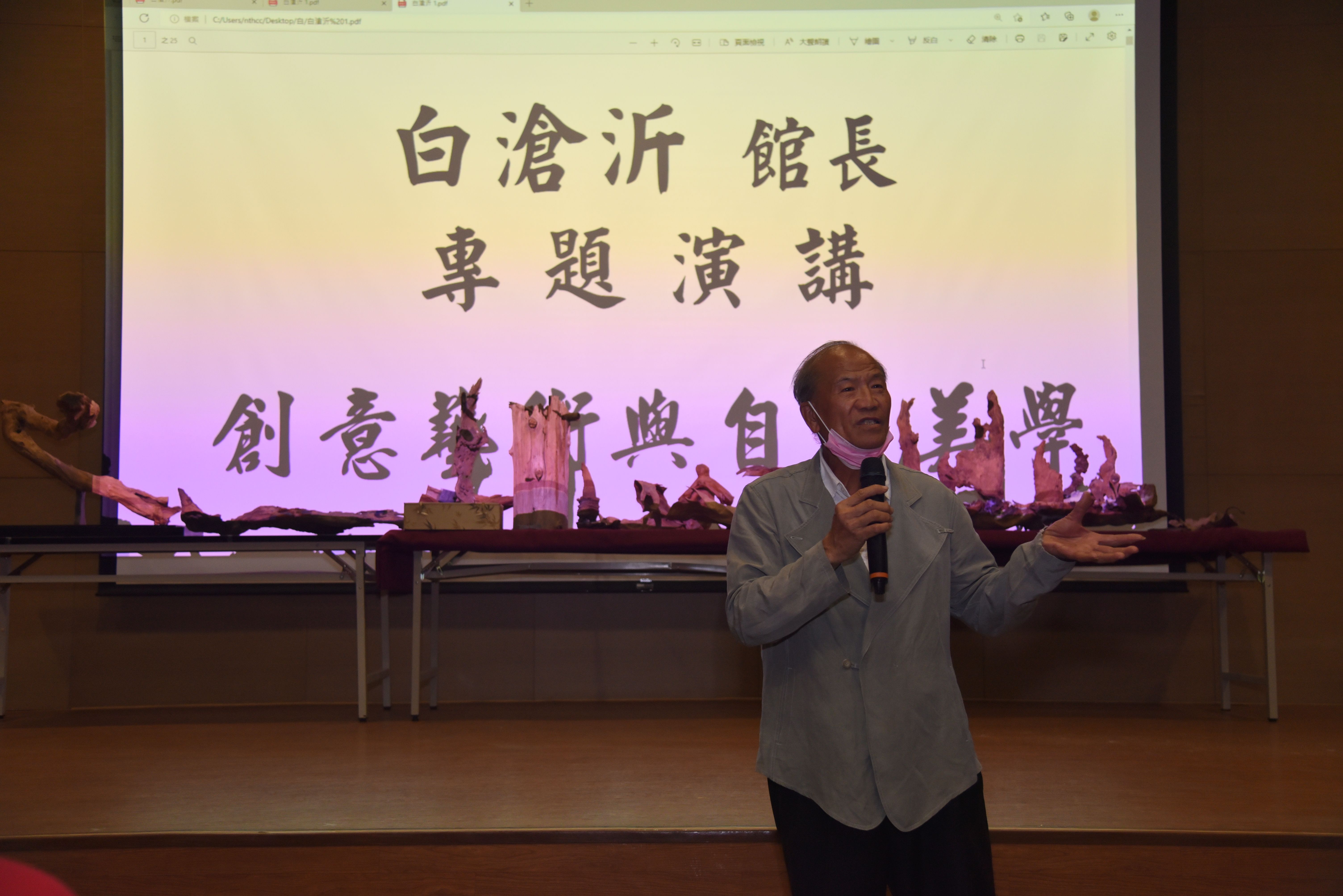 白館長進行專題演講「創意藝術與自然美學」時,首先分享他創作靈感與小時候的生活環境有關,靠近溪邊的家鄉,最初撿拾木頭的動力是為了幫忙家裡燒柴火,與這些上天賜予的材料感情日益深厚,也尊重所有材料的天然外型;演講中他還將場地燈全部關閉,由他手中的手電筒照射光芒,將作品的影子投影在布幕上,利用光影呈現出形似諸多菩薩與佛像的群像,傳達「心中有佛,則所見皆佛」的意象。