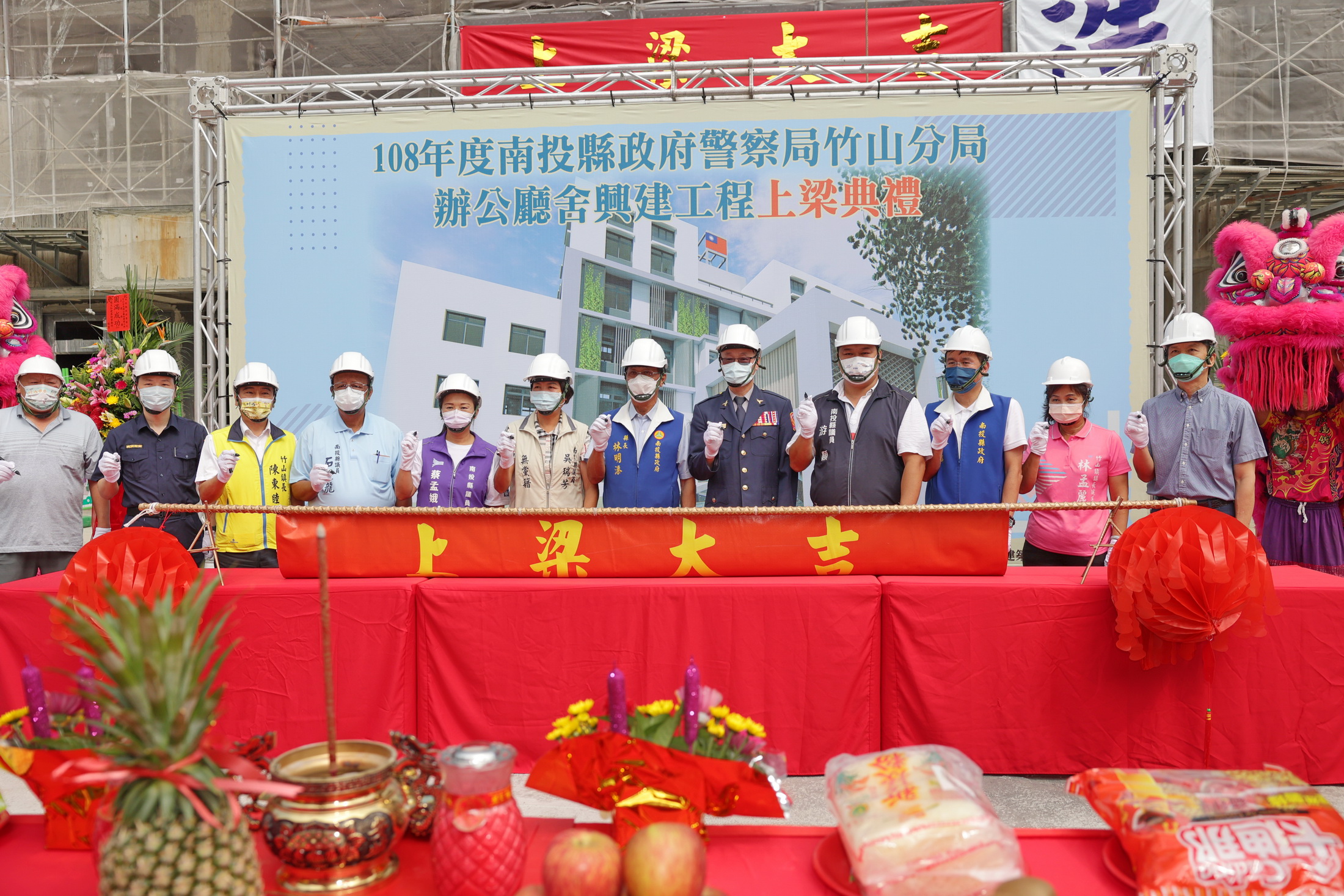 南投縣政府警察局竹山分局24日上午在新建基地舉行辦公廳舍興建工程上樑典禮,典禮簡單隆重,縣長林明溱到場主持,並與縣議員蔡孟娥、游顥、吳瑞芳、石慶龍、縣警局長黃永志、縣府建設處長李正偉、竹山鎮長陳東睦等出席貴賓進行焚香祝禱祈福及上樑題字儀式,一同見證興建工程完成階段性目標,邁向新的里程碑。