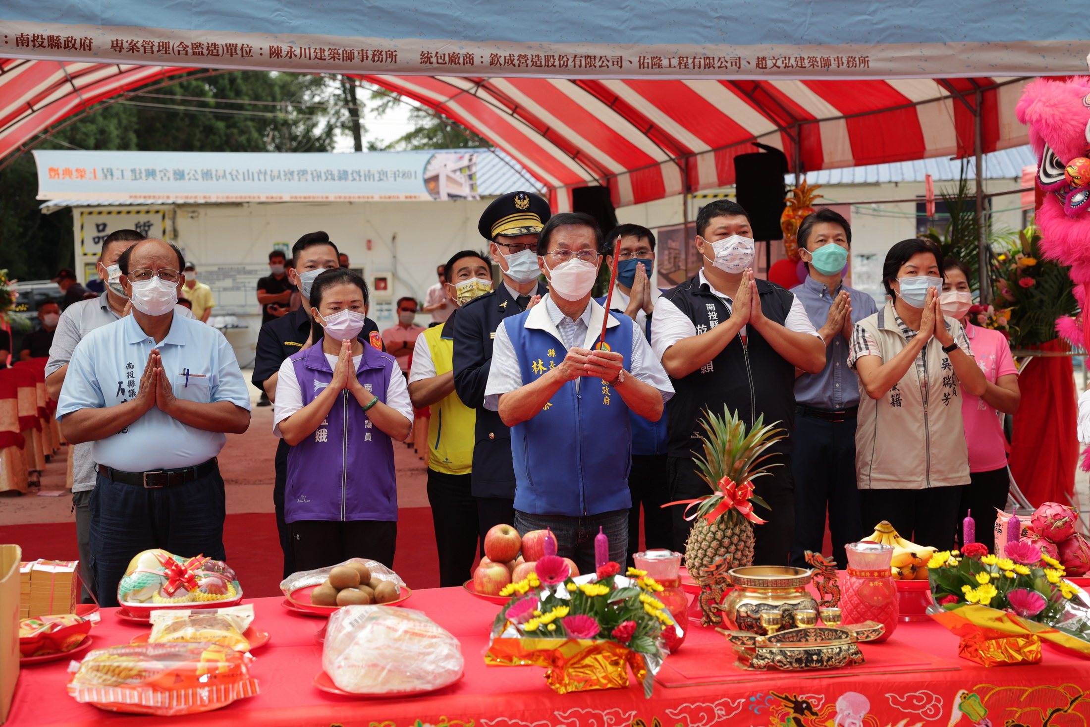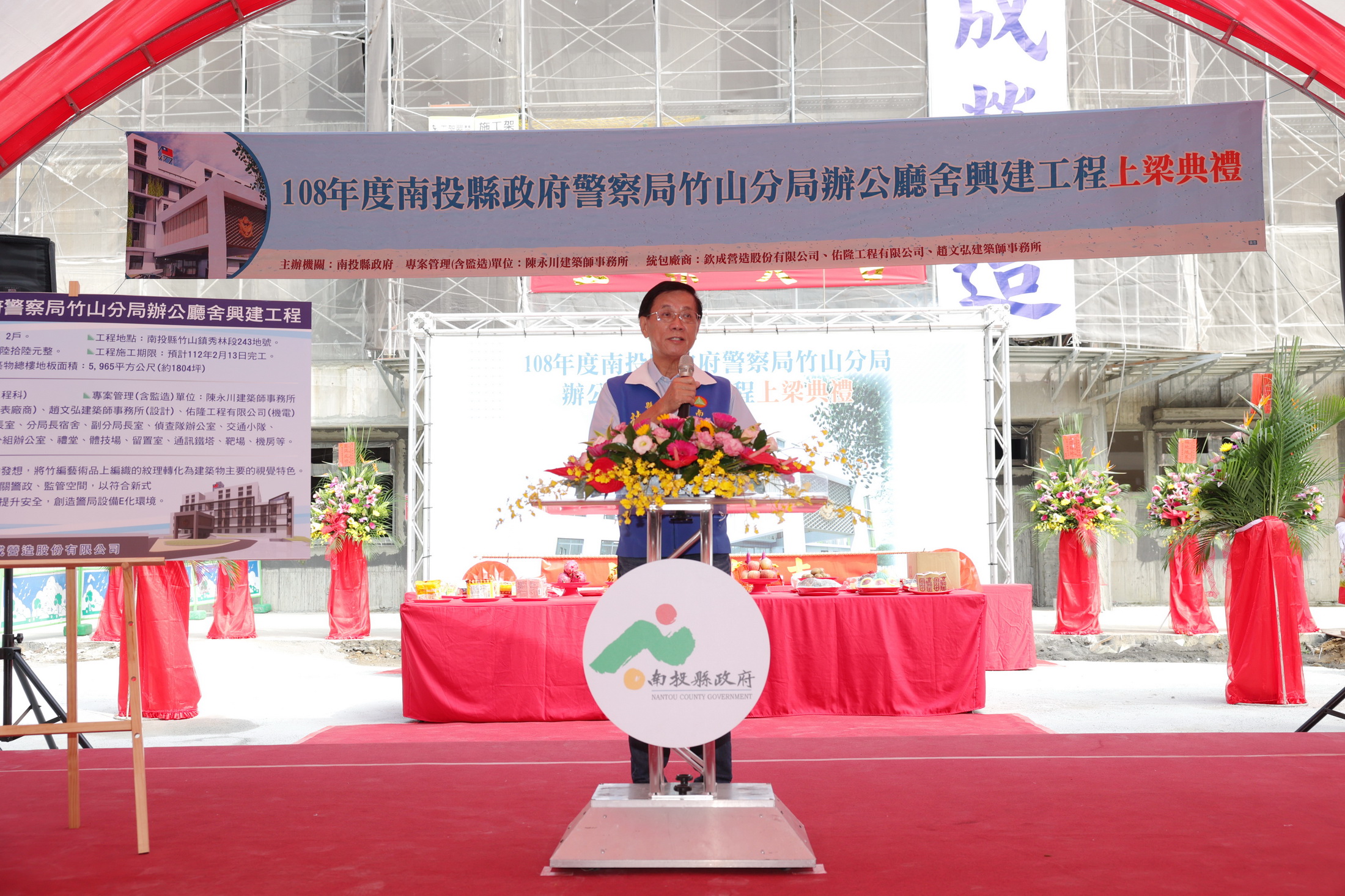 林縣長表示,竹山分局原有辦公廳舍興建於民國76年,不僅使用多年,九二一地震也導致建築物部分損壞、結構受損、多處漏水,影響辦公品質,在議會支持下,獲國有財產署同意用以地換地的方式,交換中興新村土地與林務局竹山工作站土地,工程於110年7月中動土開工,目前結構完成,進行上樑儀式,預計112年2月中旬完工,感謝大力支持的議長何勝豐,讓警察同仁有更舒適的辦公環境,期許警方持續加強為民服務,為治安與交通奉獻更大的心力,讓南投縣更幸福美滿。