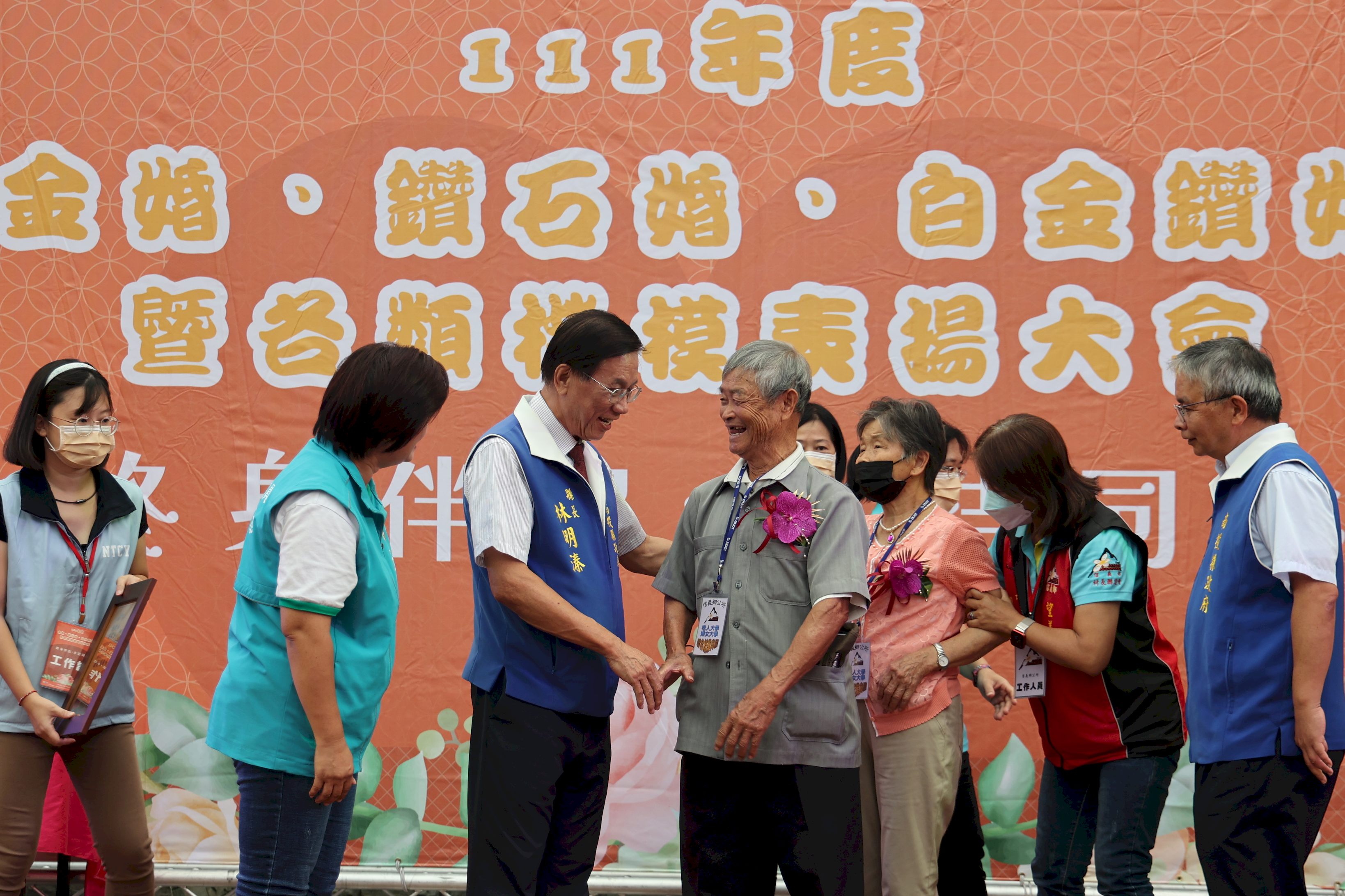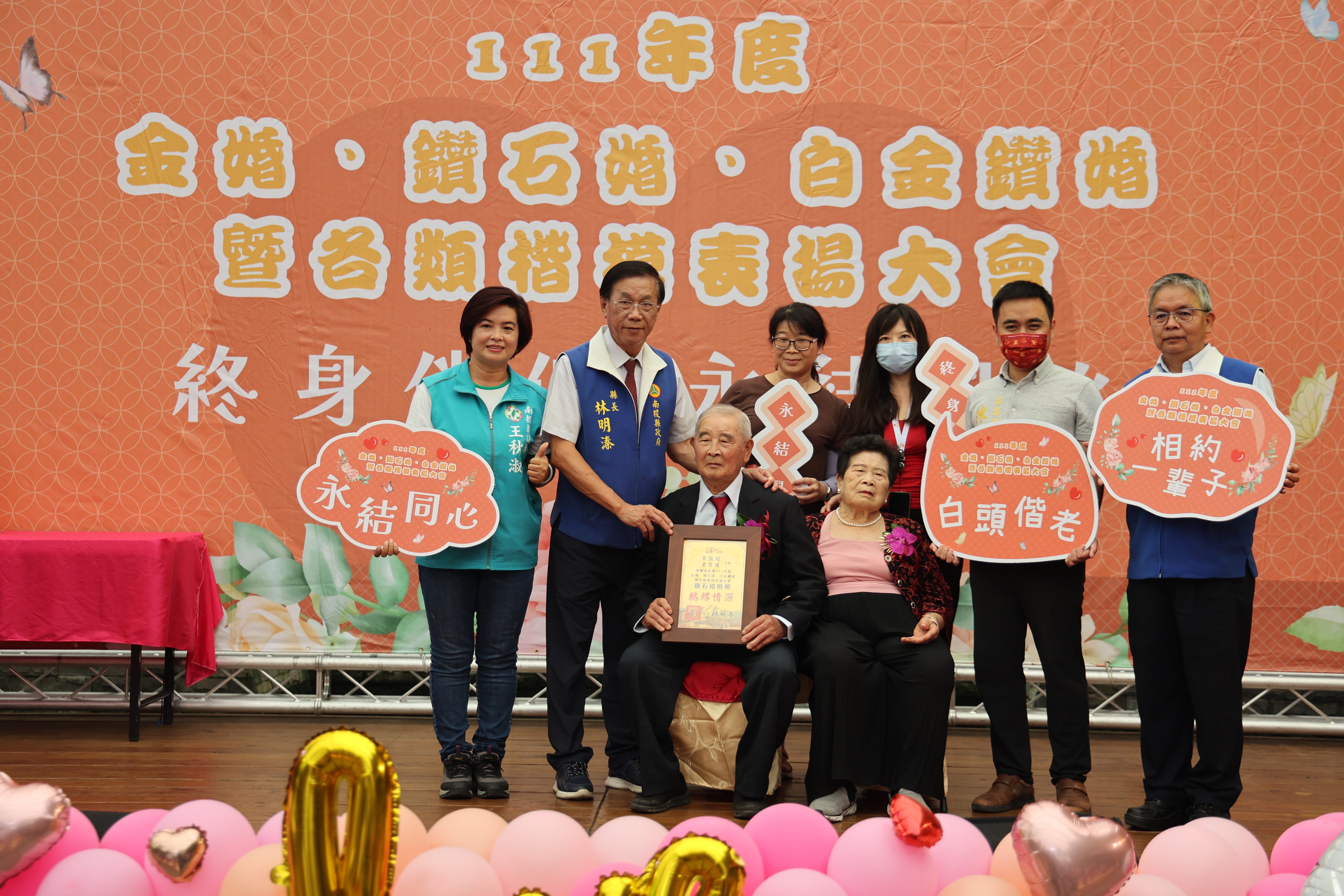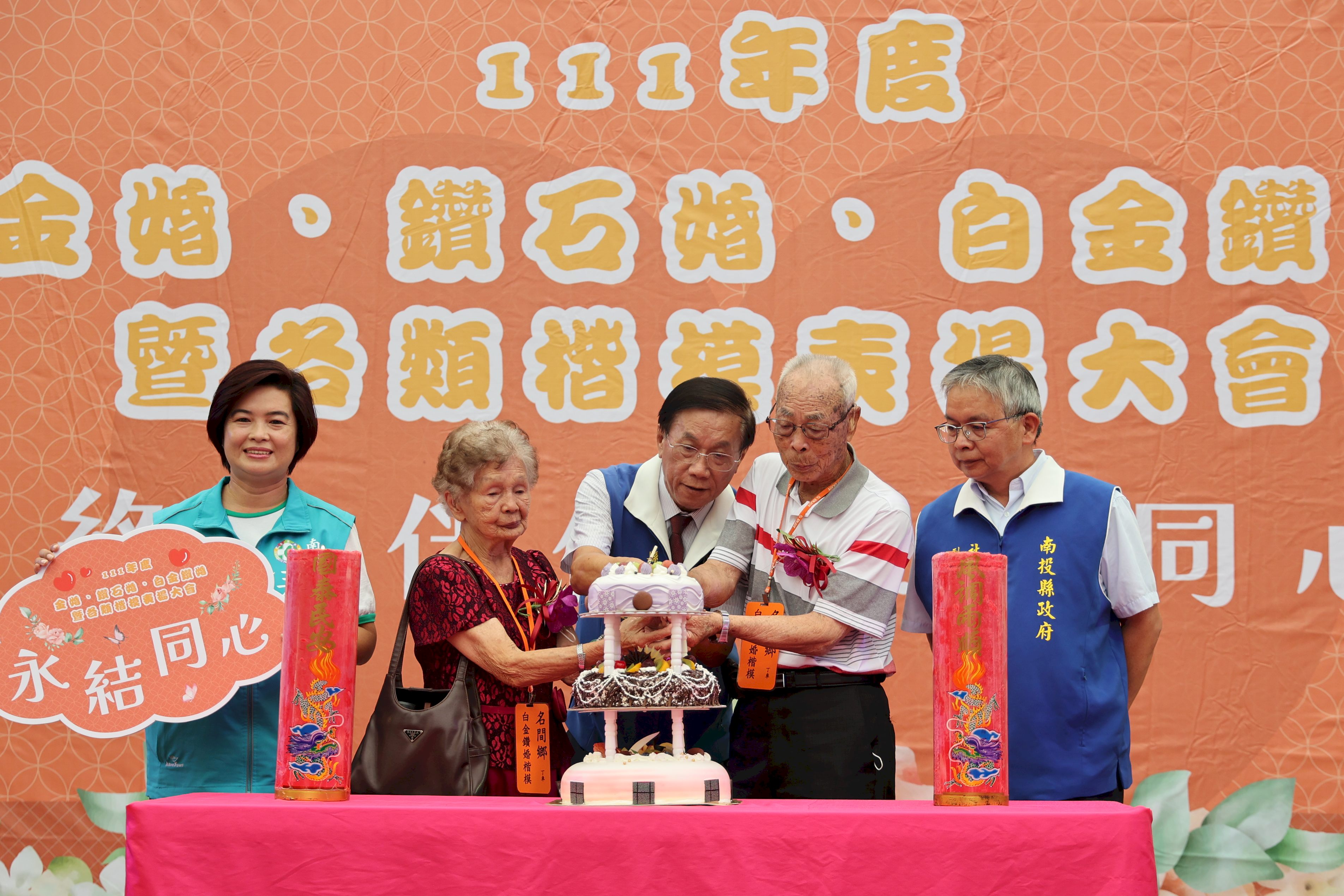 111年度南投縣金婚、鑽石婚、白金鑽婚暨長青、敬老、老人績優團體楷模,第二梯次南投、草屯、名間、水里、集集、信義等6鄉鎮市表揚大會,7日由縣長林明溱親自主持並頒獎。結髮70年高齡90歲的名間鄉陳宗英、陳林秀沼夫妻,在林縣長協助下代表點燃喜燭並喜切三層蛋糕與眾人同歡。林縣長更提醒大家夫妻相互體諒的重要,「就算是有歲啊,也不要忘了每天出門前先親一下另一伴,而且要持續天天這麼做!」 今年南投縣結婚滿50年金婚夫婦共有591對、結婚滿60年鑽石婚夫妻有339對、結婚滿70年白金鑽婚夫妻則有31對,縣府6、7日分兩梯次頒獎表揚共961對楷模夫妻,7日受獎的是來自南投、草屯、名間、水里、集集、信義等6鄉鎮市的金鑽石婚佳偶及長青等楷模,活動在精彩原住民歌舞及全場佳賓熱烈參加的韻健康帶動舞中揭開序幕,場面溫馨熱鬧。 代表點喜燭切蛋糕的名間鄉陳宗英、陳林秀沼都已高齡90歲,老阿公被要求攬著結髮70年的阿嬤合照時,還靦腆的伸長手臂像小伙子一樣好像不知手該怎麼擺才好,令觀者不禁莞薾,陳林秀沼阿嬤說,兩夫妻幾乎不曾吵架,更知道珍惜老來還能相互照顧的可貴,很開心參加縣府這麼貼心辦的活動還能從林縣長手中拿到白金鑽婚表揚獎牌。 林縣長指出,他已72歲,當8年縣長,從5年前開始補助縣內長輩裝假牙,一共花費超過1億7,000萬元,就為了減少老人家因牙口不好拖垮健康問題發生,敬老愛心卡免費乘車額度更從上任後就從每月300元提高為1,000元,還不斷克服困難,讓老人家除了搭縣內公車外,如願能以敬老愛心卡搭長途客運,12月起更能和台中市一樣每天最高341元,享受刷卡搭乘計程車的福利,除了照顧老人,他8年來提供縣內8萬孩子免費學生午餐,足足花費23億元毫不手軟,就是要讓下一代午餐吃得飽吃得飽。 林縣長自豪的說,他在推動建設的同時,還減債75億元,讓縣庫債務從103年的167億,減少到今年的92億元;這些都要靠許淑華等力挺縣政的立委,幫助縣府提計畫報中央,拿頂多10分之1的配合款,換到金額龐大的中央補助建設經費。更重要的是他當縣長推動五大園區產業新都大建設,不僅增加就業機會,更為縣庫帶來大筆進帳,光是最近的福興溫泉區開發進帳10億,草屯手工業園區進帳至少30億元,就能留給下任縣長多達40億元的建設自有財源。 林縣長說,看到這麼多金、鑽石婚、白金鑽婚的前輩伉儷,他身體力行自我要求夫妻相處你進我退的原則,我更要提醒夫妻不論年輕年長,都應該做到每天出門前回家後,都親一下另一伴,相信每天都這麼做,就會有更多白頭偕老的夫妻歡慶金婚、鑽石婚、白金鑽婚。
