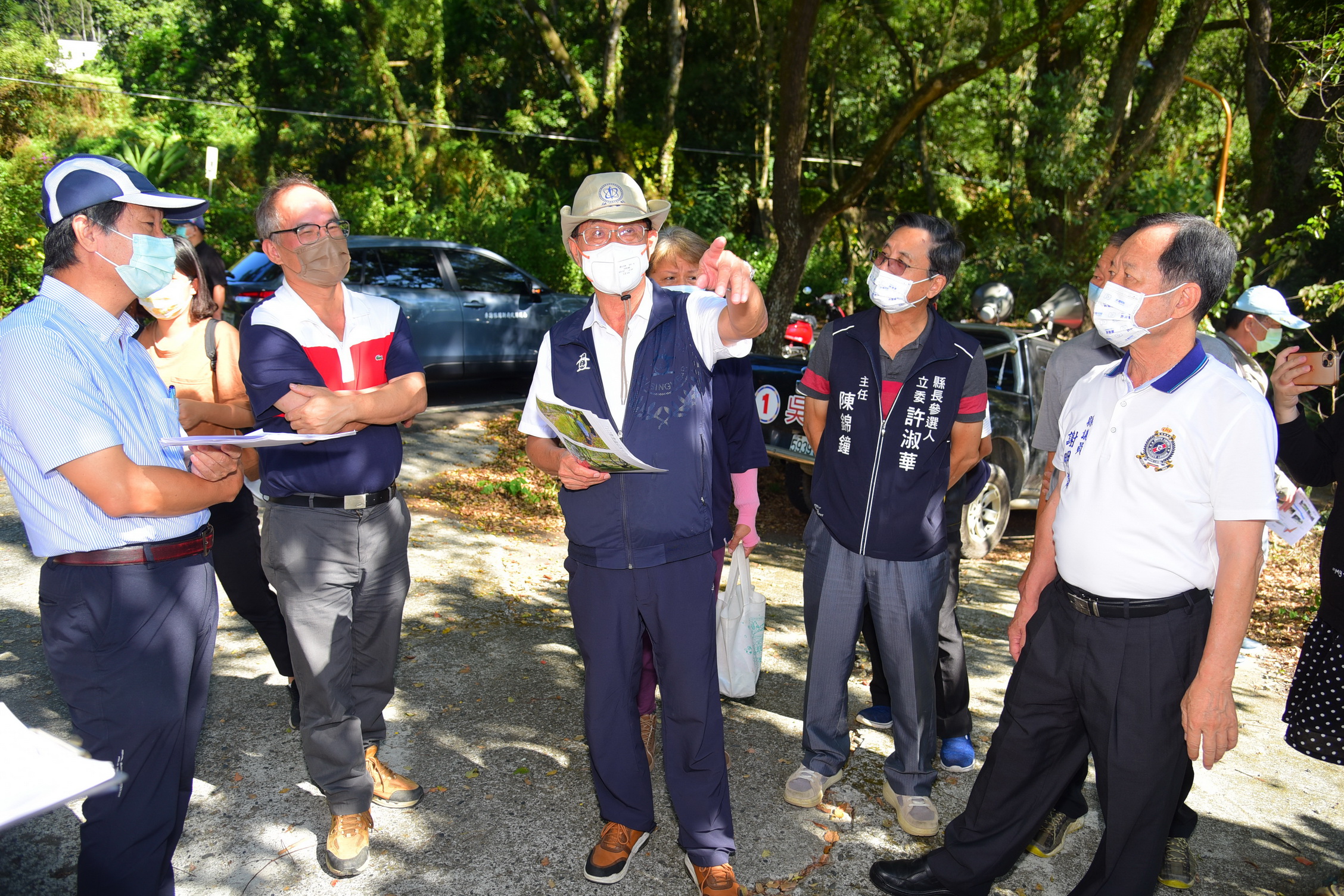 稍後,林縣長也前往鎮國寺聽取投27線第2、3期道路改善工程遊覽車行車安全評估簡報,並實地瞭解道路現況及彎度、坡度,林縣長在工區現場與工程顧問公司技士討論改善方案及工法,林縣長表示,投27線是集集鎮通往中寮鄉廣興村的聯絡道路,自鎮國寺到中寮段,全線因路幅狹小,部分路段彎度大、坡度陡峭,不利遊覽車通行,為利農產運輸及觀光發展,有改善必要,縣府研議路幅狹窄路段將採懸臂式工法拓寬,急彎處以改善半徑方式減少彎度,陡坡路段將採填土方式降低道路高低差因應,待工程顧問公司設計完成後,即可發包改善,第一至三期工程完成後,全線路幅將達6至7.6公尺,遊覽車可通行無虞,農產運輸更安全,觀光發展可期。