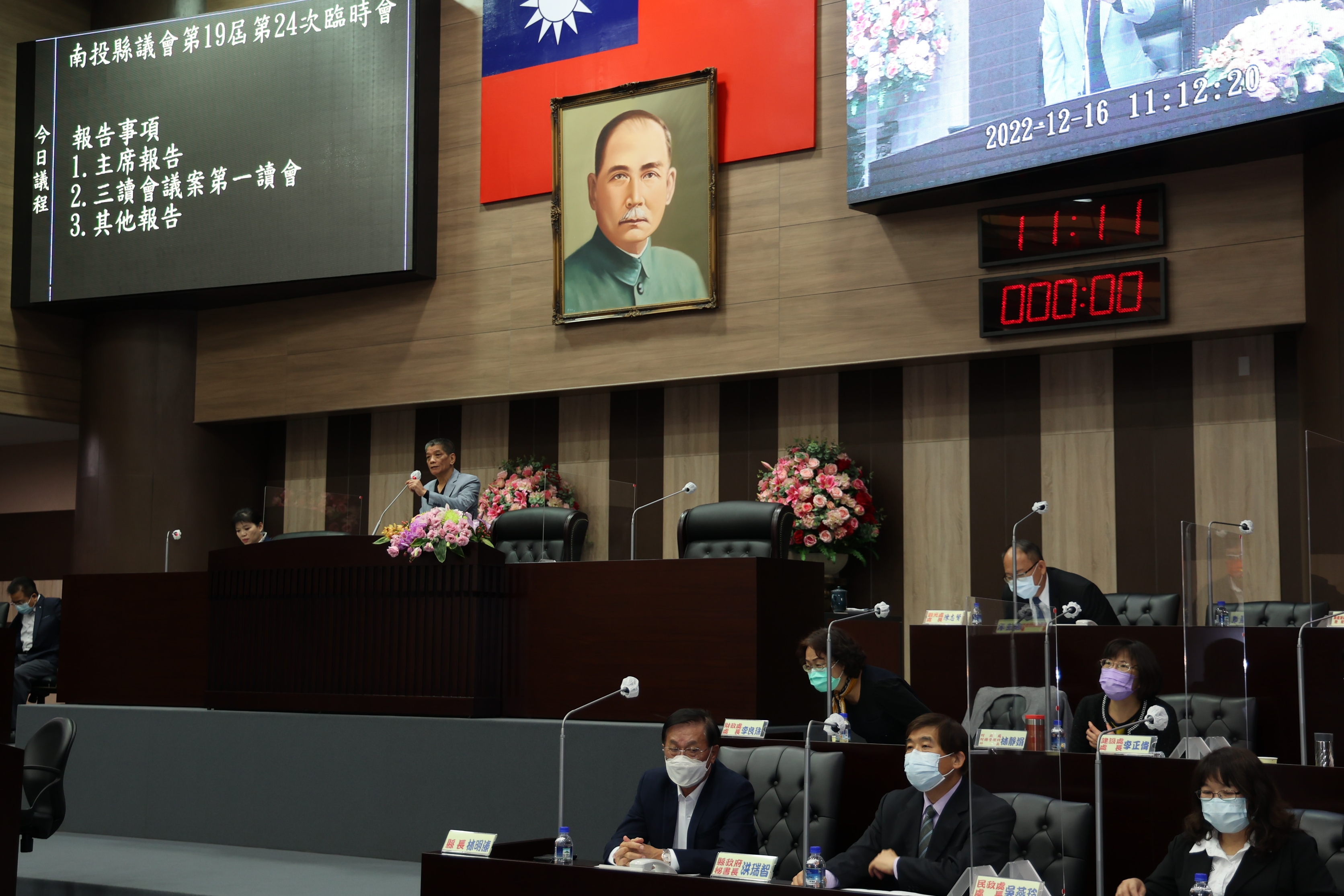 16日的南投縣議會第19屆第24次臨時會由議長何勝豐主持開議,何議長懇切期勉縣府團隊在本屆最後一次臨時會後,持續群策群力推動下屆新縣長各項政見造福南投鄉親,隨後完成三讀會議案第一讀會及其它臨時會提案的審查議案交付程序。