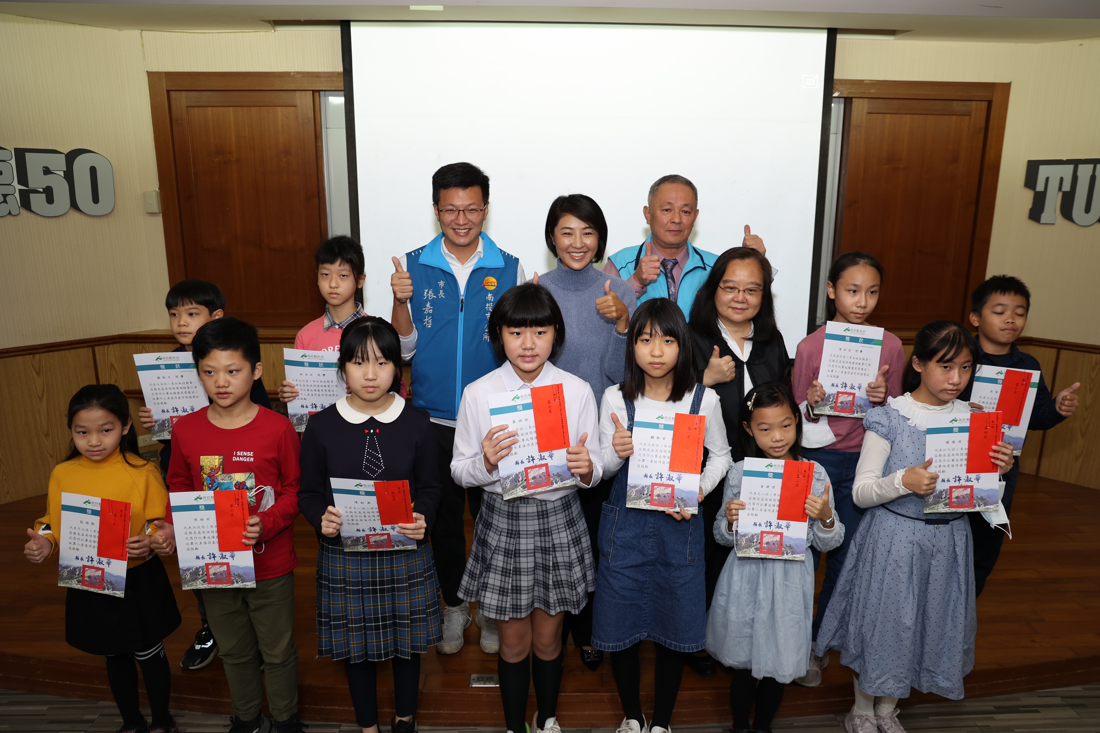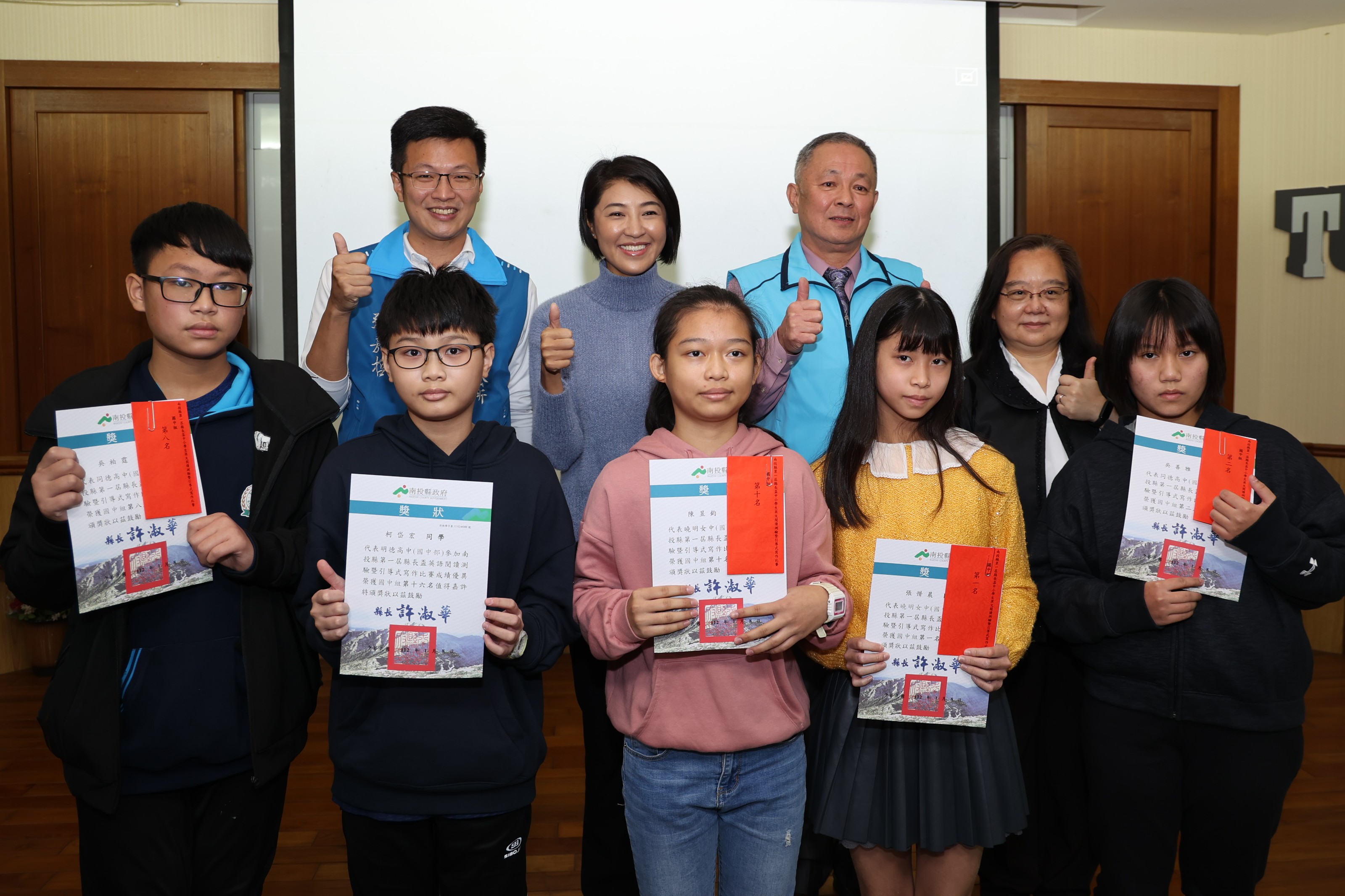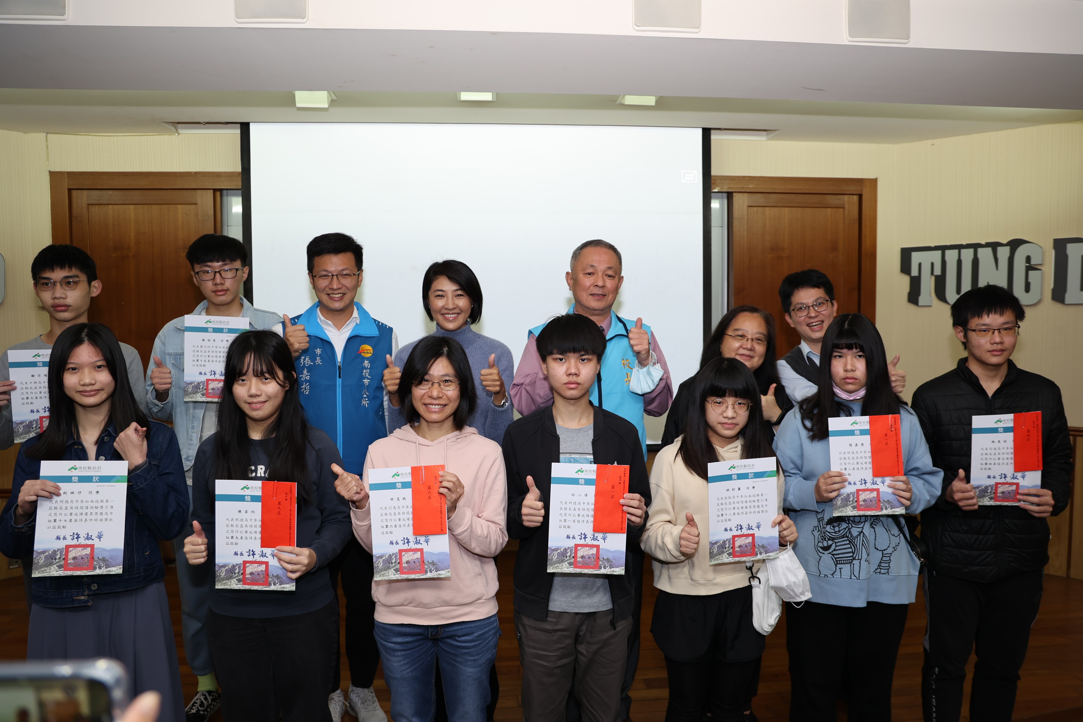 南投縣政府指導、同德高中主辦的南投縣第一屆縣長盃中小學生英文閱讀測驗暨引導式寫作比賽,吸引來自中部地區 147位學生參賽,8日舉辦隆重頒獎典禮,縣長許淑華親自頒獎給各組獲得前20名的學生,並宣布將推動鼓勵學生出國遊學提升國際競爭力的獎勵方案,俟教育處研妥具體辦法就會儘速實施。 縣府教育處指出,同德高中辦理的南投縣第一屆縣長盃中小學生英文閱讀測驗暨引導式寫作比賽,比賽項目囊括閱讀測驗20题及引導式寫作1大题,各佔50%評比,分國小、國中及高中三組競賽。秉持比賽公開、公平原則,比賽試題及評分均委由彰化師範大學辦理。各組評比前20名者,由縣長許淑華於8日的頒獎典禮上,頒發獎狀及獎金以茲鼓勵。 8日的頒獎典禮包括縣長許淑華、縣議員簡千翔、南投市長張嘉哲、教育處長王淑玲、同德高中董事長徐德香、秘書謝秀津、校長童建文、副校長謝佩君都出席,獲獎學生有國小組第一名南投縣光華國小顏詠安、第二名虎山國小童璵倩、第三名台中育仁國小孫紹齊等20人;國中組有第一名台中市曉明女中張惜晨、第二名南投縣同德高中吳善雅、第三名台中市豐東國中李宥蓁等20人;高中組第一名台中市明德高中林心傳、第二名南投縣普台高中蔡孟宸、第三名南投縣普台高中羅先偉等20人。 獲得國中組第一名的張惜晨分享了學習英文的經驗,她說,興趣很重要,這次獲將尤其讓她高興的有更大動力去學習,大量閱讀很重要,她就是熱愛閱讀英文課外書籍,也培養出了不錯的閱讀和寫作能力。 縣長許淑華表示,英文閱讀與表達能力接軌全球化的基石,期待透過競賽,給予各校學生切磋學習與成長的舞台,期能提升學生英語文學習動機,亦營造校際相互學習的氛圍。特別感謝同德高中願意拋磚引玉舉辦競赛,也感謝各校英語教師及家長的辛苦付出陪伴,讓學生有機會一展長才,更期許這群學生未來能持續光文能力,為臺灣邁向全球化與國際化盡一份,也期待同德高中將這項縣長盃英文比賽持續擴大辦理。 許縣長指出,她在政見中就列入鼓勵學生出國遊學的獎勵方案,大致分為兩大對象,分別是針對用心學習的優秀學生,縣府將提供出國遊學學費及生活費的經濟支持,讓他們不必擔心要兼著打工賺取生活費學費,而可以更專心學習;其次則是針對以增廣見聞及提升語言能力的孩子,縣府將會鼓勵他們透過打工遊學達成出國進修的心願,相關具體辦法正由教育處研擬中,很快就會落實推動,就是希望能讓南投的孩子在國際上也能不落人後的競爭上進。