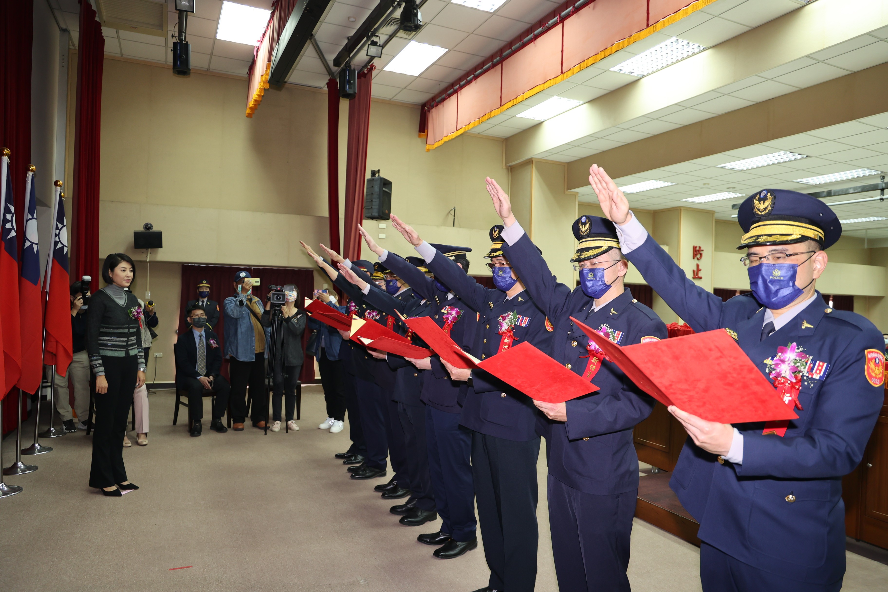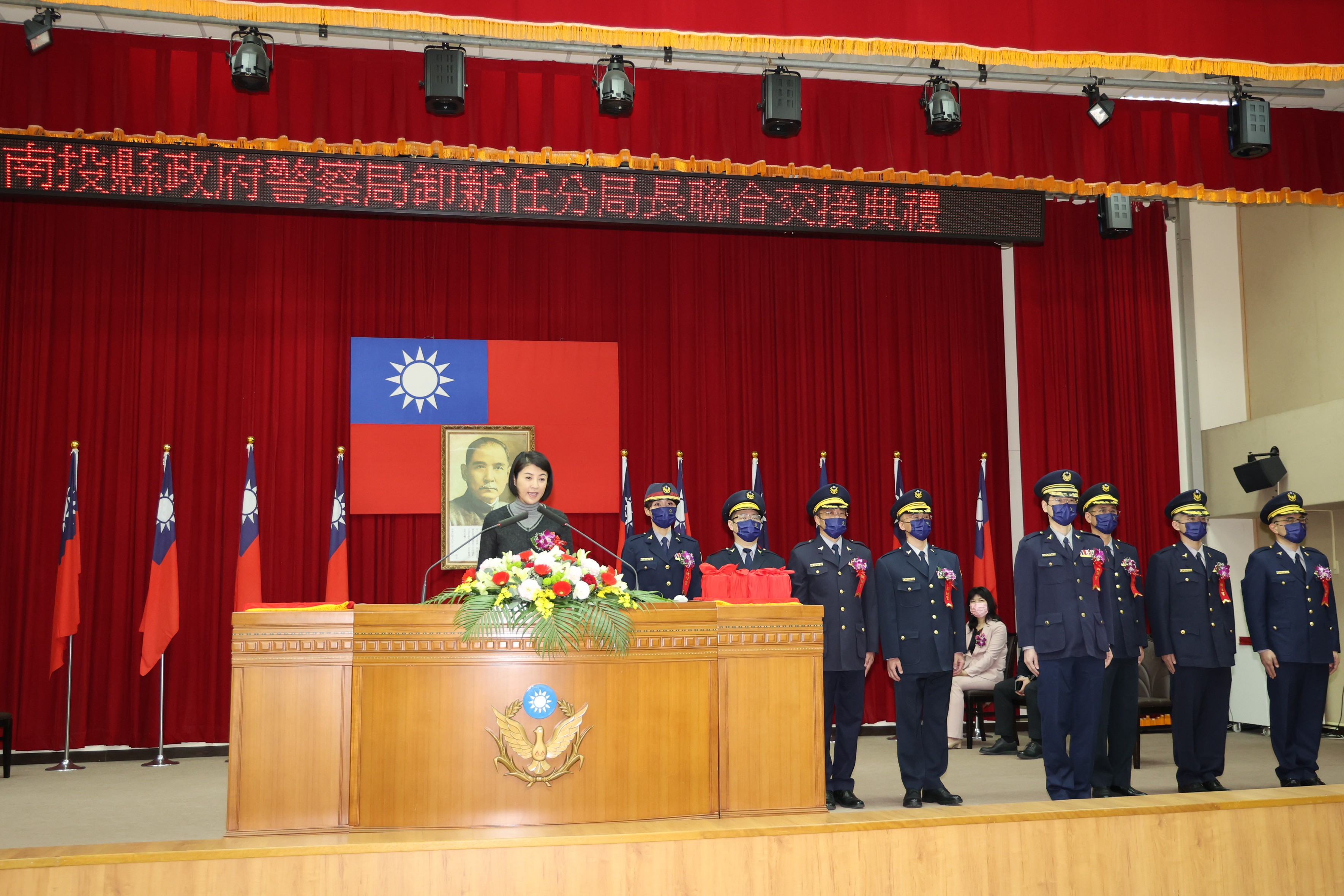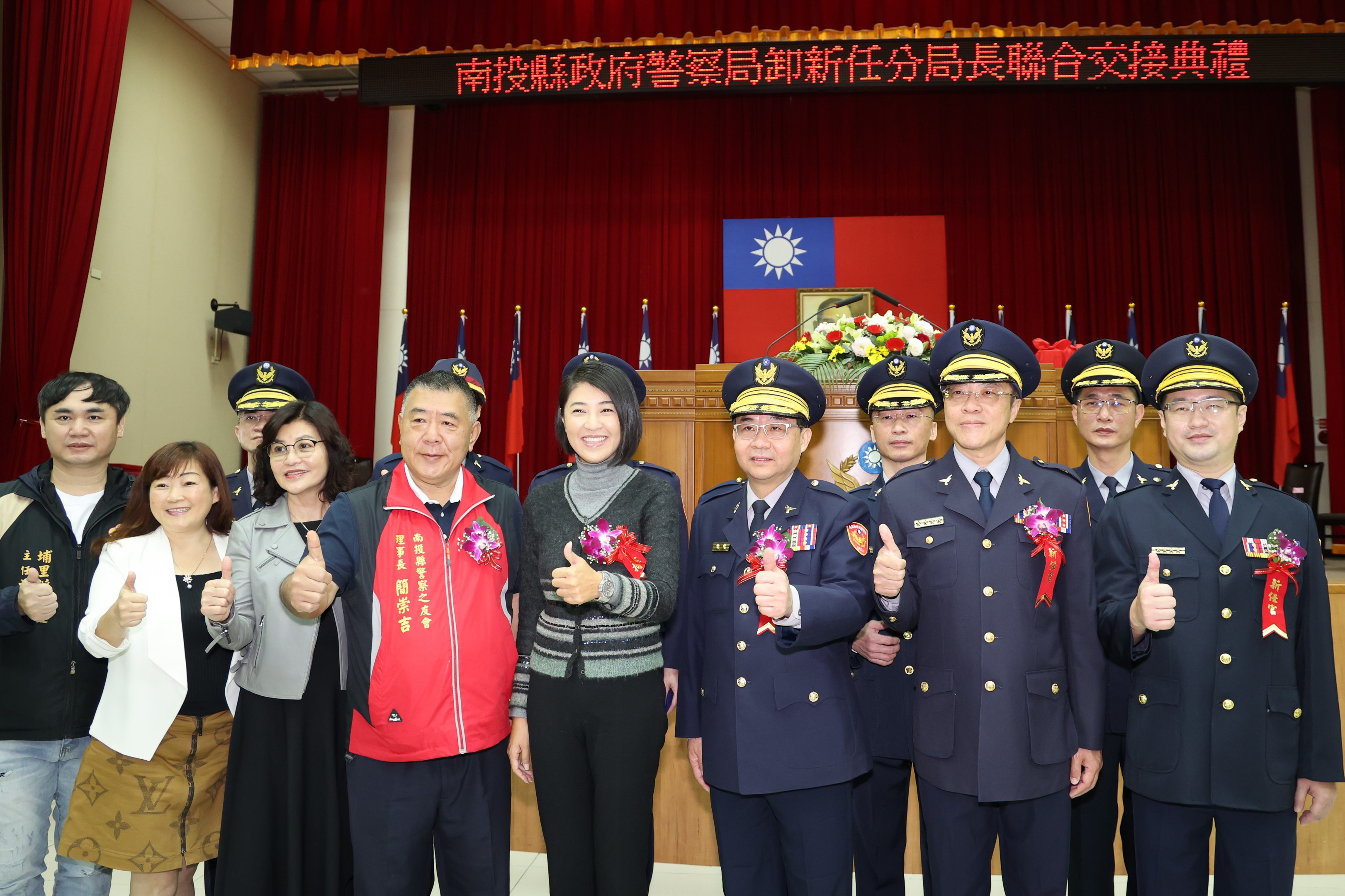 依據內政部警政署6日發布的重要警職調整案,南投縣政府警察局異動人員有主任秘書、督察長暨南投、草屯、埔里、竹山、中興、集集、仁愛及信義分局分局長等共10名。9日上午縣長許淑華親自主持於縣警局6樓大禮堂舉辦卸、新任分局長聯合交接典禮,擔任監誓人並為晉升2線4星的新任分局長授階。 聯合交接典禮,縣議員宋懷琳、縣議會秘書長李孟珍、地方檢察署主任檢察官李俊毅、南投縣警友會理事長簡崇吉等貴賓都到場共襄盛舉,場面隆重,圓滿成功。 主持聯合交接典禮的許縣長先為5位晉陞的新任分局長授階,並逐一見證8個分局卸新任分局長交接印信,也擔任新任分局長宣誓就職的監誓人,許縣長也逐一介紹新任縣警局主任秘書、督察長及8位分局長的經歷。 這次南投縣警察局異動人員如下,新任主任秘書由本局南投分局分局長潘仕能陞任,新任督察長由彰化縣警察局彰化分局分局長王國陞任,新任南投分局長由本局埔里分局分局長胡淑淨調任、草屯分局長由本局中興分局分局長洪政崴調任、埔里分局長由本局仁愛分局分局長林威廷調任、竹山分局長由臺中巿政府警察局第二分局偵查隊隊長洪再德調任、中興分局長由基隆巿警察局第一分局副分局長侯興龍陞任、集集分局長由內政部警政署臺中港務警察總隊主任劉千祥陞任、仁愛分局長由臺中巿政府警察局第六分局組長林文智陞任、信義分局長由桃園巿政府警察局桃園分局組長戴志龍陞任。 許縣長指出,今天完成交接就任的縣警局異動人員,均自中央警察大學畢業,具豐富內、外勤經驗,能力獲上級長官及各界肯定,每位於任內工作表現優異,獲內政部警政署委予重任,期許就任新職後,能發揮所長,繼續推動南投縣治安、交通及為民服務工作;許縣長也肯定卸任幹部於南投縣任內的諸多貢獻,並強調說,相信在警察局長黃勝源的領導及全體警察同仁辛勞努力下,一定能讓民眾有一個治安平穩、交通順暢的全齡宜居新南投。