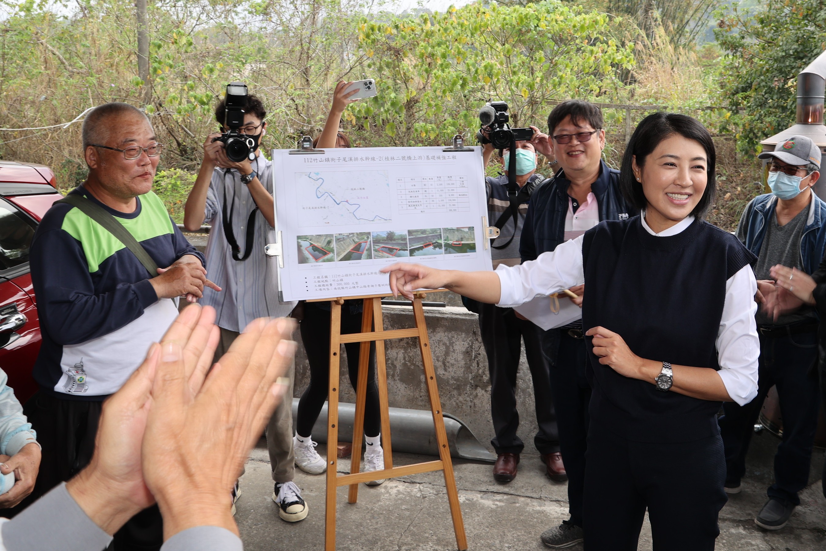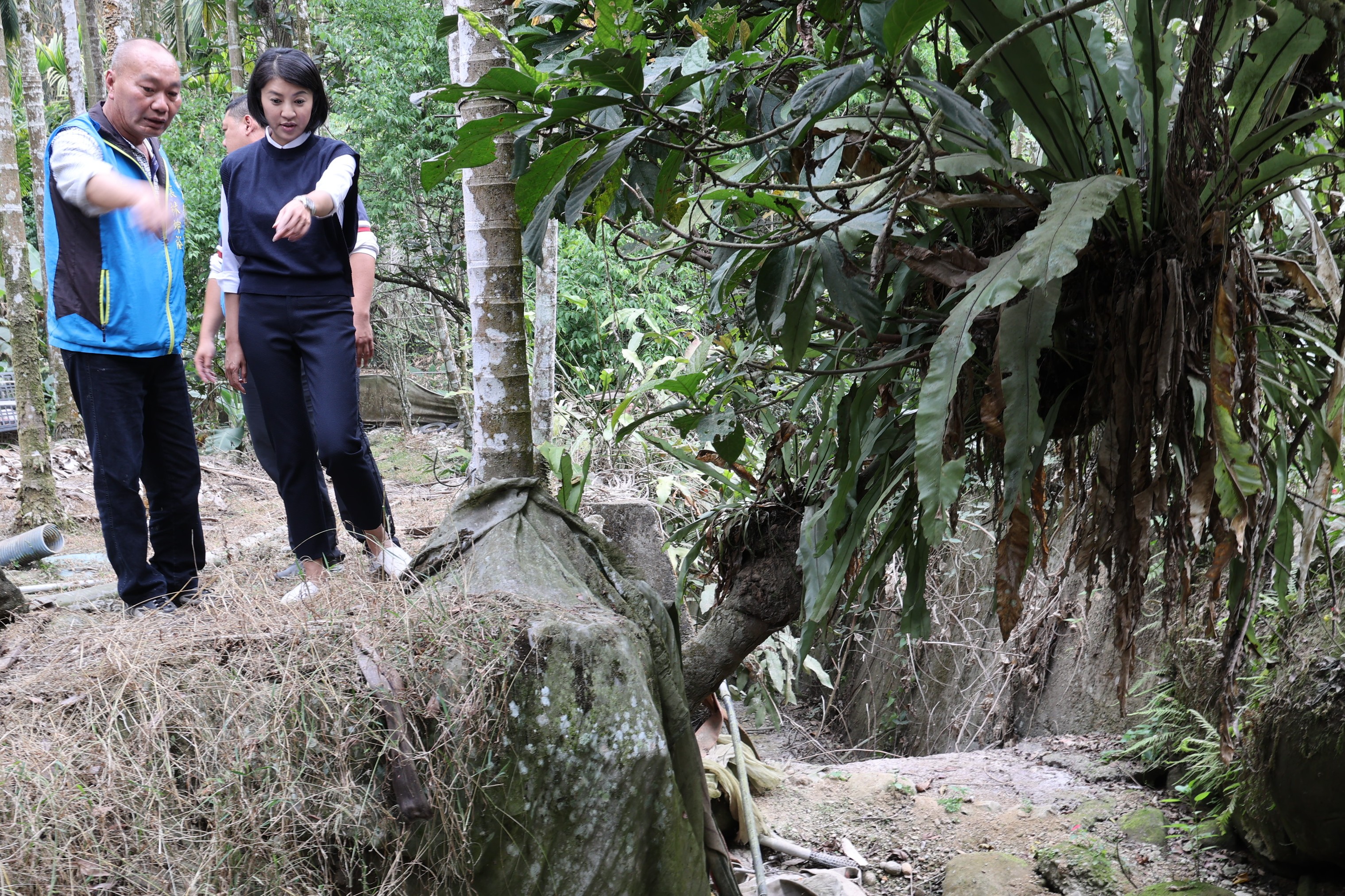 許縣長先到鯉魚里的圓尾坑野溪,勘查護岸缺口威脅到一旁農舍及農園的情形,當場同意動支144萬元,施設45公尺長,含基礎高達3公尺的護岸,來取代現有僅賴之前汛期搶修時以溪床土石堆疊的保護工,能夠徹底保護野溪旁數十公頃木瓜等農園的安全。
