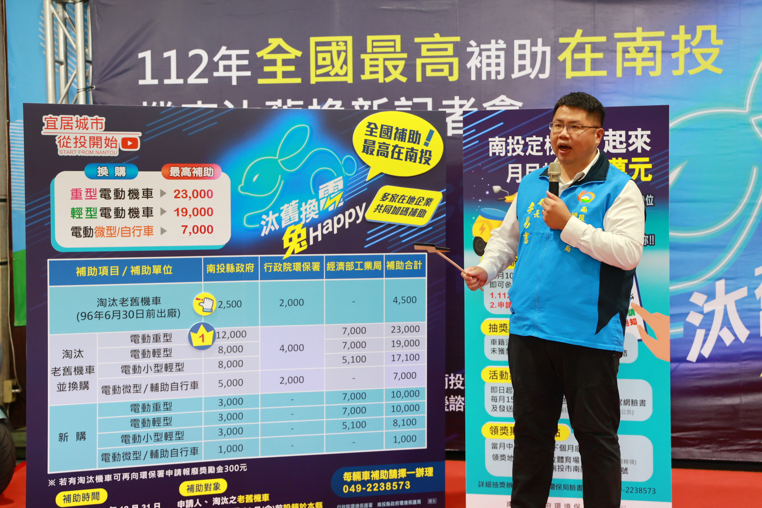 環保局長李易書也在會中簡報說明,南投縣今(112)年包括加碼汰舊換購電動機車補助,一般民眾每輛最高1萬2仟元及淘汰老舊機車加碼至每輛2,500元,為全國最高補助金額。另外環保署亦有2,000~4,000元、經濟部工業局5,100~7,000元等補助,提供更多元的換購選擇。此外,新購電動機車也有補助,每輛最高補助3,000元,歡迎民眾把握今年推出換、新購電動二輪車補助優惠方案,響應淨零排放又可領補助。