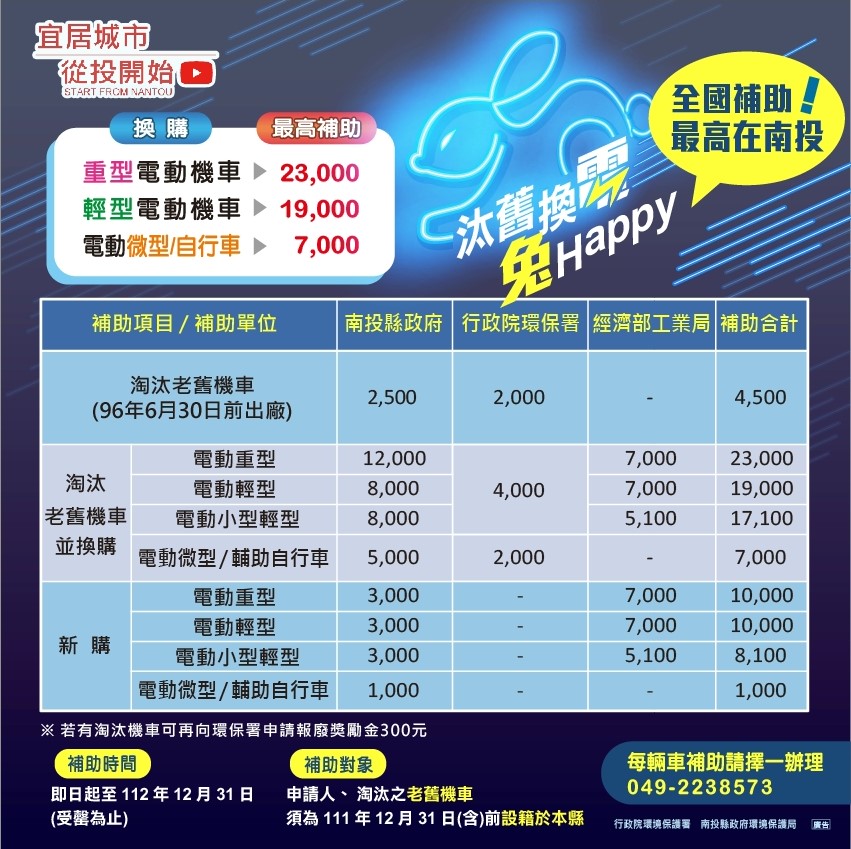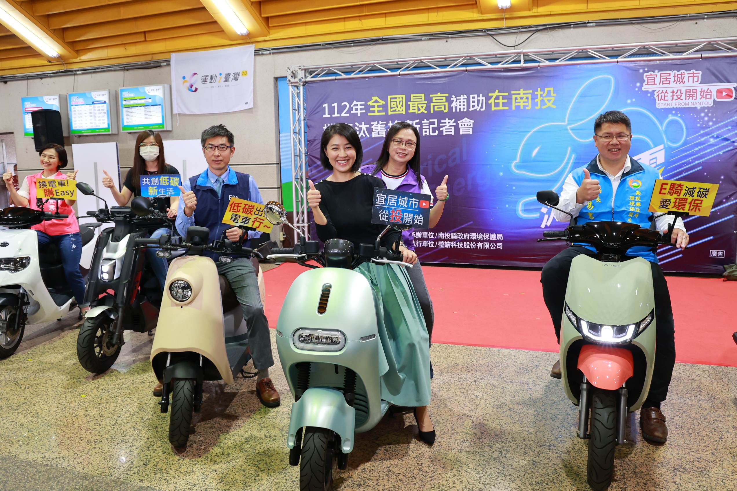 南投縣政府積極推動運具電動化,為減輕民眾購車負擔,今年加碼汰舊換購電動機車補助,一般民眾每輛最高12,000元及淘汰老舊機車加碼至每輛2,500元補助,加上環保署及經濟部的補助,最高一台可補助23,000元,縣長許淑華呼籲民眾踴躍汰換老舊機車換新購電動機車,減少空污,省錢、節能又環保。