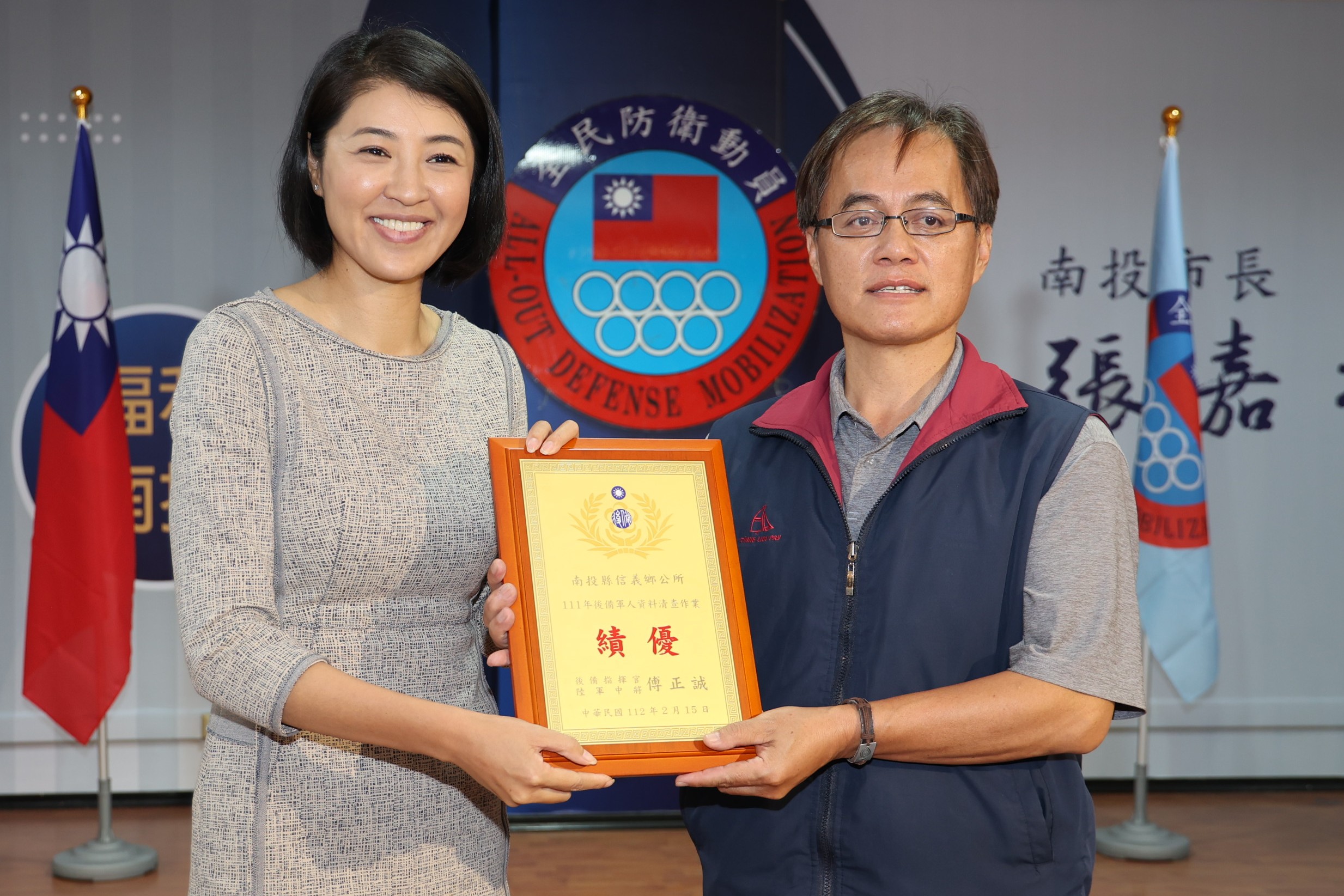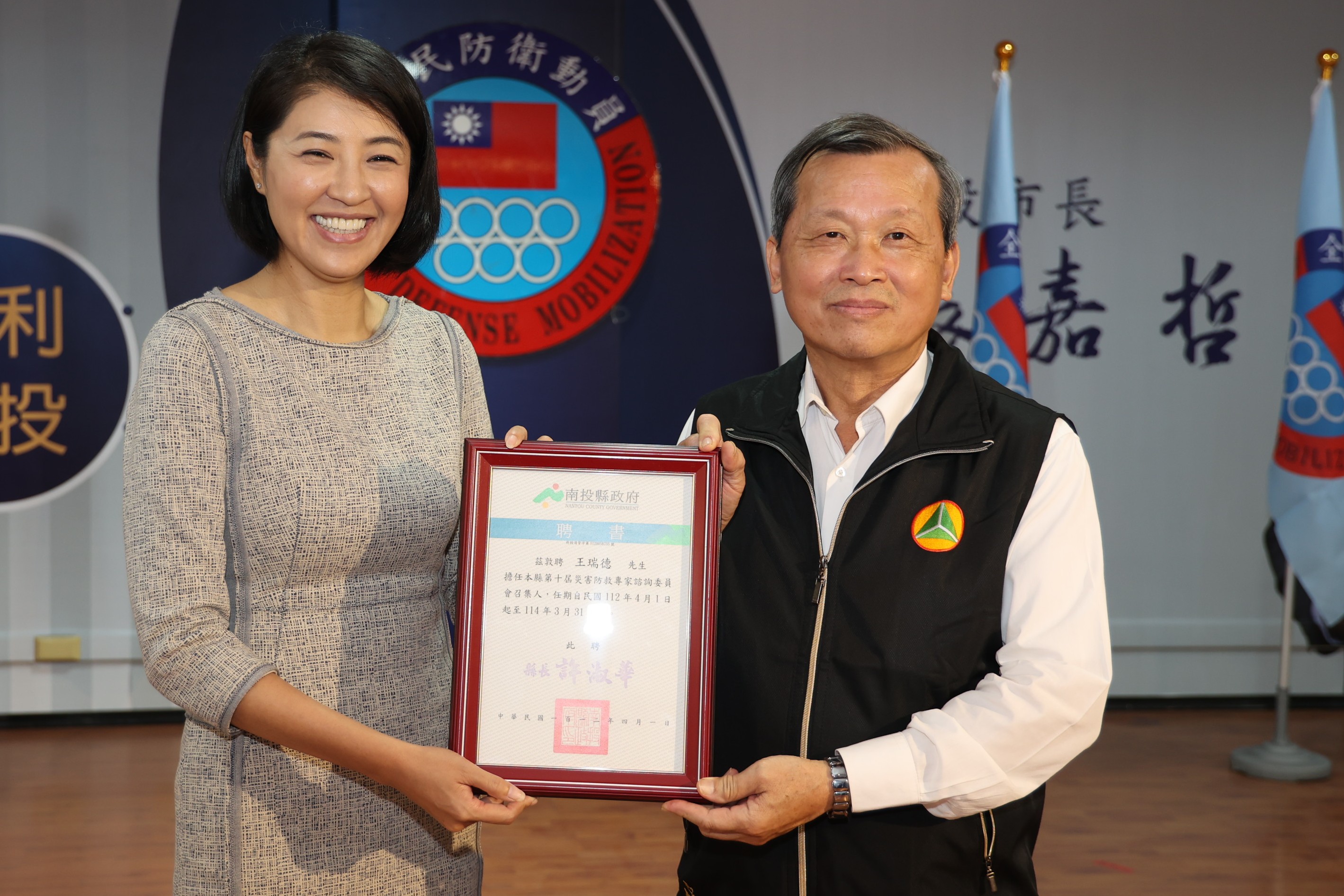 許縣長也頒獎給111年後備軍人資料清查績優役政單位的信義鄉公所,112年度警察分局動員業務輔訪績優單位南投、草屯及中興分局。許縣長也頒發全民戰力綜合協調會報新任委員聘書,包括縣警局長黃勝源、新聞及行政處長蔡明志、民政處長林琦瑜、教育處長王淑玲、工務處長簡青松、計畫處長邱紹偉、地政處長唐仁梂、南投市長張嘉哲、集集鎮長吳大村、名間鄉長陳翰立、國姓鄉長邱美玲、水里鄉長葉銘豐、仁愛鄉長江子信、公路總局第二區養護工程處長謝俊雄、南投工務段長孫文昌、國防部軍備局第209廠廠長黃教展。同時也頒發新聘副縣長王瑞德擔任南投縣第10屆災害防救專家諮詢委員會召集人,及草屯佑民醫院院長王斯弘等21名委員證書。