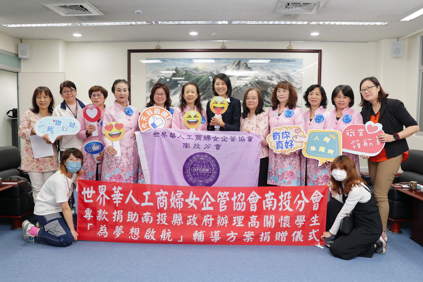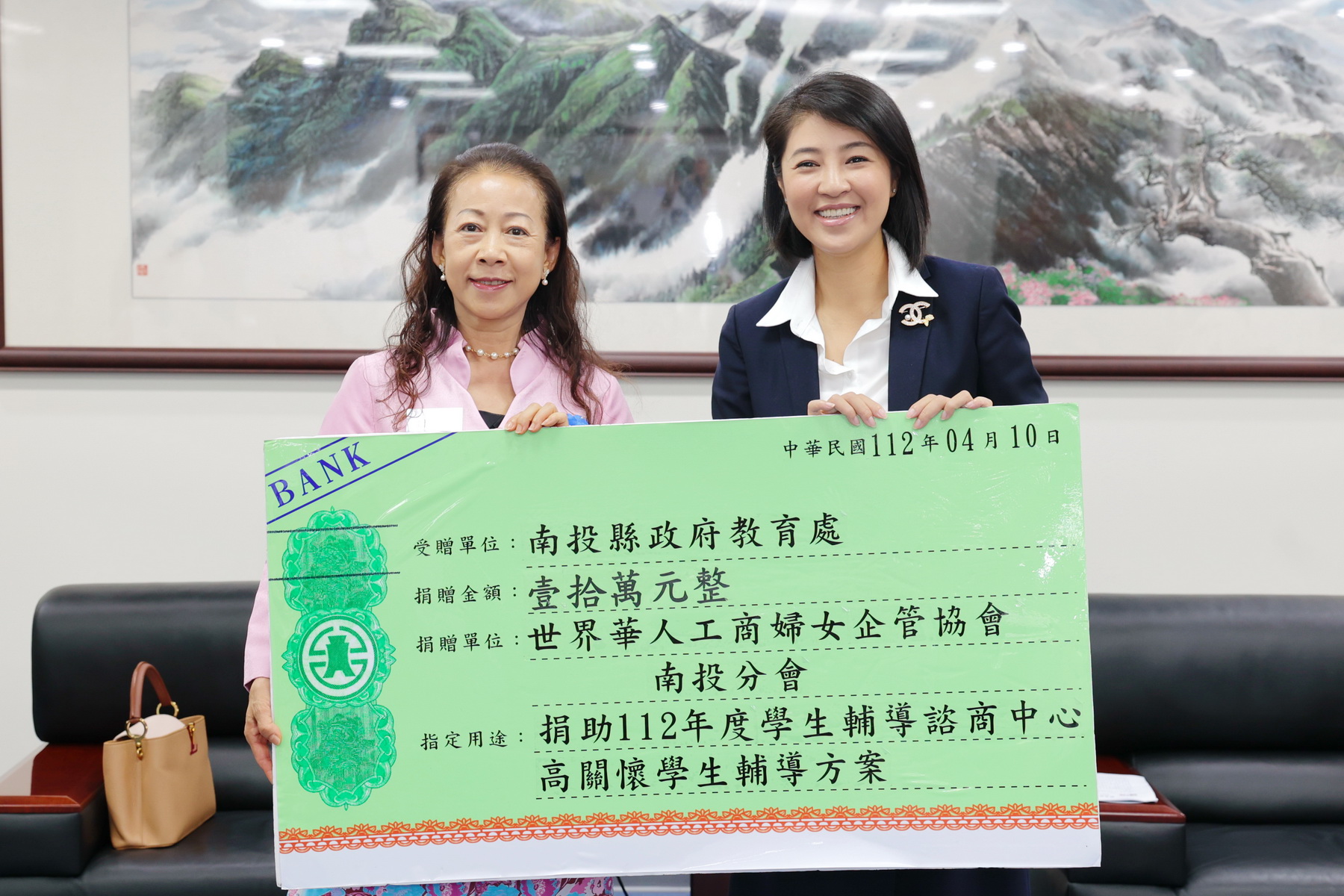 縣長許淑華上任後致力發展教育,除了提高教育資源,也與許多民間團體合作。為了協助縣府幫助弱勢兒少,世界華人工商婦女企管協會南投分會捐贈新台幣10萬元,用於執行「為夢想啟航」方案,許縣長10日代表受贈並致贈感謝狀,感謝協會與縣府攜手協助國中高關懷學生提前探索生涯,為偏鄉兒少打造幸福願景。   南投縣政府教育處學生輔導諮商中心辦理的多元化生涯課程「為夢想啟航」方案,是結合業界提供學習適應欠佳青少年的職場體驗教育活動,藉由親身體驗,發掘與探索自我生涯定向,並辦理成果發表,提供參與學生展現學習成果的舞台,為自己的人生夢想啟航,執行成果廣受好評,此次捐款用於專案擴大執行,預計將會有300人次青少年受益。   許縣長表示,她上任後,執行代理教師全年聘請、公共化幼兒園師生比調降等政策,希望提供更優質的教育品質,另編列青年出國獎助學金,整合青年留鄉、創業、就學、住宅、社會參與等各面向需求,讓南投的學子們在豐富多元的教育政策支持下實踐夢想。世華為一個女性社團,在南投縣具代表性,每位成員都非常傑出,成功的路上不忘回饋地方,感謝協會對弱勢照顧不遺餘力,是縣府推動社福教育最重要的民間夥伴之一。未來縣府除了編列經費外,仍會持續尋求更多外界企業及社團的資源,共同打造全齡宜居的幸福城市。   南投分會長謝孟娟說,世界華人工商婦女企管協會南投分會長期幫助弱勢,日前與會員們參訪南投縣教育處學生輔導諮商中心,看到中心長期執行「為夢想啟航」生涯輔導如此有意義的方案,讓他們非常感動,希望透過捐款以專款專用方式給予支持,為偏鄉兒少的生涯發展盡一份心力。