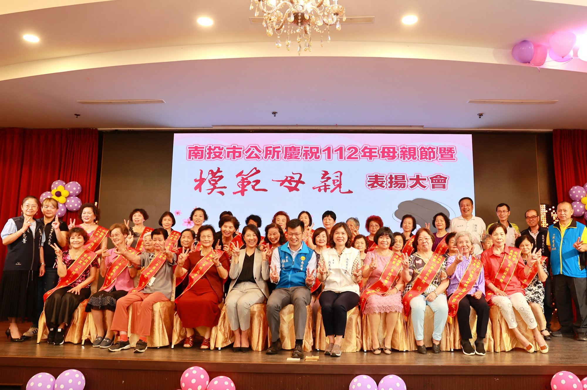 縣長許淑華6日前往南投市南島餐廳,分別參加由南投市公所及中寮鄉公所主辦的慶祝母親節暨模範母親表揚活動,並親切的與每一位模範母親恭賀問候,並合影留念。許縣長表示,媽媽們一輩子為家庭與工作辛勞付出,母愛偉大,每位模範母親都是婦女典範,值得我們學習。