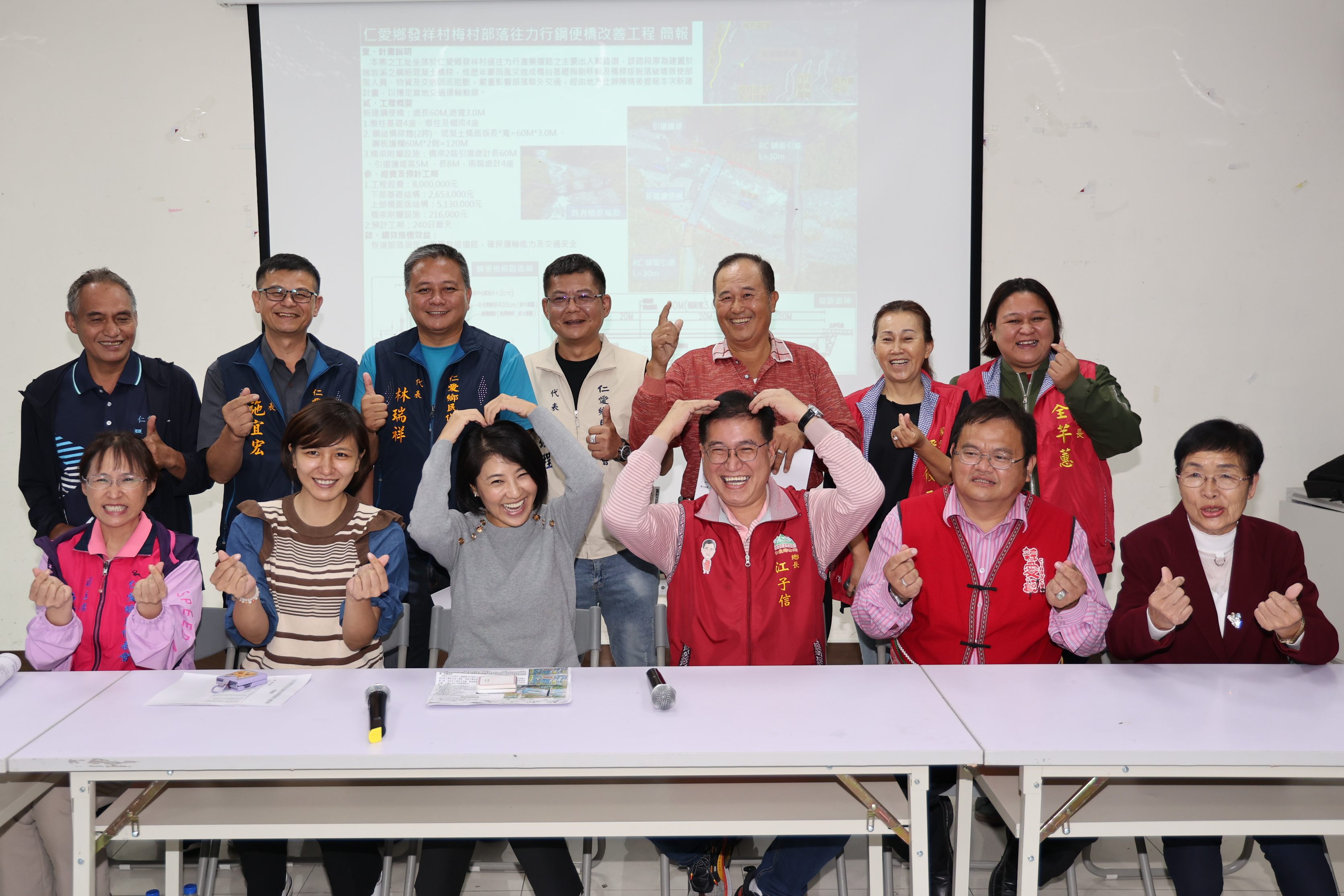 另外,仁愛鄉長江子信特別提報有關發祥村紅香溫泉梅村部落連通投89線的道路,因跨瑞岩溪的混凝土橋不勘豪雨溪洪沖刷,早已塌損導致交通中斷多年,經地方積極爭取,鄉公所已完成新建鋼便橋的初步測設,預計將施設四座橋墩的鋼便橋取代舊橋,鋼便橋長60公尺寬3公尺,包括護欄、高5公尺長8公尺的兩端引道,所需經費達800萬元,估計工期需240天;許縣長指出,這座鋼便橋不僅可以徹底改善梅村部落連外交通的不便,更可以在投89線萬一發生狀況時,可以增加一條備用的替代道路,確保發祥力行翠巒等村眾多部落的連外安全暢行,雖然經費不少,但仍會責由工務處全力籌措經費早日促成鋼便橋的發包動工。